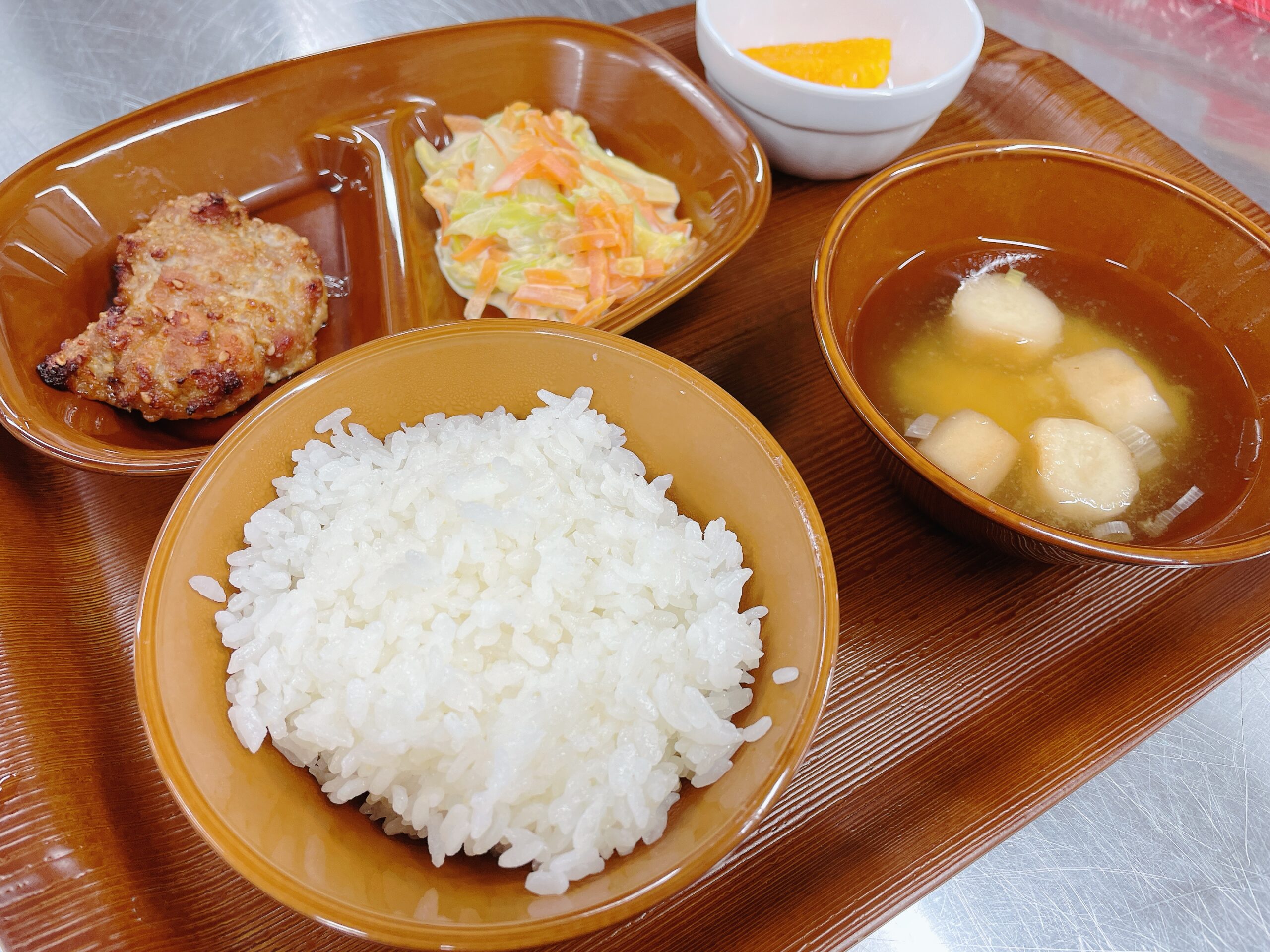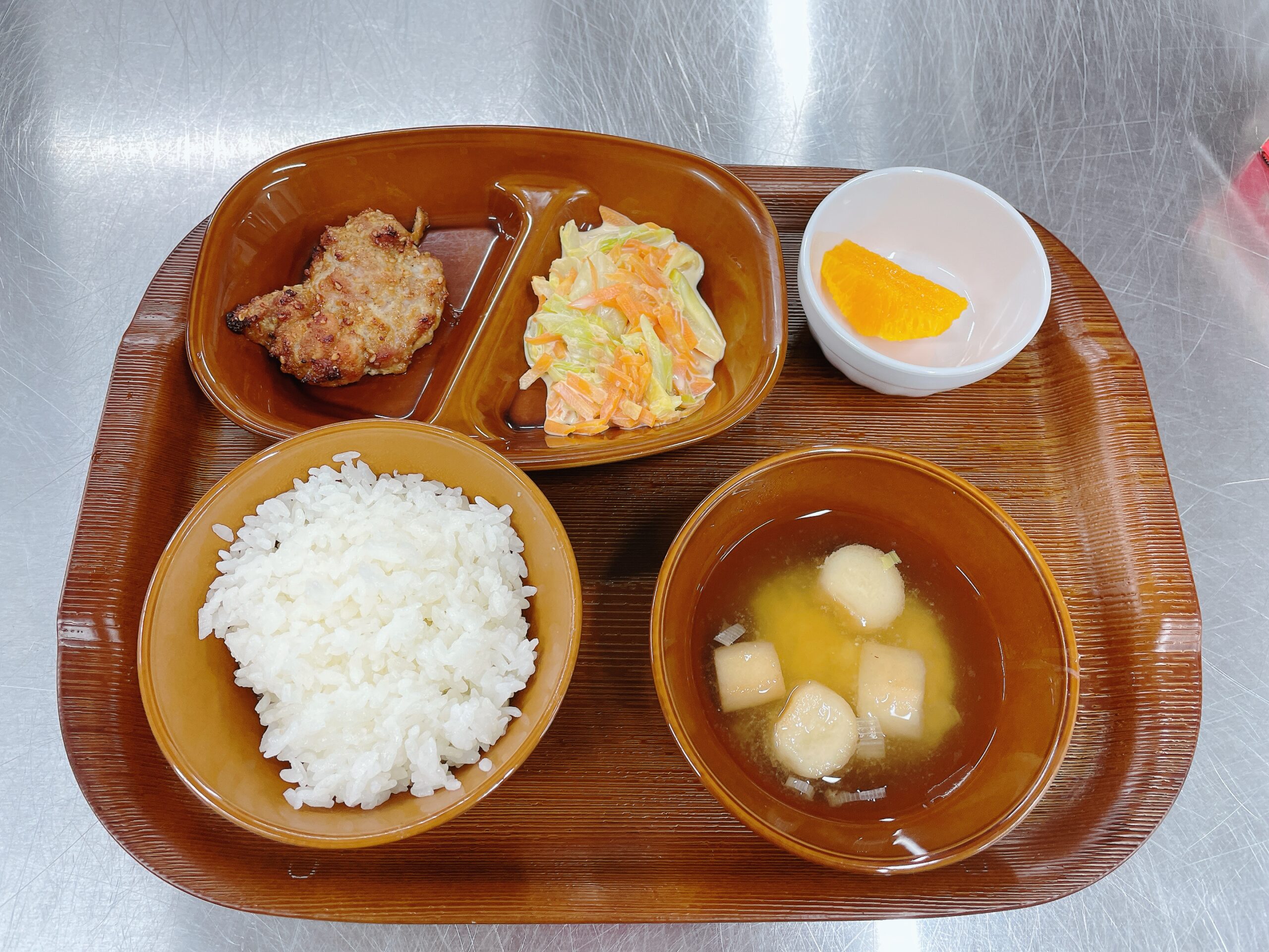 【メニュー】ご飯、味噌汁、鶏肉のごま風味焼き、和風マヨ和え、オレンジ