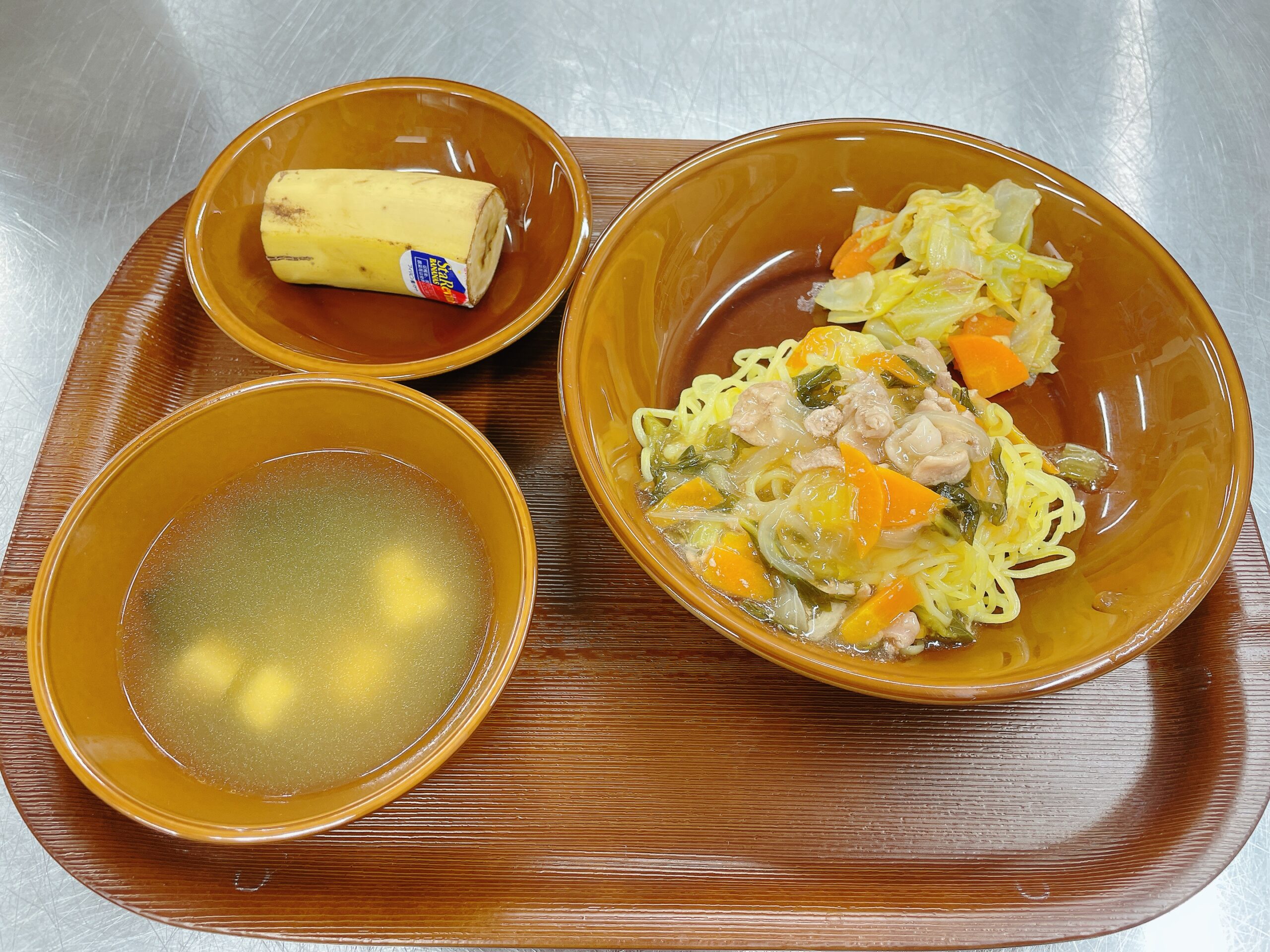 香ばしく焼き上げた蒸し麺に、とろみのあるあんをたっぷりかけた一品。彩り良く仕上げるために人参とチンゲン菜を食べやすい大きさに切り、シャキシャキ感を活かしました。餡は鶏ガラスープをベースに、塩・しょうゆ・ごま油で旨みを調整。子どもたちは「あんがあまくておいしい!」と嬉しそうに口いっぱいに頬張り、おかわり続出の大人気メニューでした。
