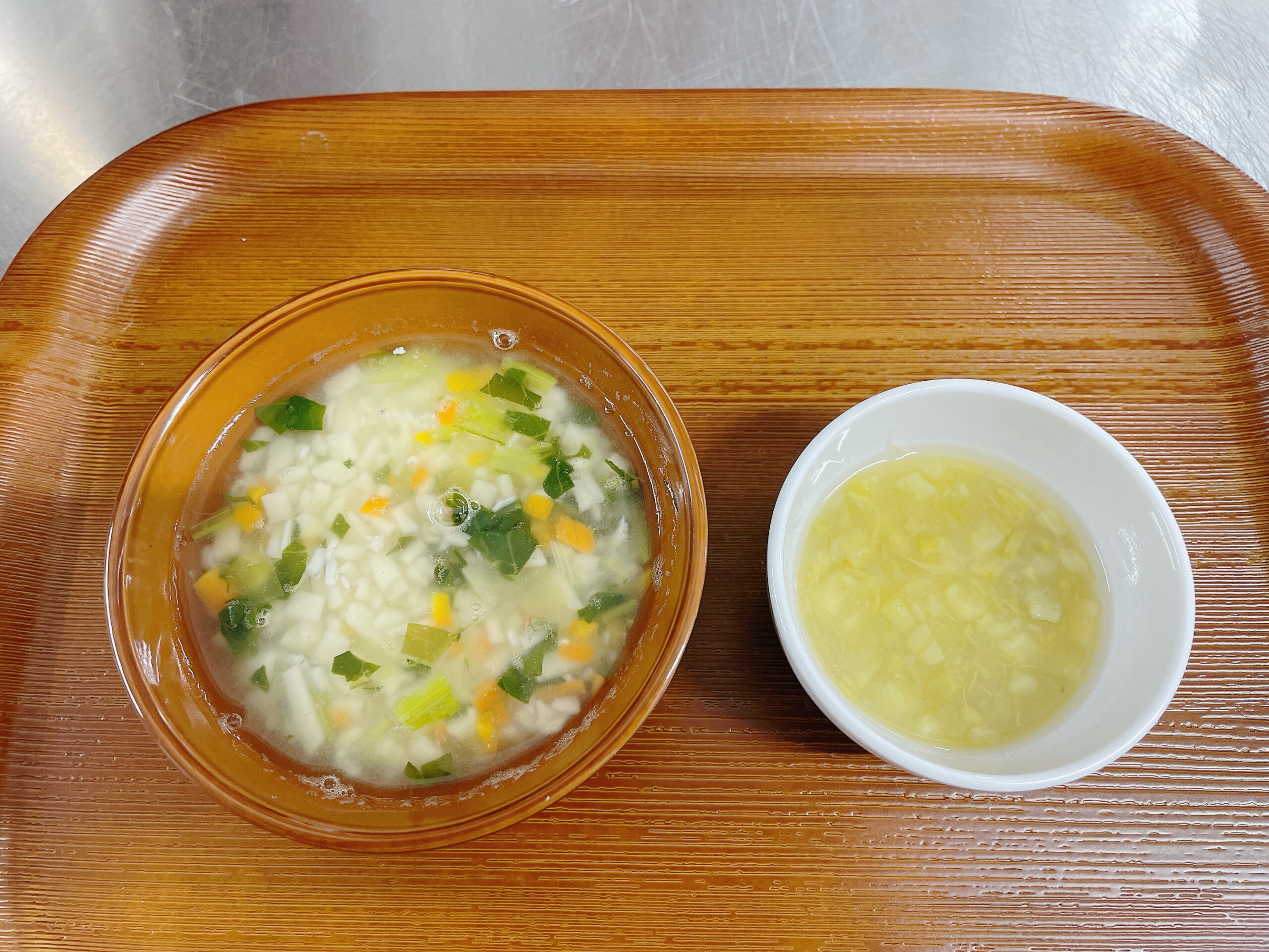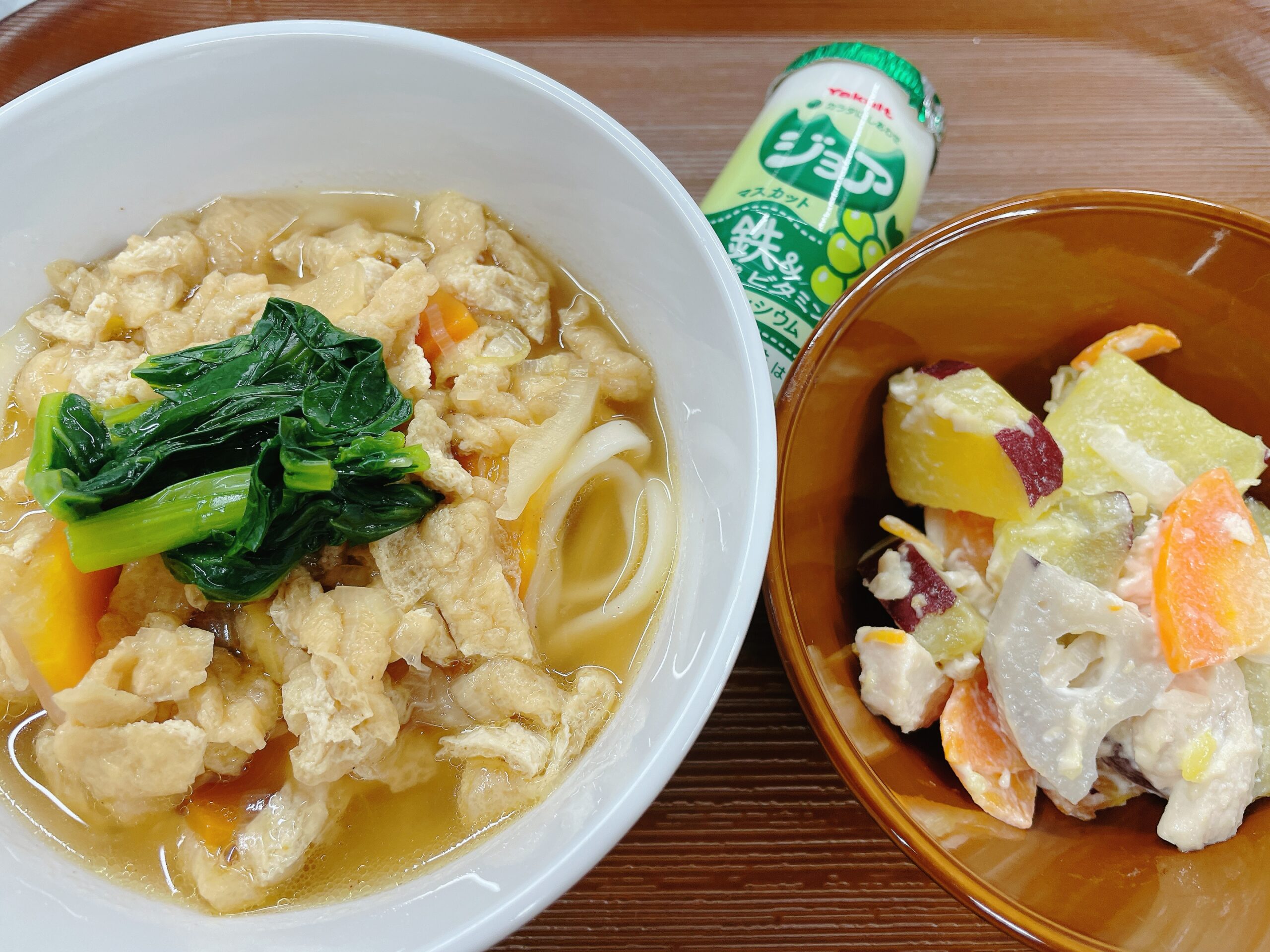 だしの効いたつゆに、油揚げをたっぷり入れた具だくさんうどん。人参、小松菜、ねぎも加えて彩り豊かに仕上げました。調理中は油揚げと野菜を先に軽く炒めてからだし汁を注ぎ、素材の風味をじっくり引き出しています。子どもたちは「つるつる~!」と元気よくうどんをすすり、体の芯から温まった様子でした。