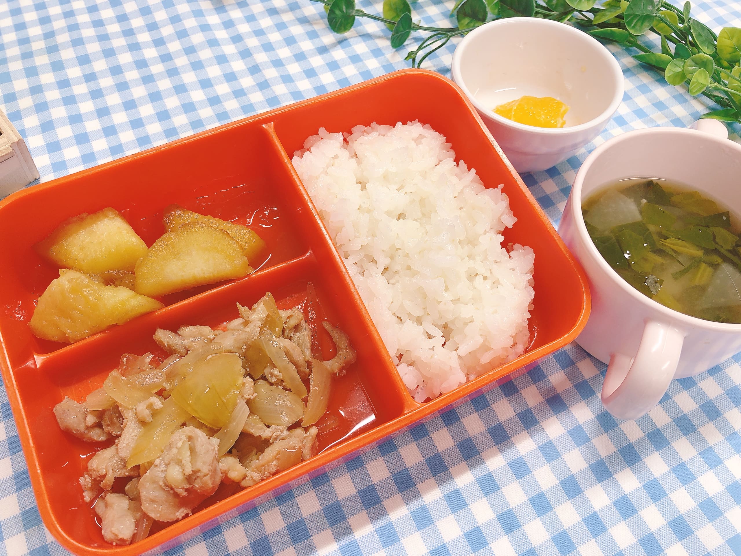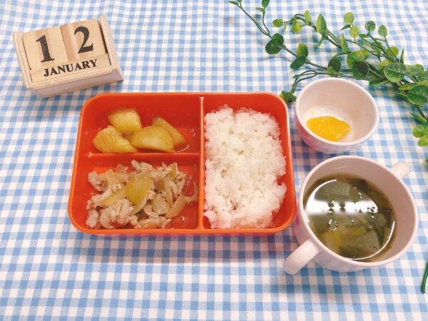 「おいしい!」の声が飛び交い、特に生姜の風味が効いた鶏肉は「もっと食べたい!」と大人気。ほくほくのさつま芋甘煮も「お芋大好き!」とモリモリ頬張っていました。オレンジは皮を剥きやすいように小房に分け、最後までしっかり完食。全員が笑顔で「ごちそうさま!」をしてくれました。