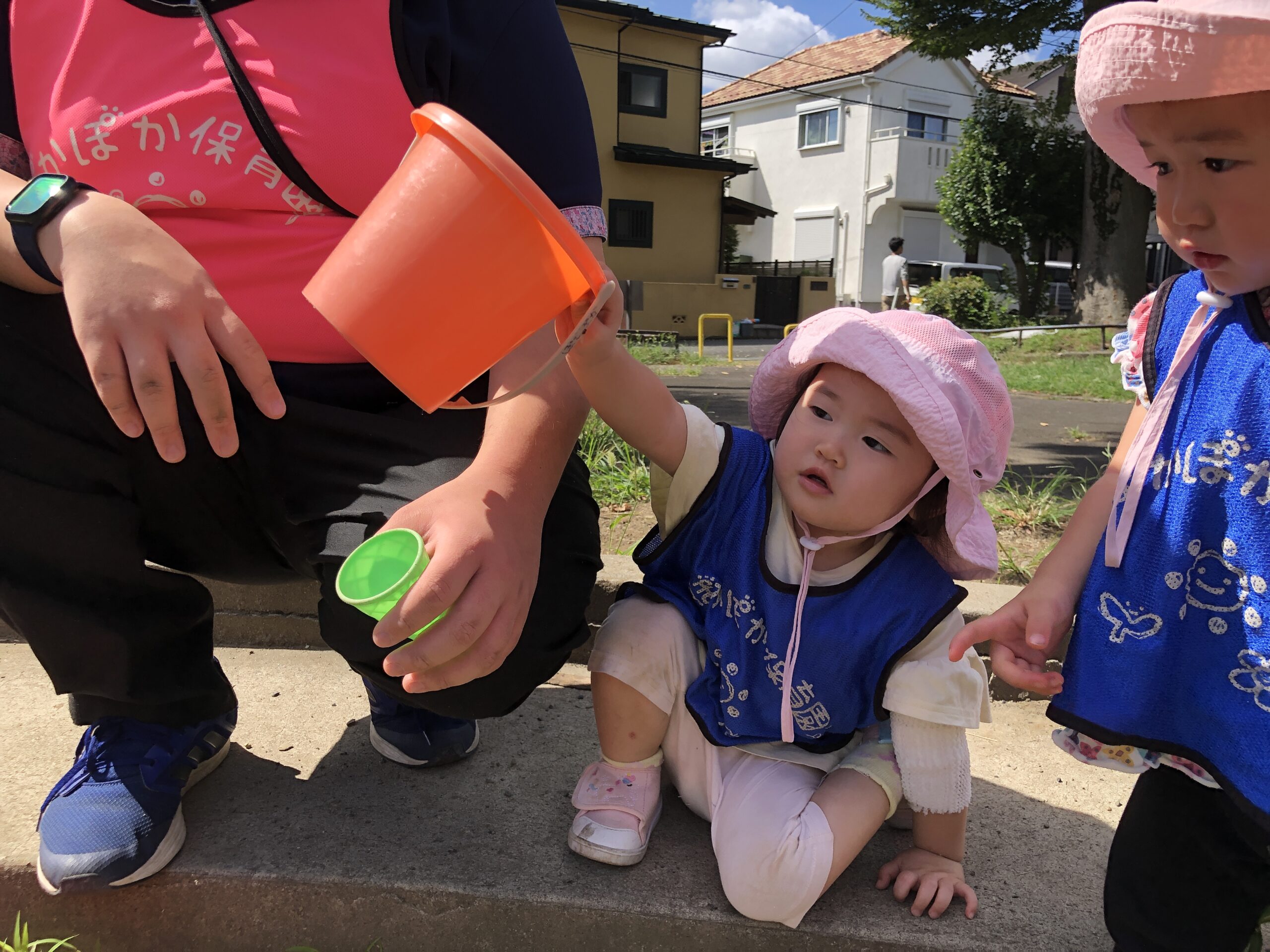0歳児の青空組さんは先生と一緒に砂をさわったり、
