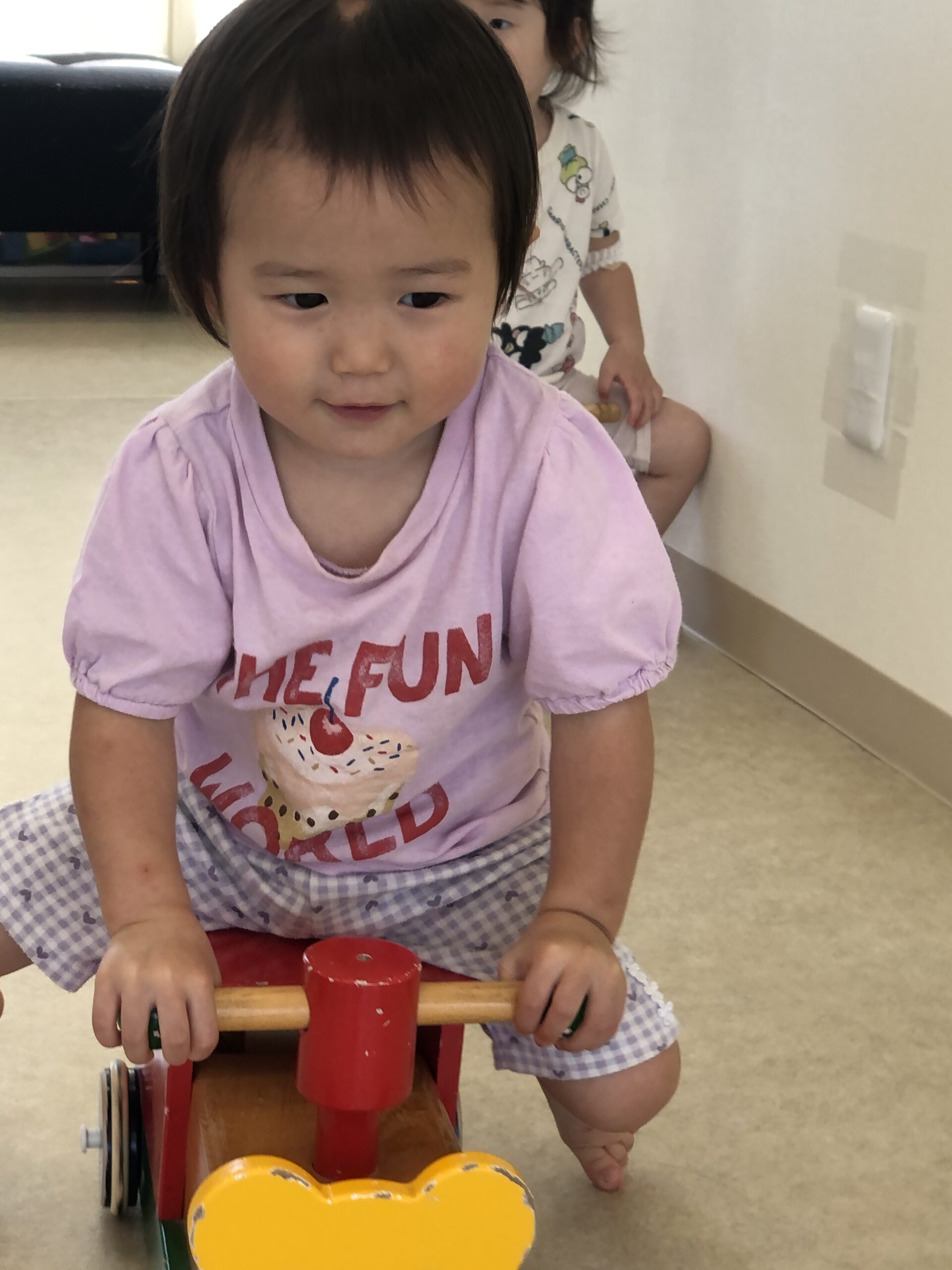 今日も気持ちの良い晴天。朝から子どもたちは元気いっぱいに登園してきました。1歳児の虹組さんは、まずは3階のお部屋でゆったりと遊びましたよ。中でも大人気だったのが足蹴りの乗用玩具。ひとりが乗り始めると「ぼくも〜!」「わたしもやりたい〜!」と自然と順番待ちの列ができました。保育士が「〇〇ちゃんの次は〇〇くんね」と声をかけると、「うん、わかった!」としっかりお返事。みんなで仲良く順番を守ることも、日々のカリキュラムの一環として大切にしています。