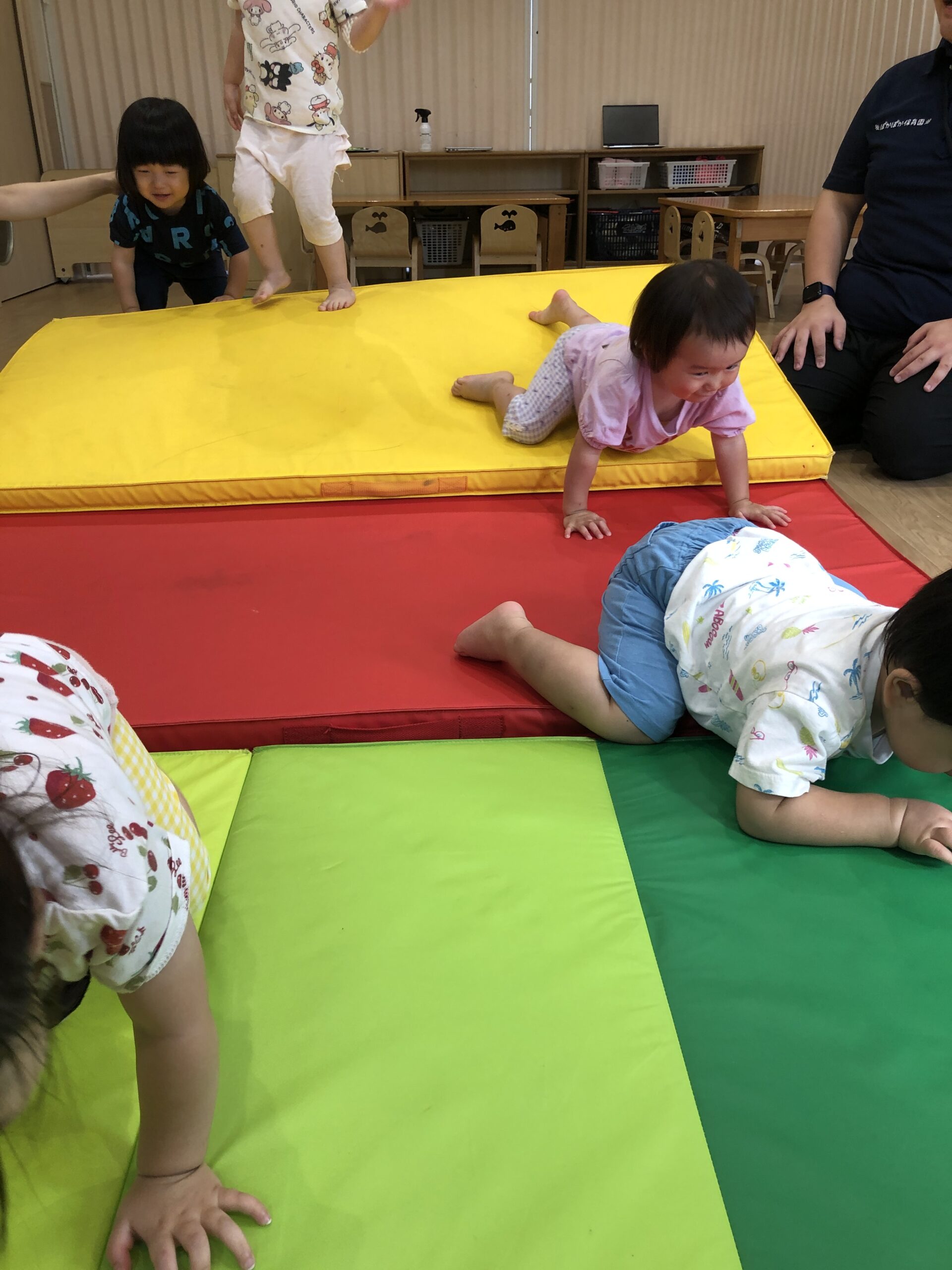そして、次は2階のお部屋に移動してマット遊び。マットを見つけた瞬間、虹組さんの目がキラキラに。「キャーッ!」と元気いっぱいな声が響きました。中にはマットの坂道をハイハイで一生懸命登る子もいれば、ゴロゴロ〜と転がって大笑いする子も。「よいしょ、よいしょ!」と言いながら登っていく姿も見られました。