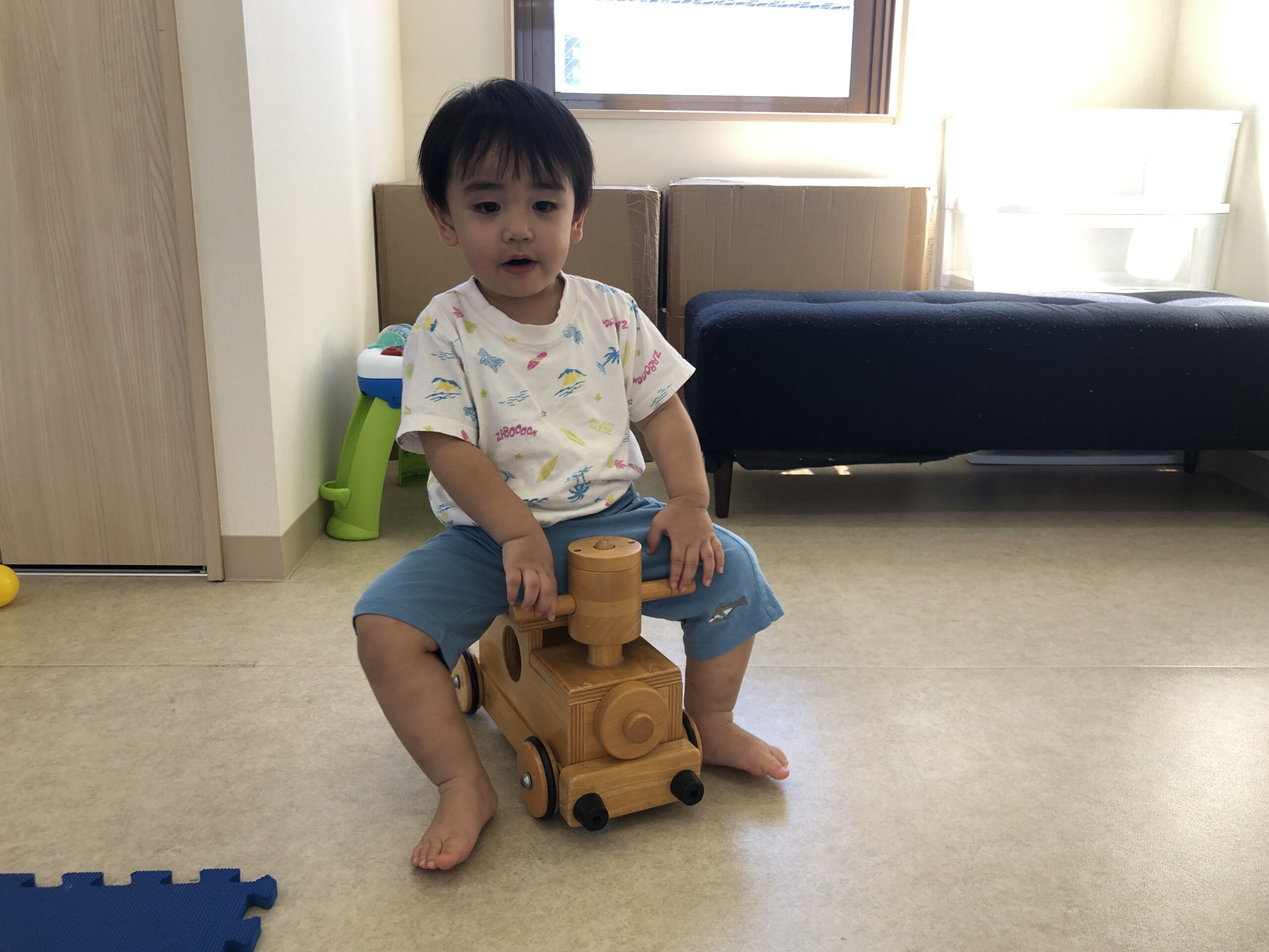 今日も気持ちの良い晴天。朝から子どもたちは元気いっぱいに登園してきました。1歳児の虹組さんは、まずは3階のお部屋でゆったりと遊びましたよ。中でも大人気だったのが足蹴りの乗用玩具。ひとりが乗り始めると「ぼくも〜!」「わたしもやりたい〜!」と自然と順番待ちの列ができました。保育士が「〇〇ちゃんの次は〇〇くんね」と声をかけると、「うん、わかった!」としっかりお返事。みんなで仲良く順番を守ることも、日々のカリキュラムの一環として大切にしています。