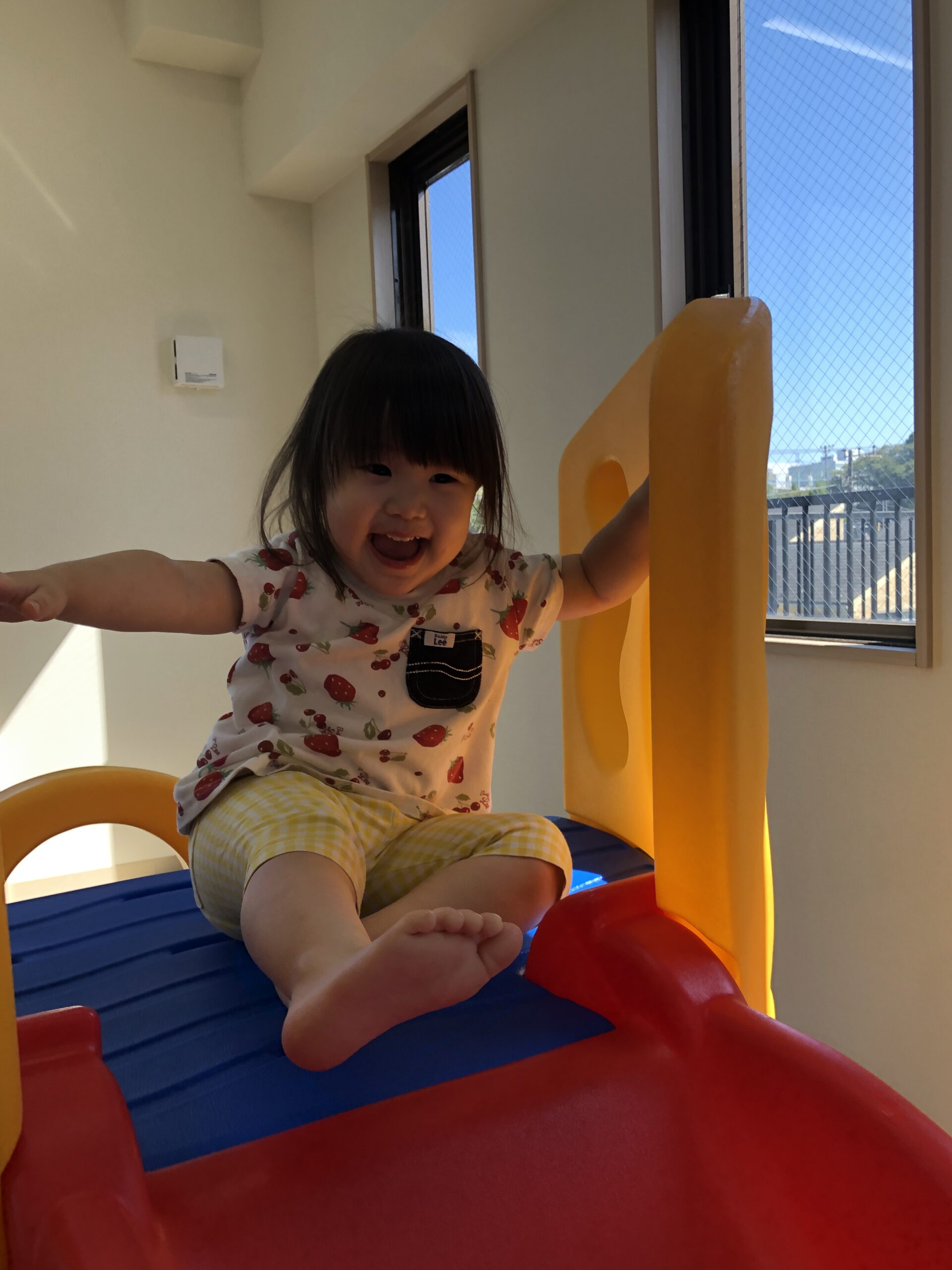 そして、次は2階のお部屋に移動してマット遊び。マットを見つけた瞬間、虹組さんの目がキラキラに。「キャーッ!」と元気いっぱいな声が響きました。中にはマットの坂道をハイハイで一生懸命登る子もいれば、ゴロゴロ〜と転がって大笑いする子も。「よいしょ、よいしょ!」と言いながら登っていく姿も見られました。