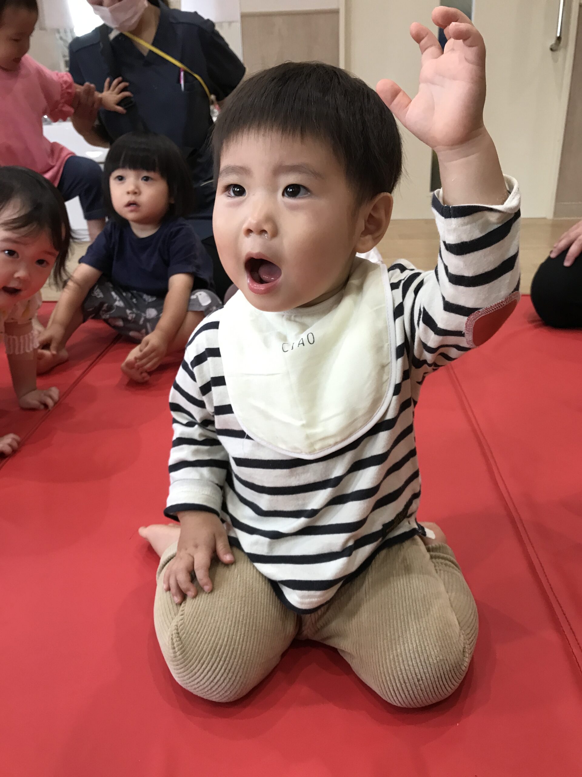 1歳児の虹組では、音楽と英語を取り入れた盛りだくさんの活動がありました。