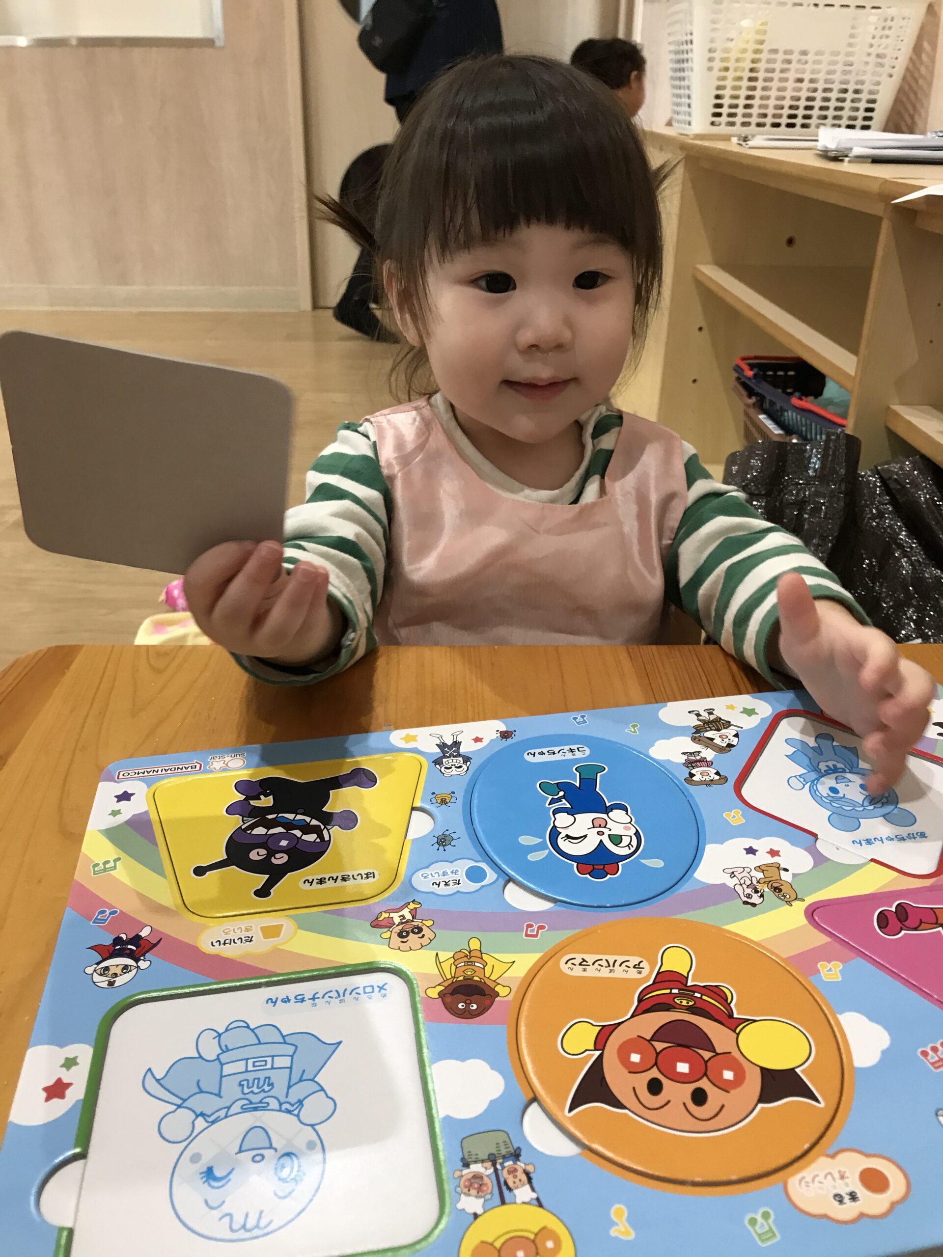 同じ絵が描かれたカードの上に置くと、「できたー!」と嬉しそうに笑います。