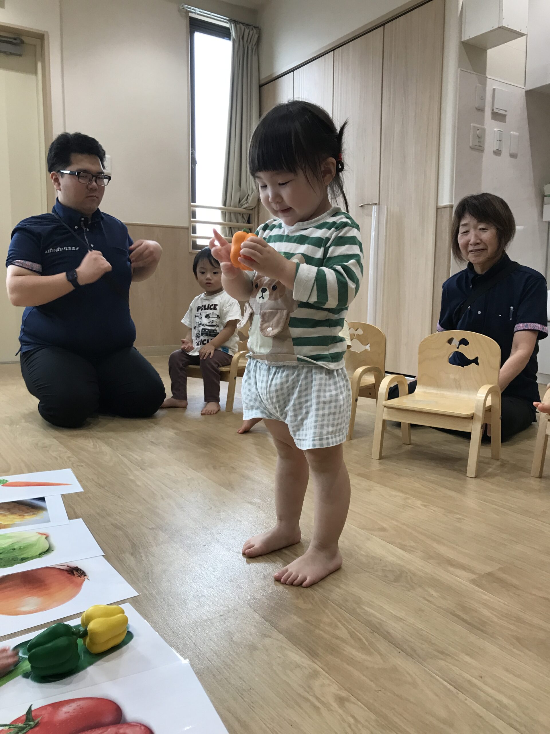 1歳児の子どもは先生に「これ、ブロッコリー?」と聞き、先生が「そうだね!ブロッコリーだね」と答えると、満足そうにうなずいていました。遊びの中で英語や言葉を自然に