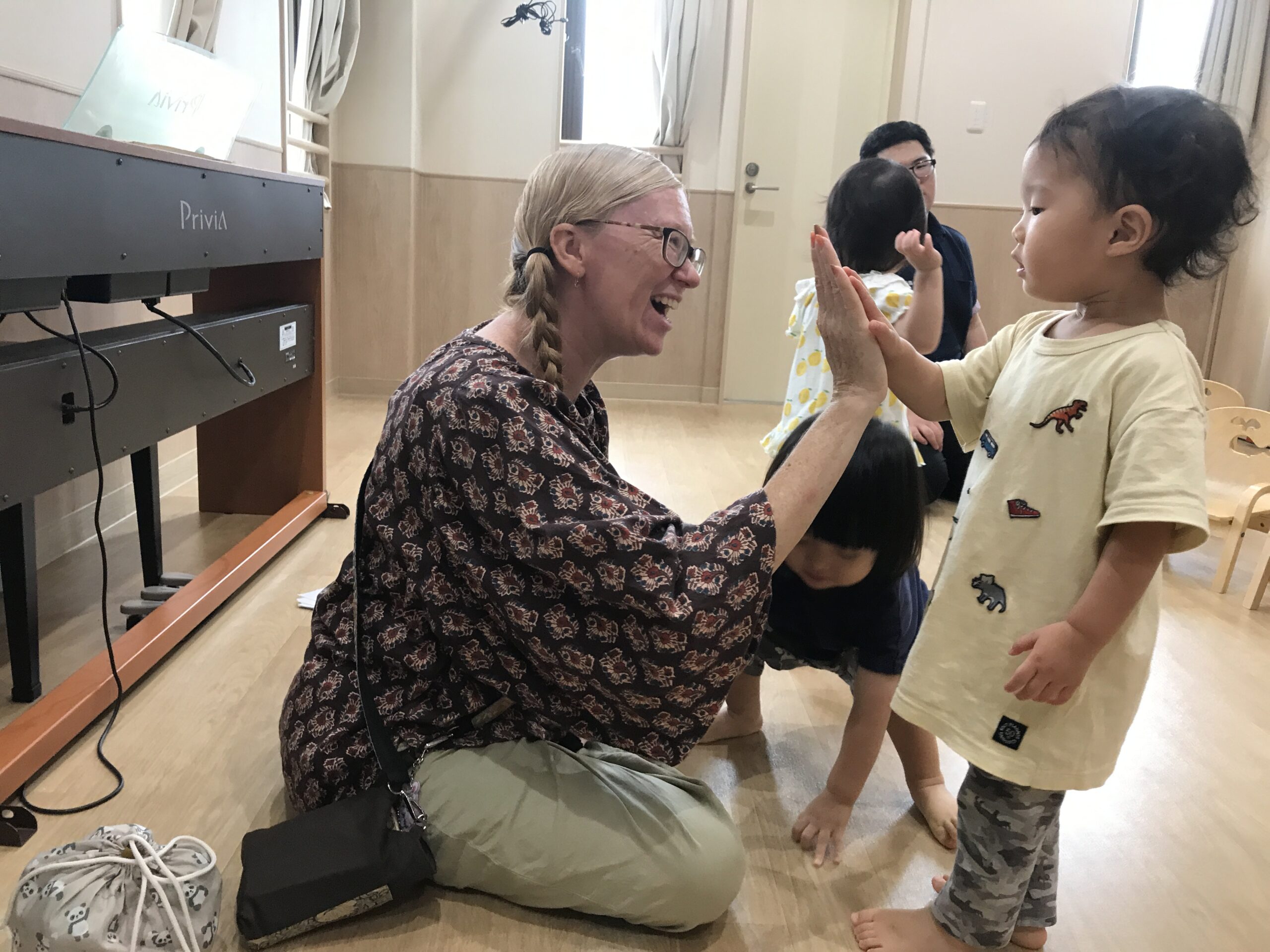 耳をすませています。0歳児の子どもも、ピアノのリズムに合わせて体を揺らし、