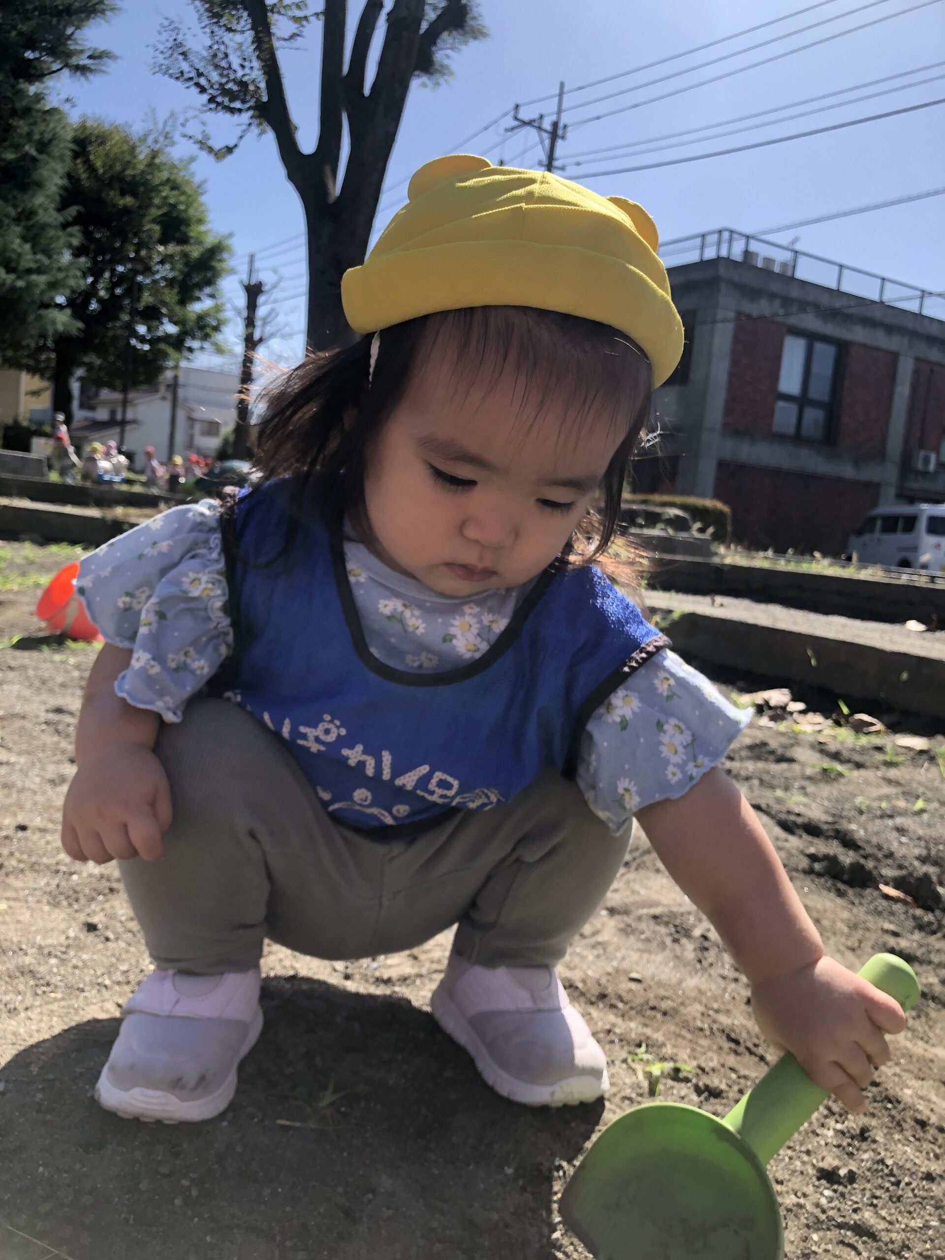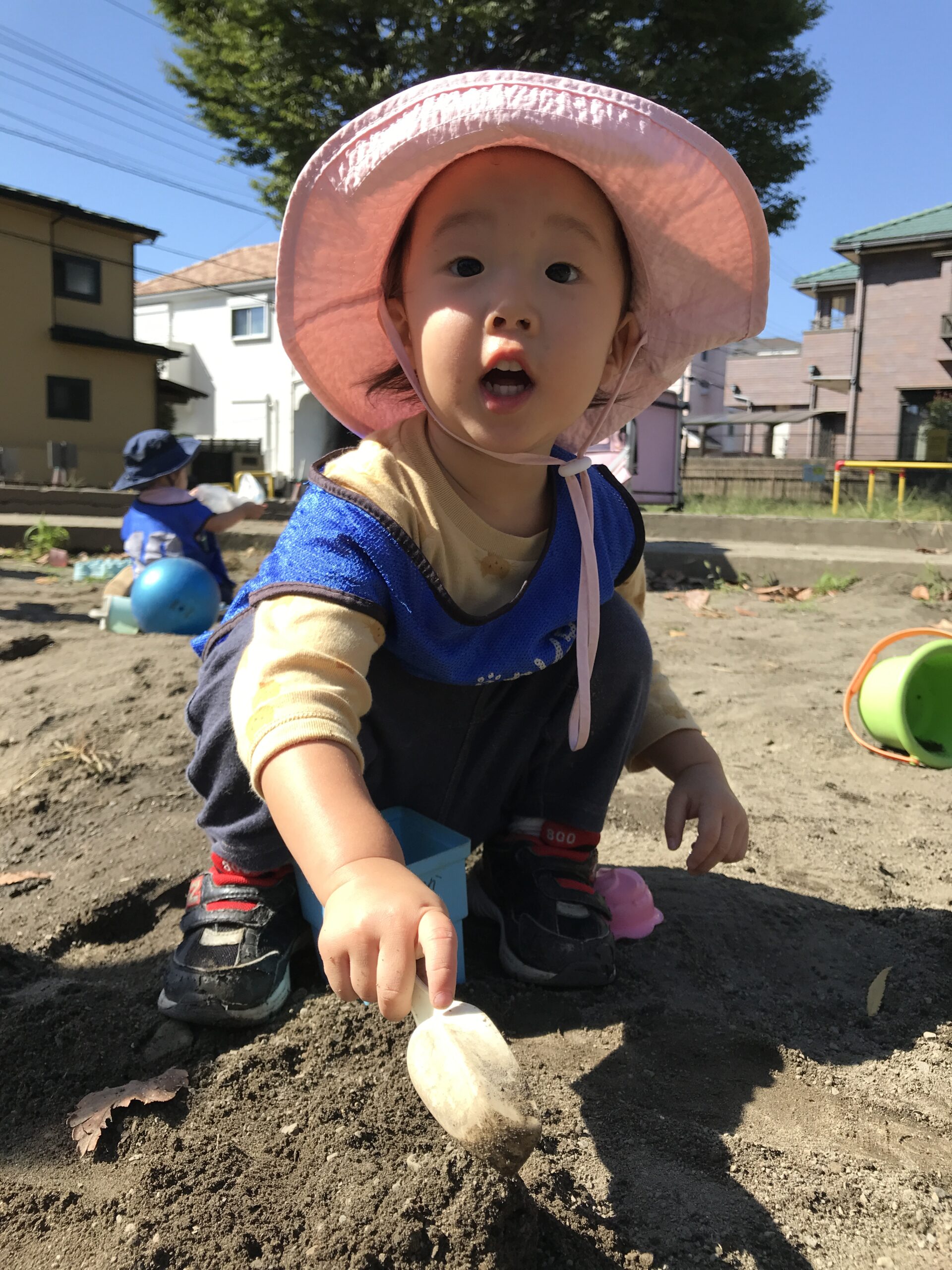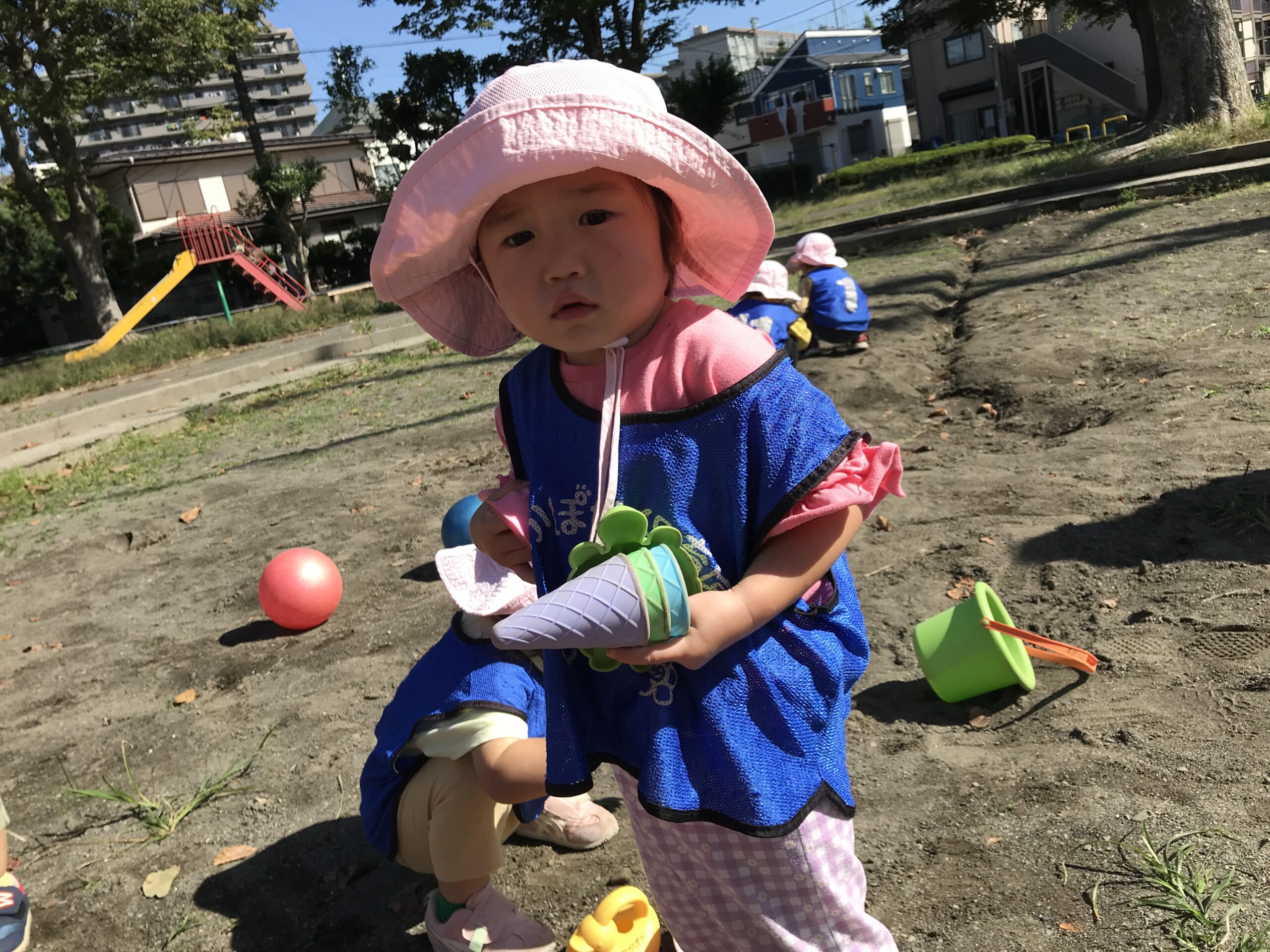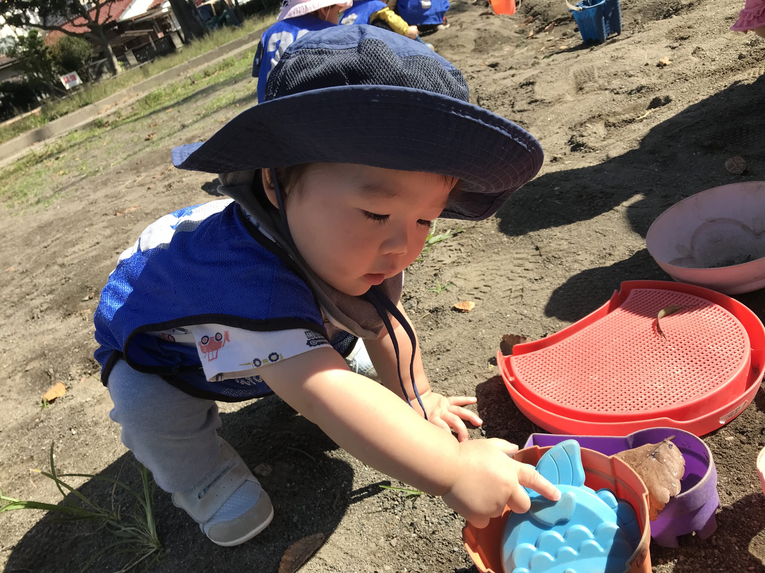 1歳児のお兄さん・お姉さんを真似して、スコップでバケツに砂を入れようと頑張る姿もありました。