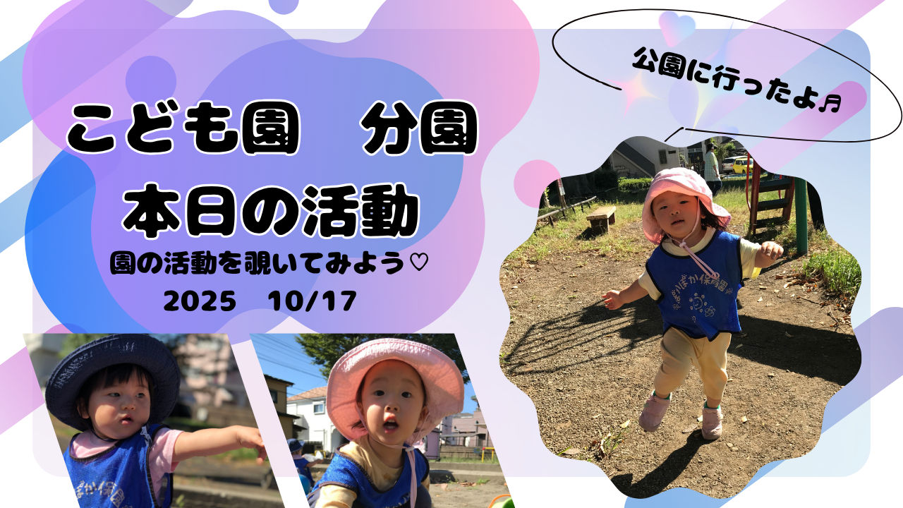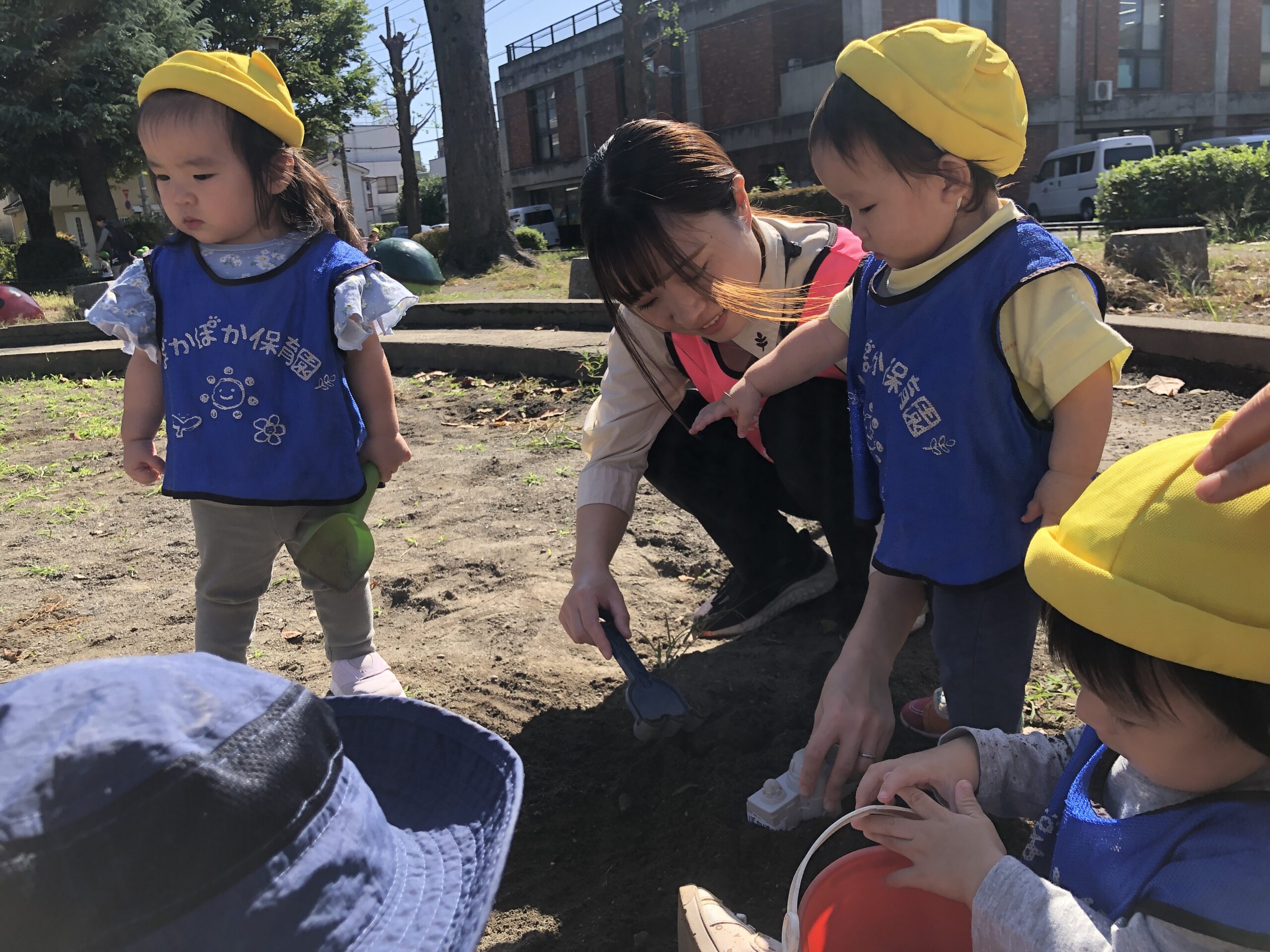 0歳児の青空組と1歳児の虹組の子どもたちは、みんなで近くの公園へお散歩に出かけました。