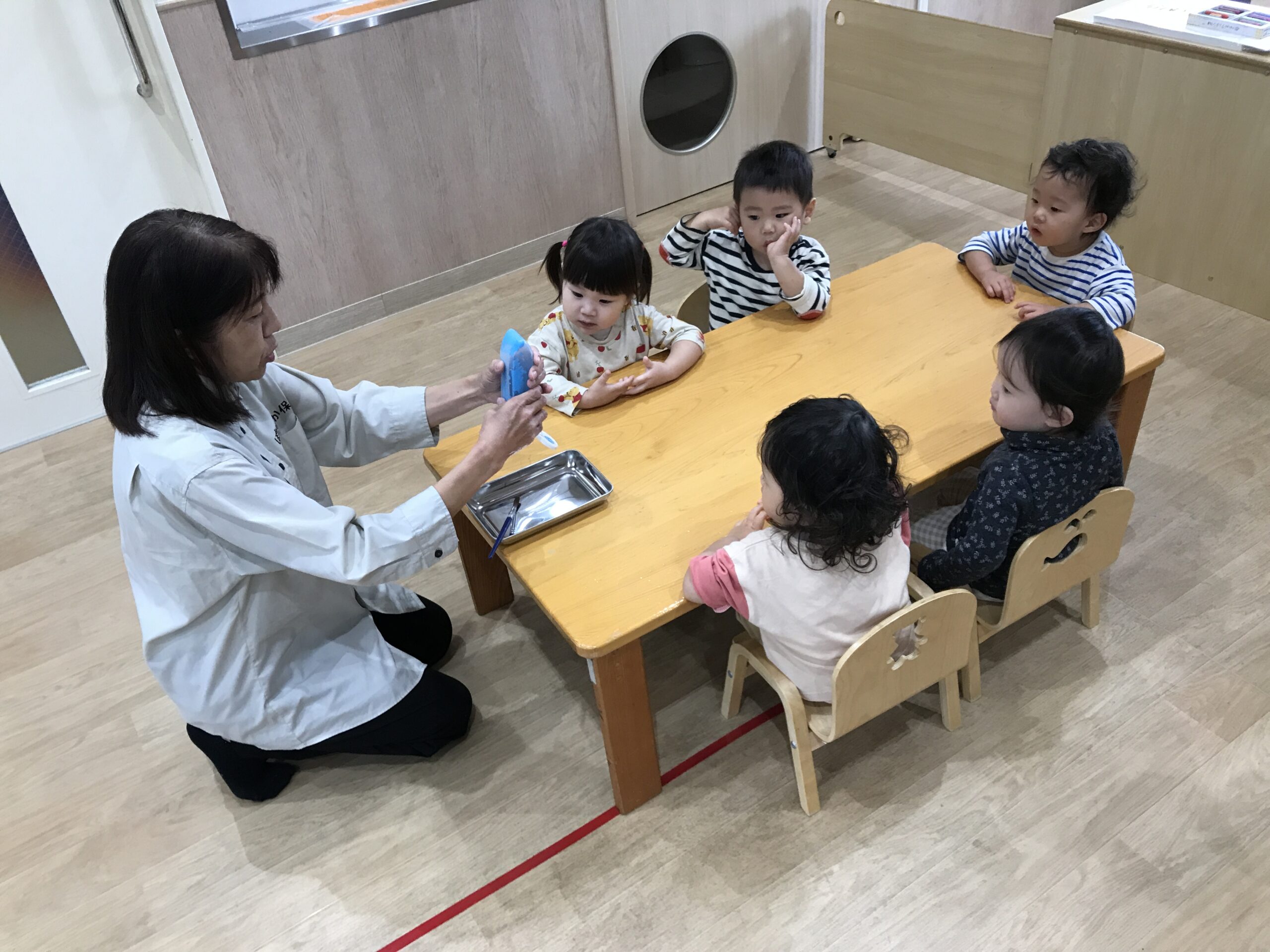 1歳児の虹組では、「はじき絵」を楽しみました。