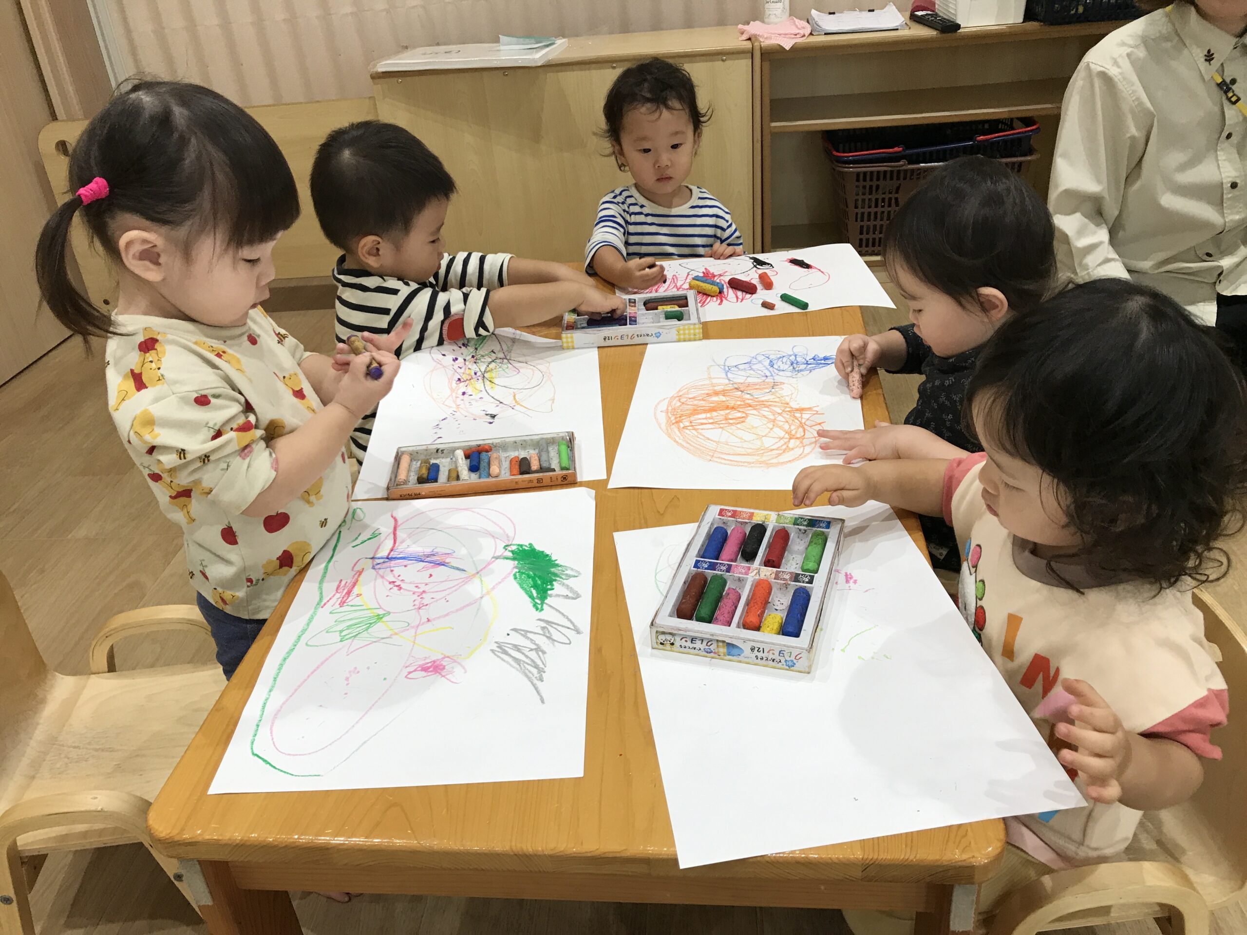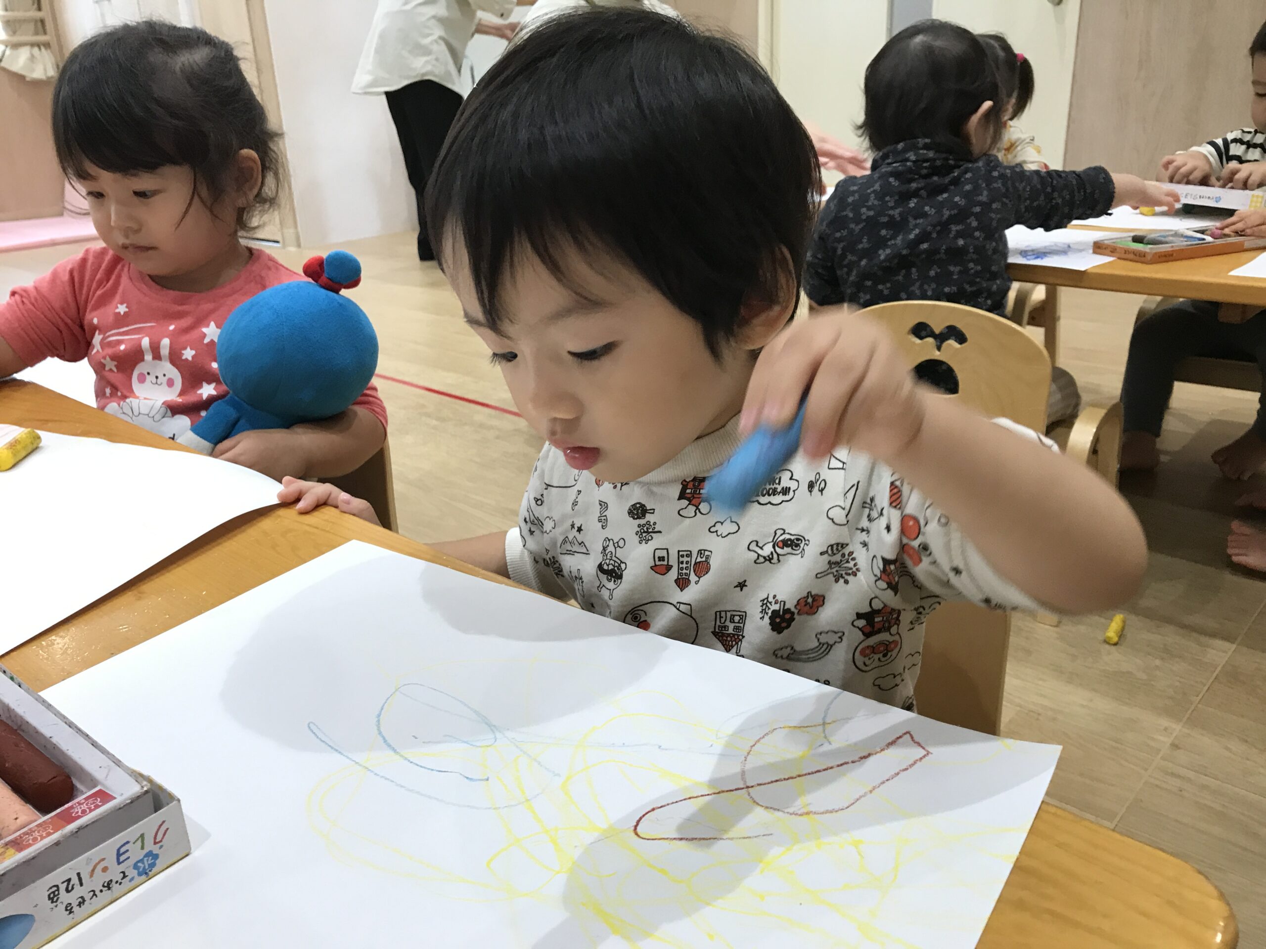 先生が「今日は白いクレヨンでお絵かきするよ〜」と声をかけると、「なにするの?」「えー!みえない!」とワクワクした表情の子どもたち。
