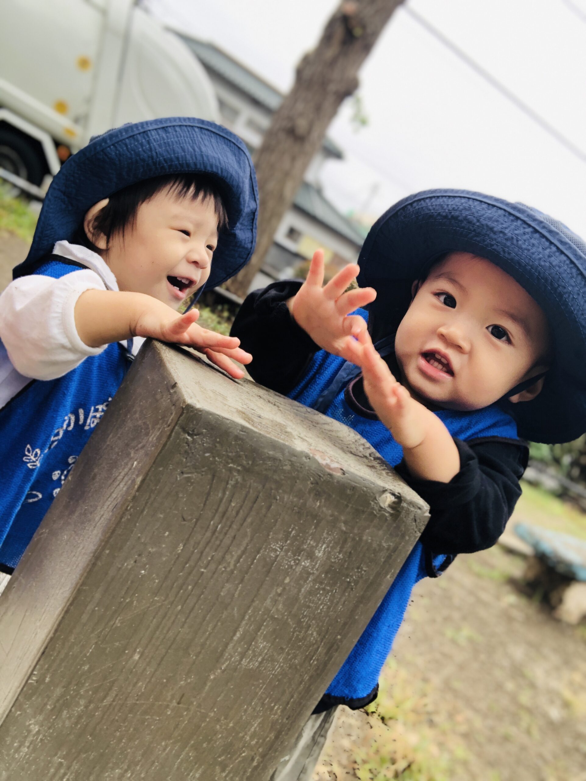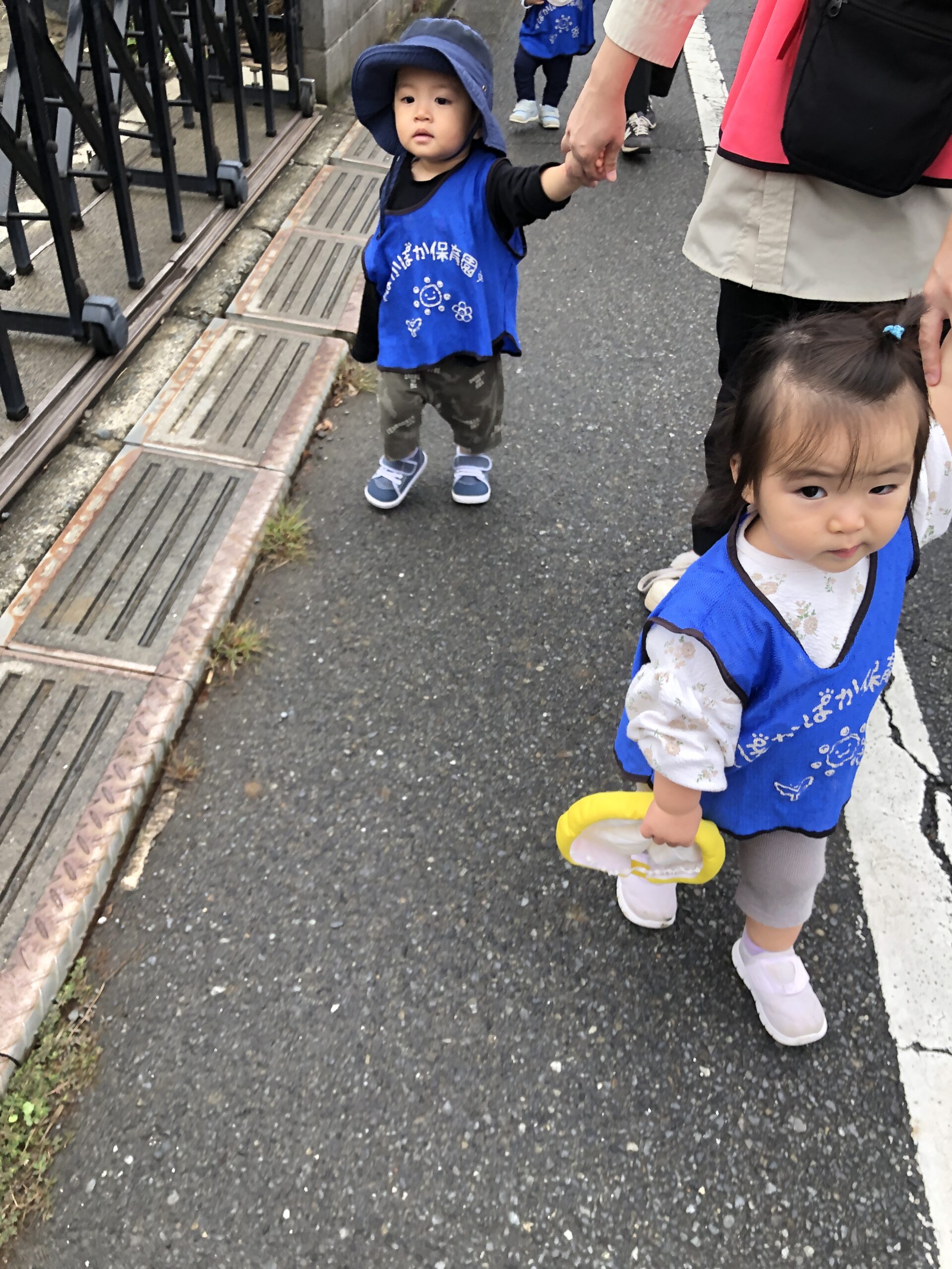 道の途中で落ち葉を拾ったり、水たまりをのぞいたり、小さな秋を感じながらのお散歩です。