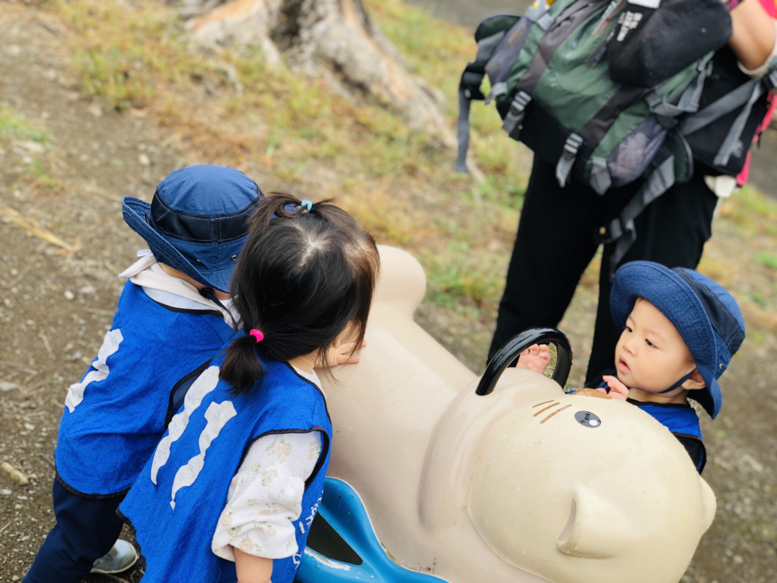 公園では、遊具のラッコさんに「こんにちは〜!」と声をかけたり、のびのびと遊ぶ子どもたち。