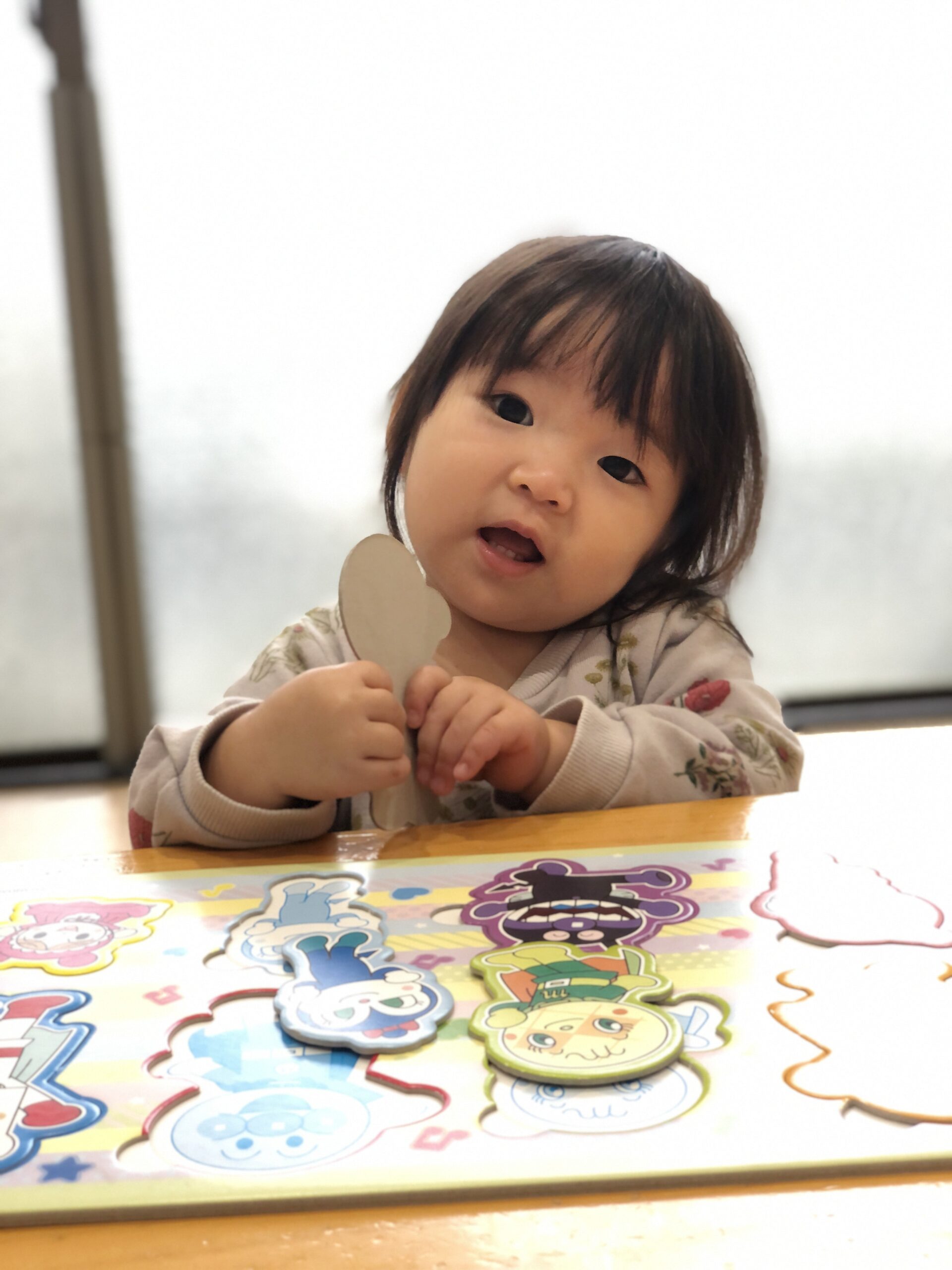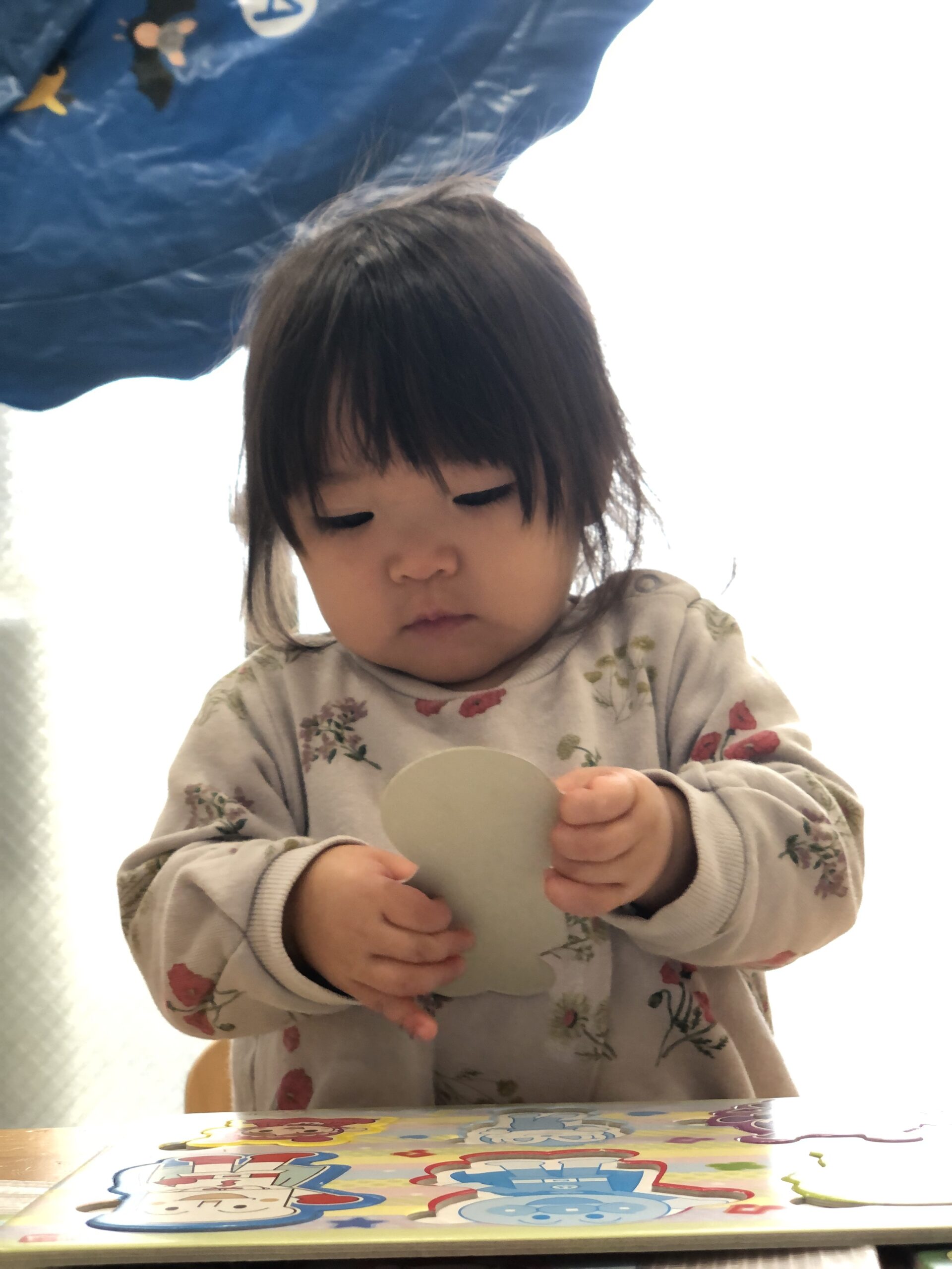 保育者と一緒にピースをはめながら、「ここかな?」「できた!」と嬉しそうな声が聞こえます。