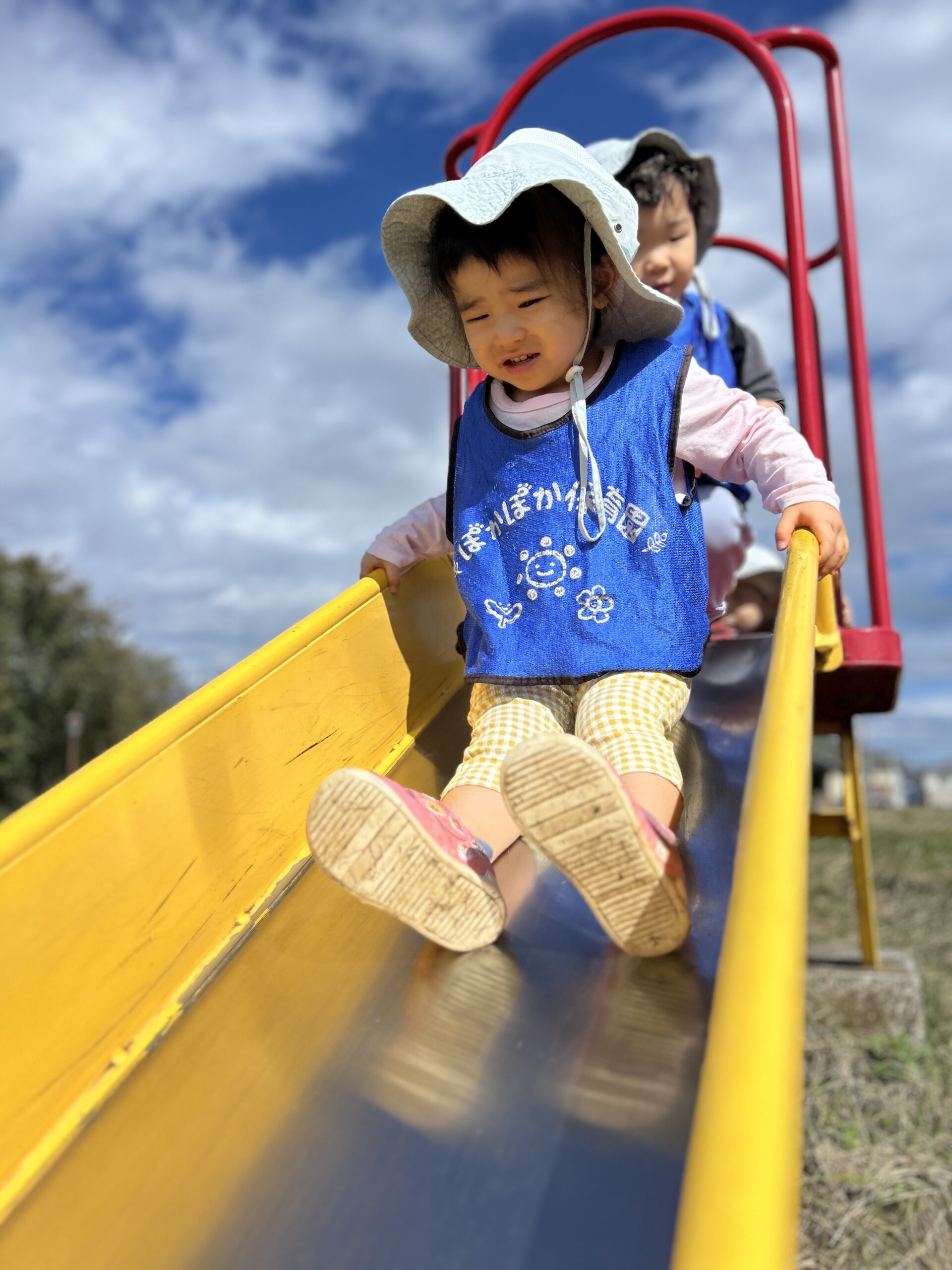 滑り台、楽しいな~!お日様が反射して眩しい~!!