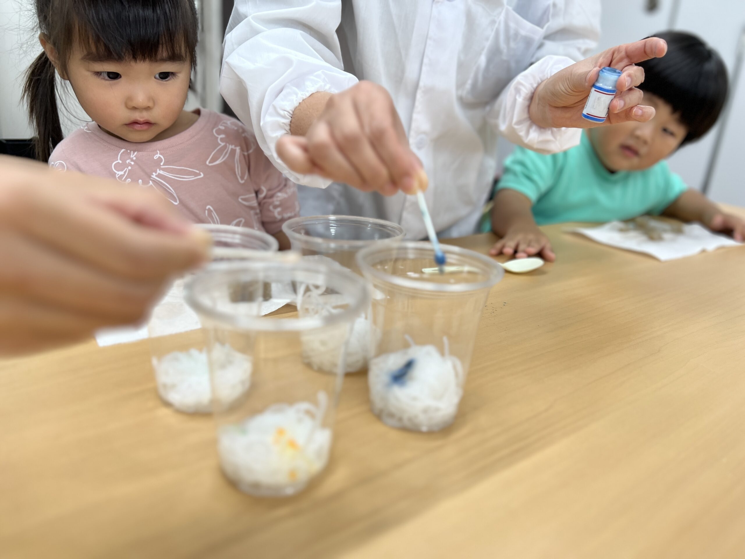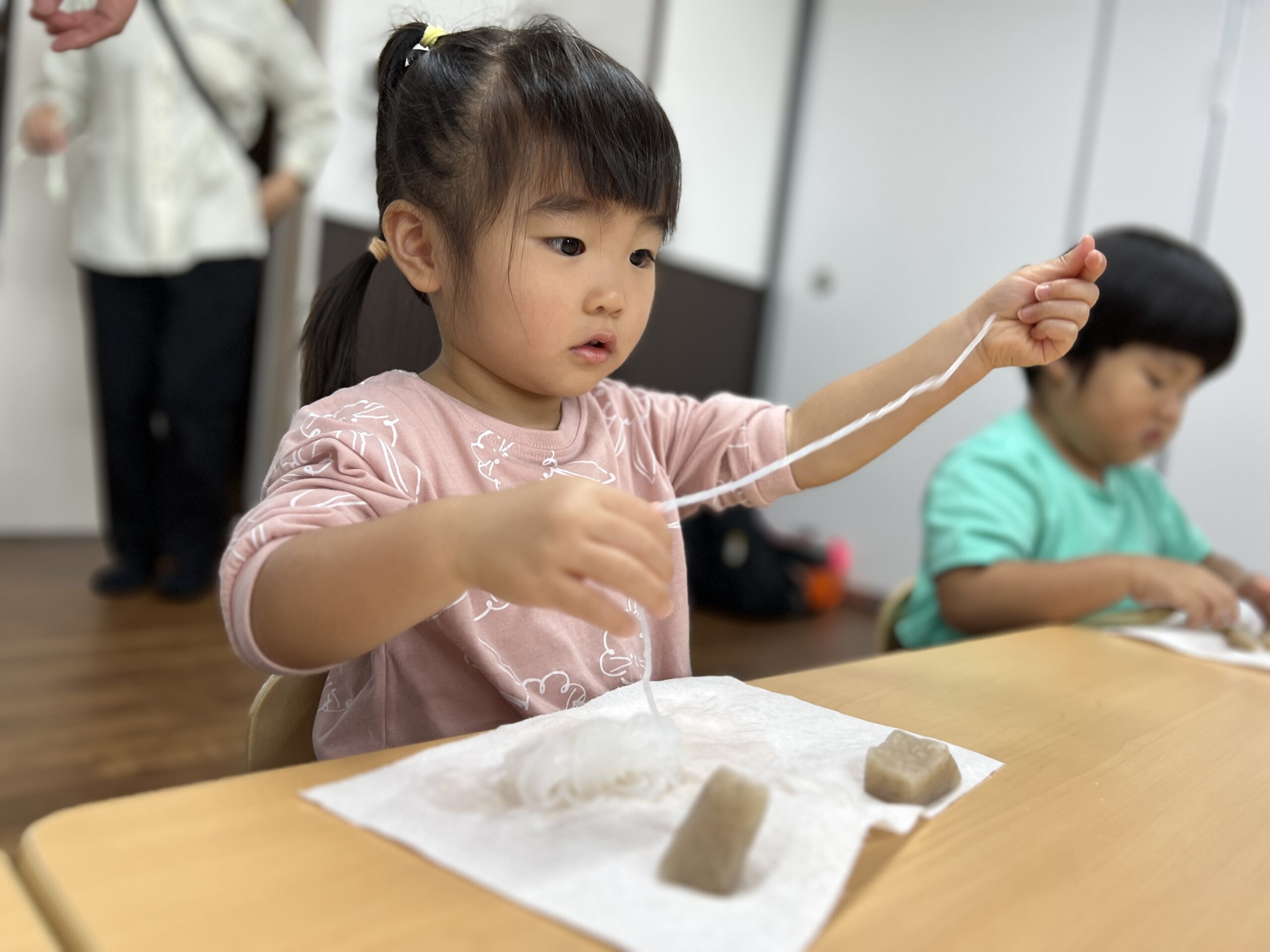 先生が手にしている『こんにゃく』に触れて、嗅覚や触覚などを使って楽しみました。