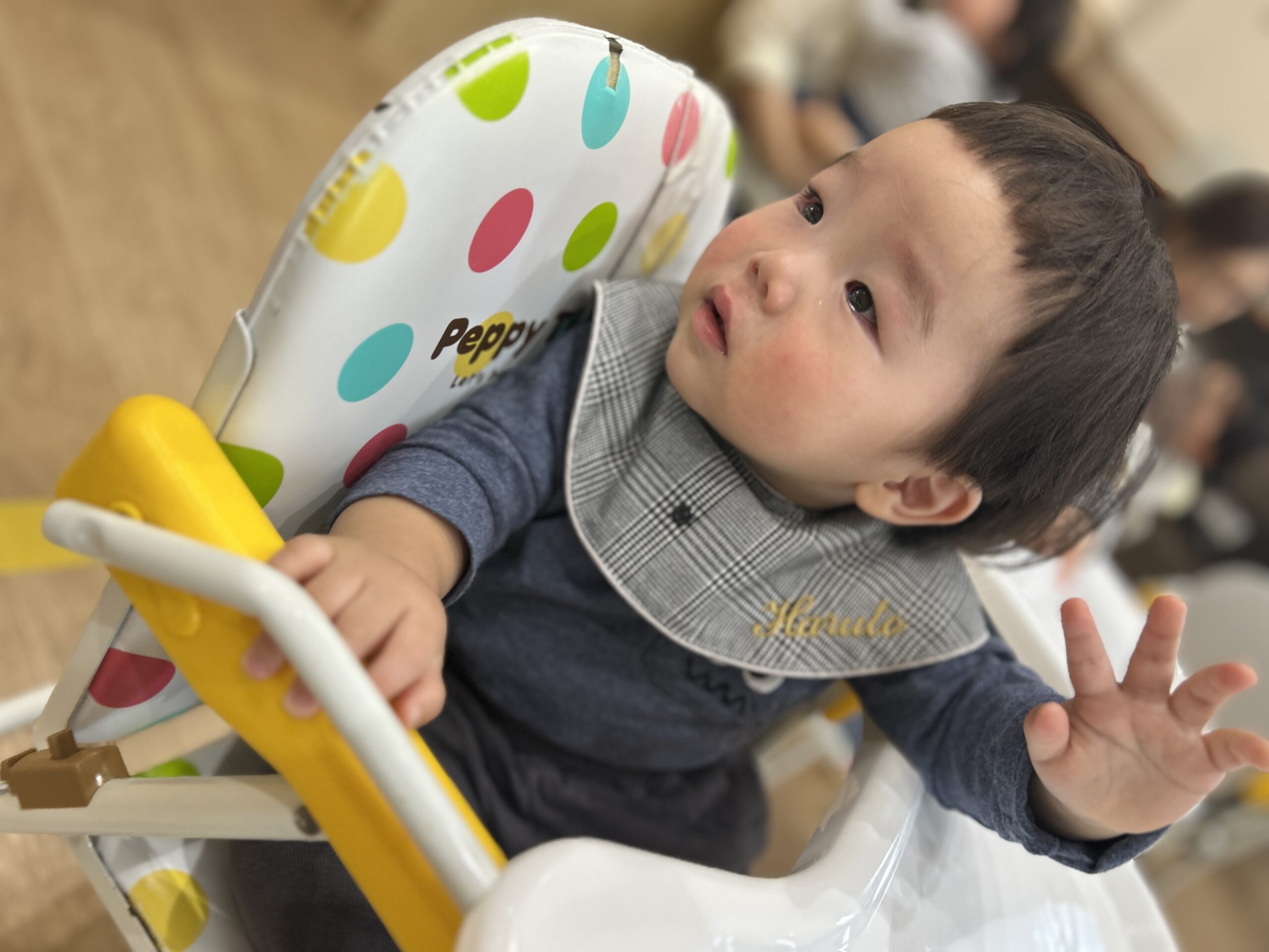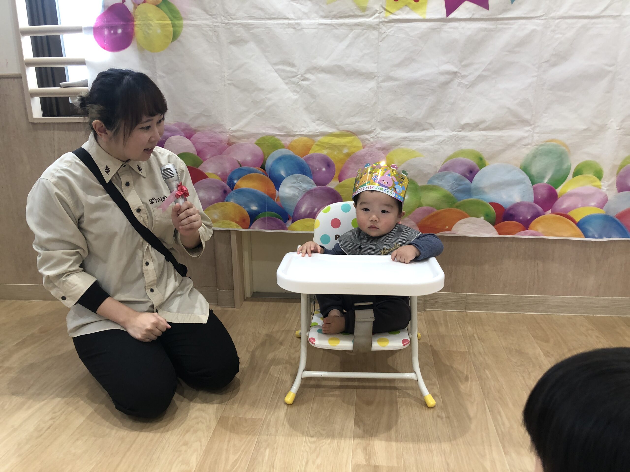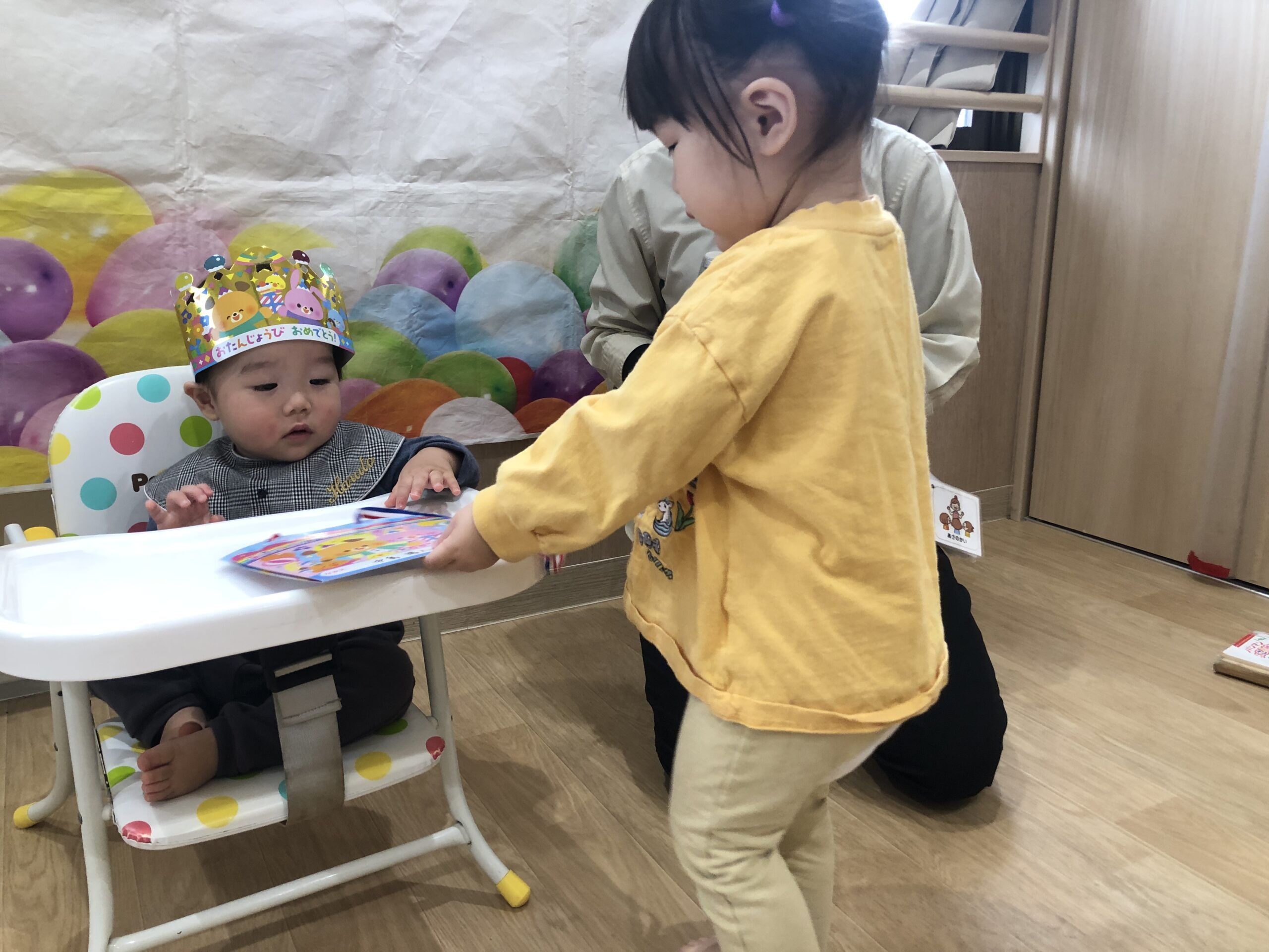 お誕生日カードをもらうと、にこっと笑って受け取っていました。小さな手でカードを大事に持つ姿に、成長を感じました。