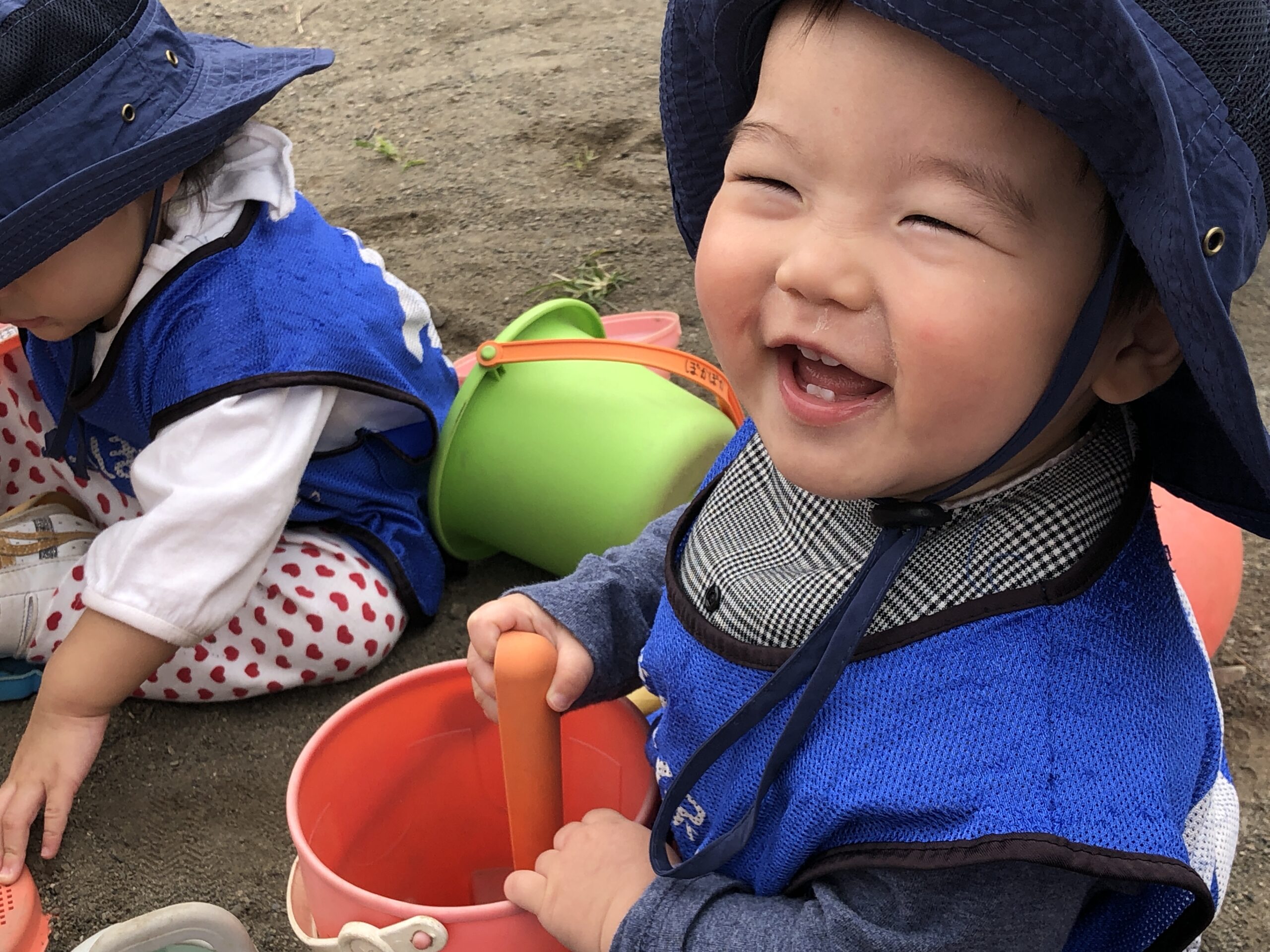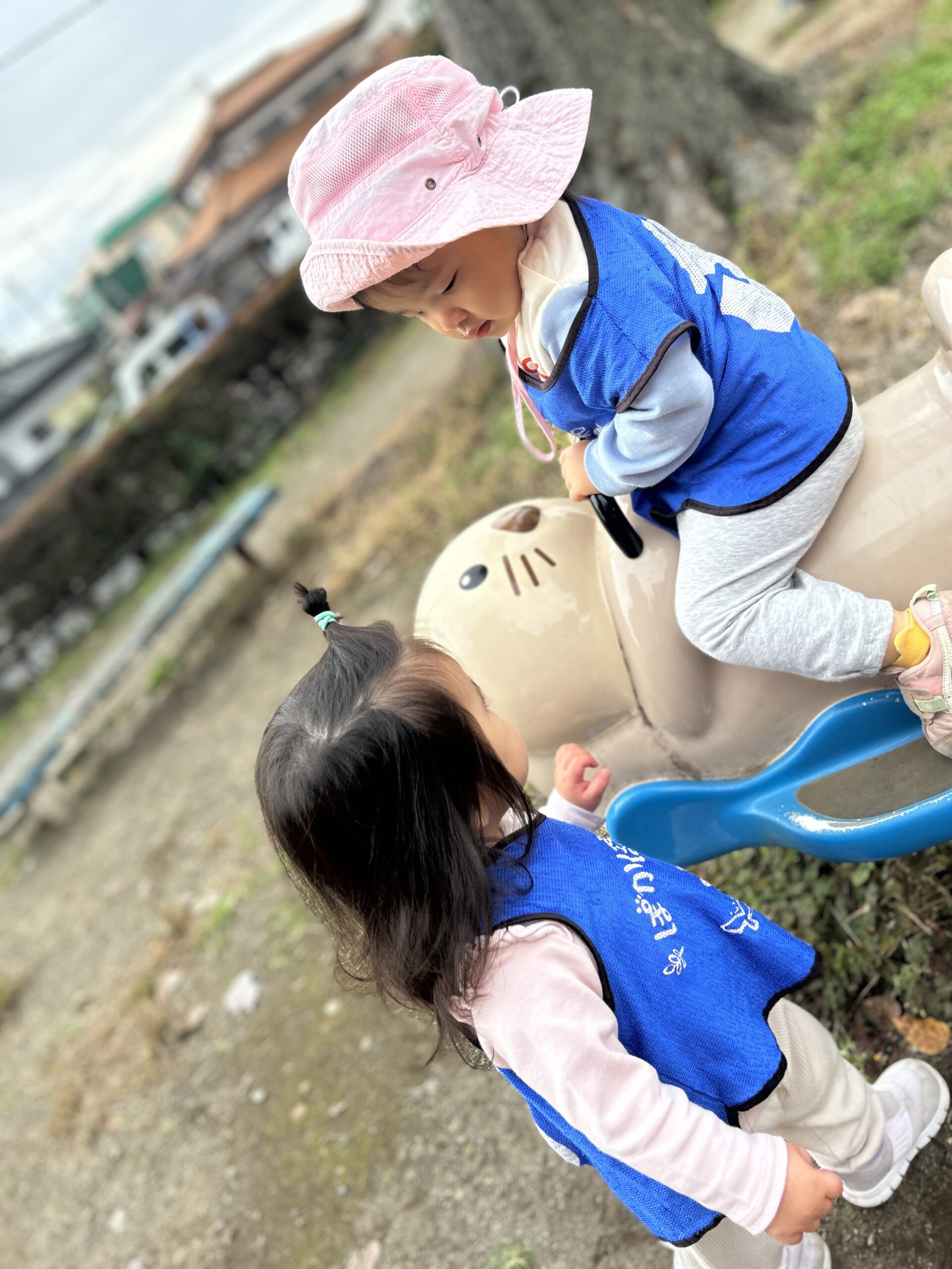 0歳児さんは先生と手をつないでのびのびと過ごし、1歳児さんはお友達と関わりながら笑顔で遊ぶ姿が見られました。