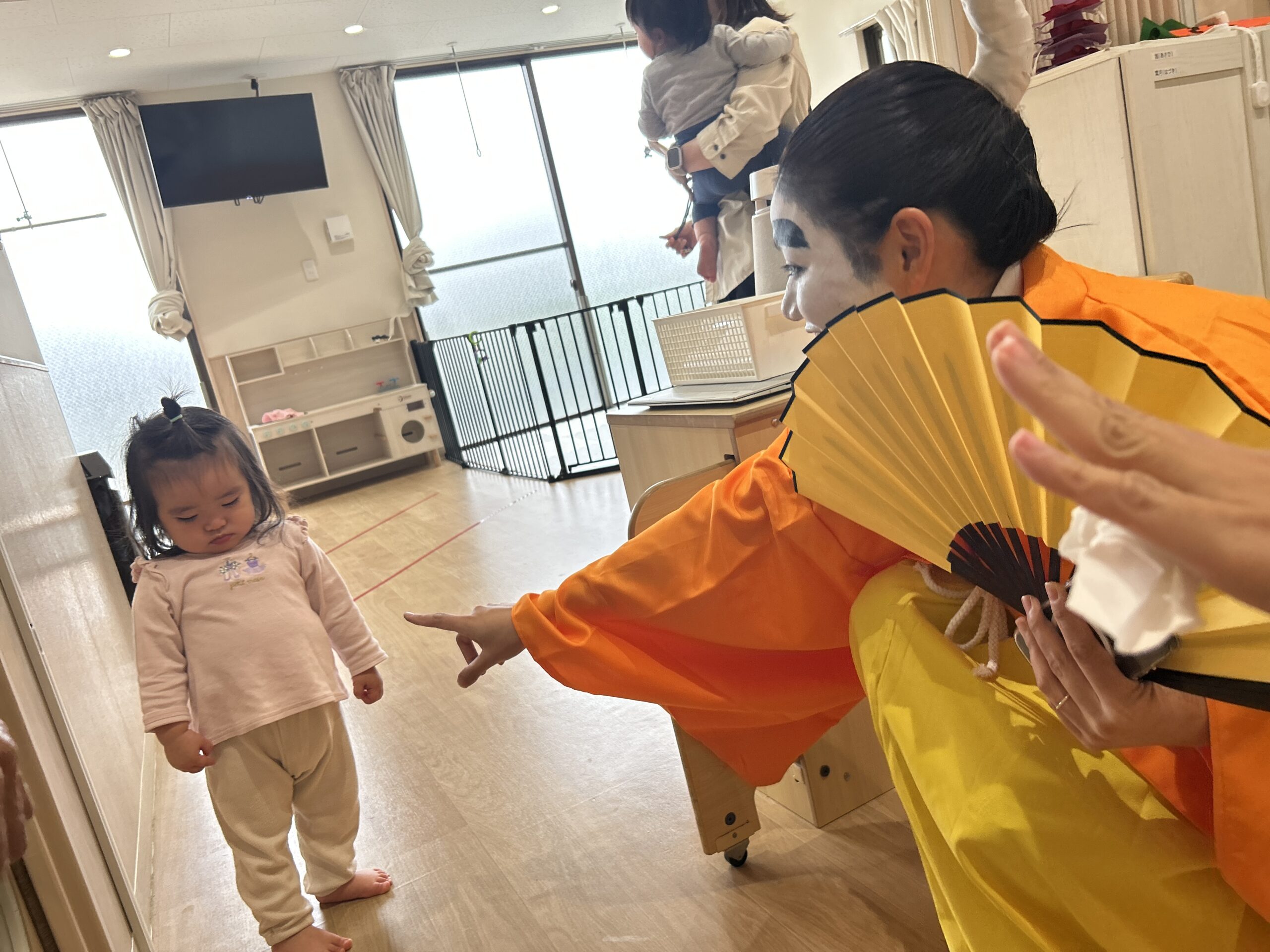 理事長先生と園長先生がハロウィンの仮装をして登場すると、子どもたちはびっくり!