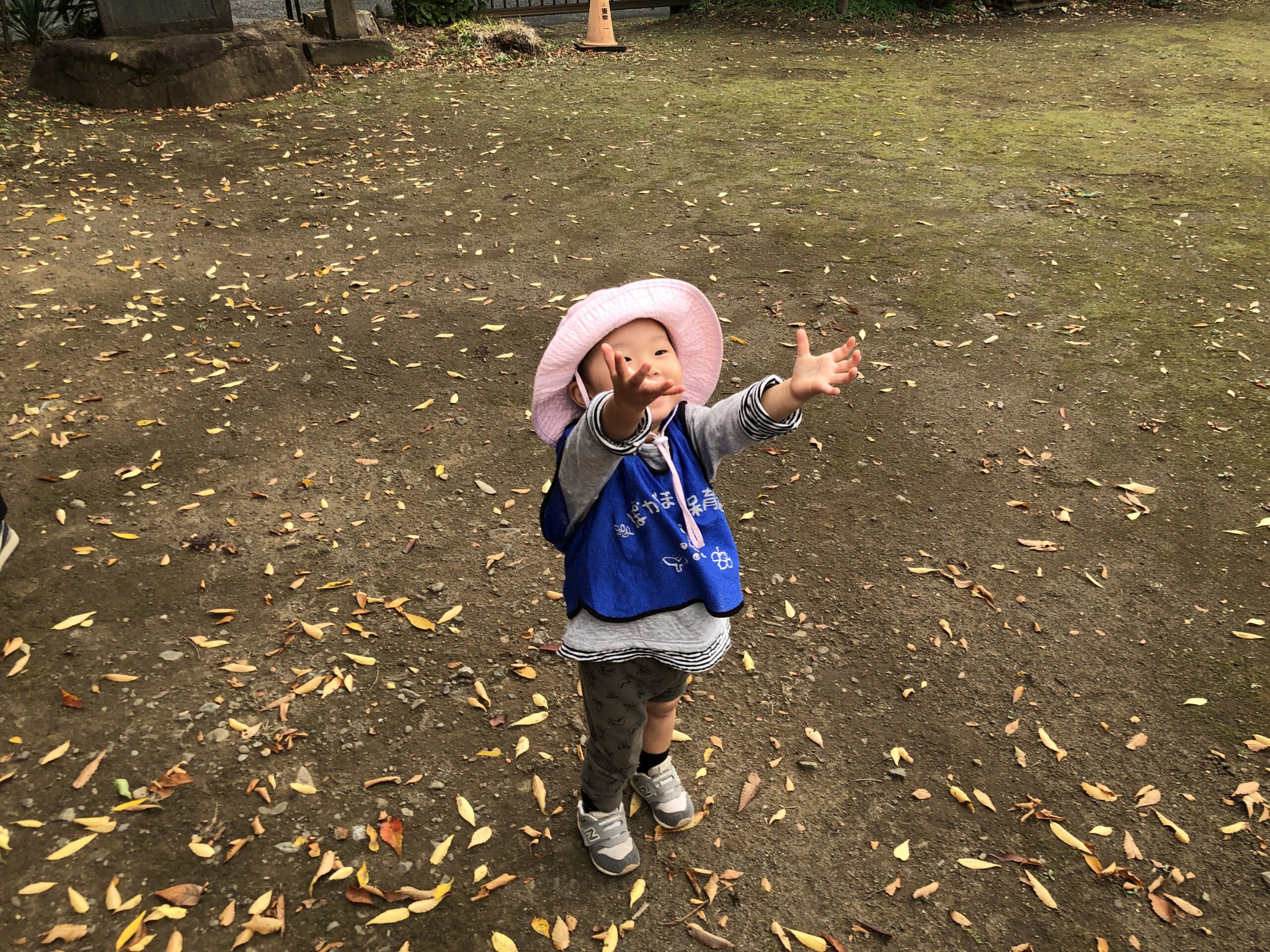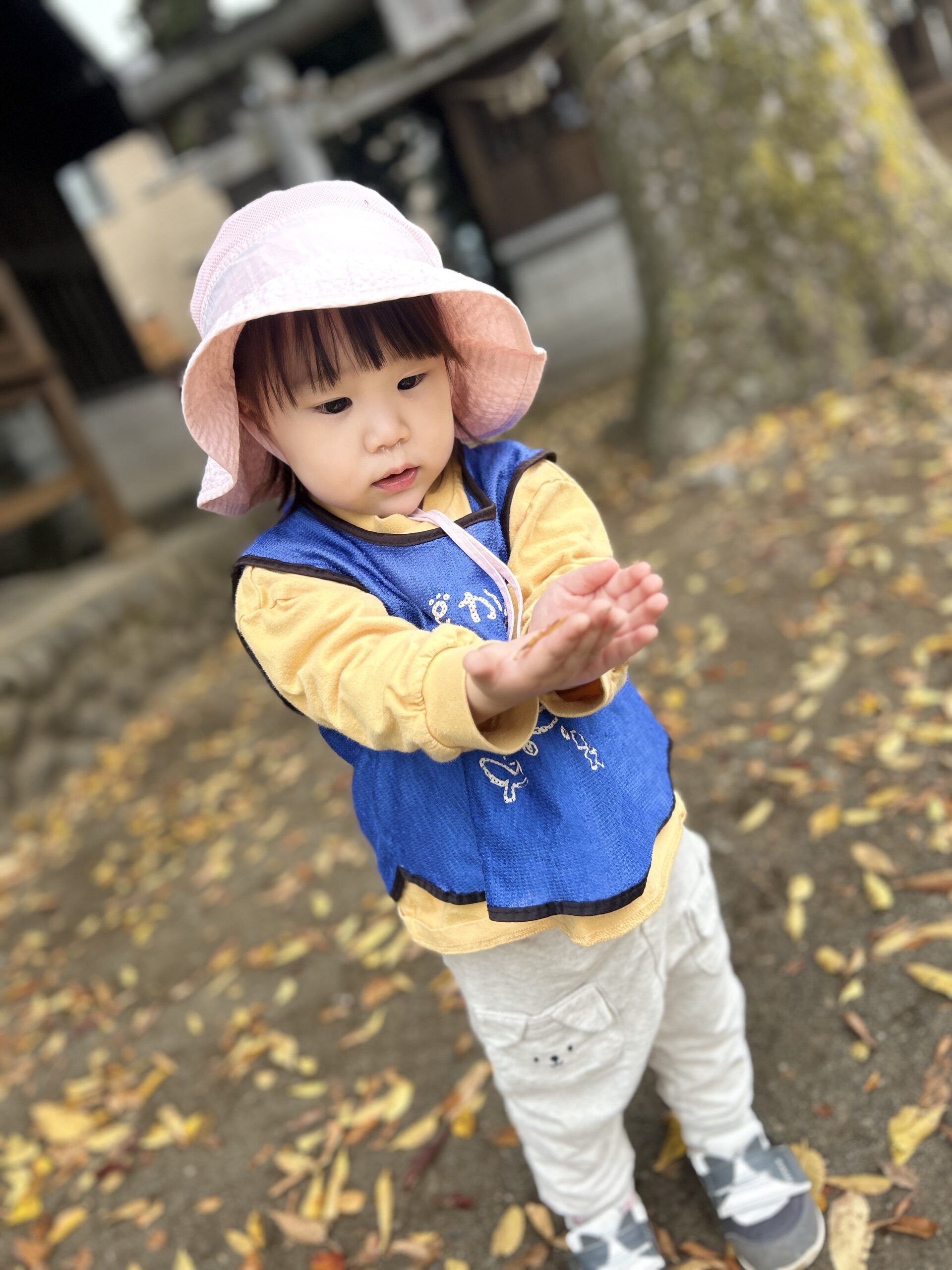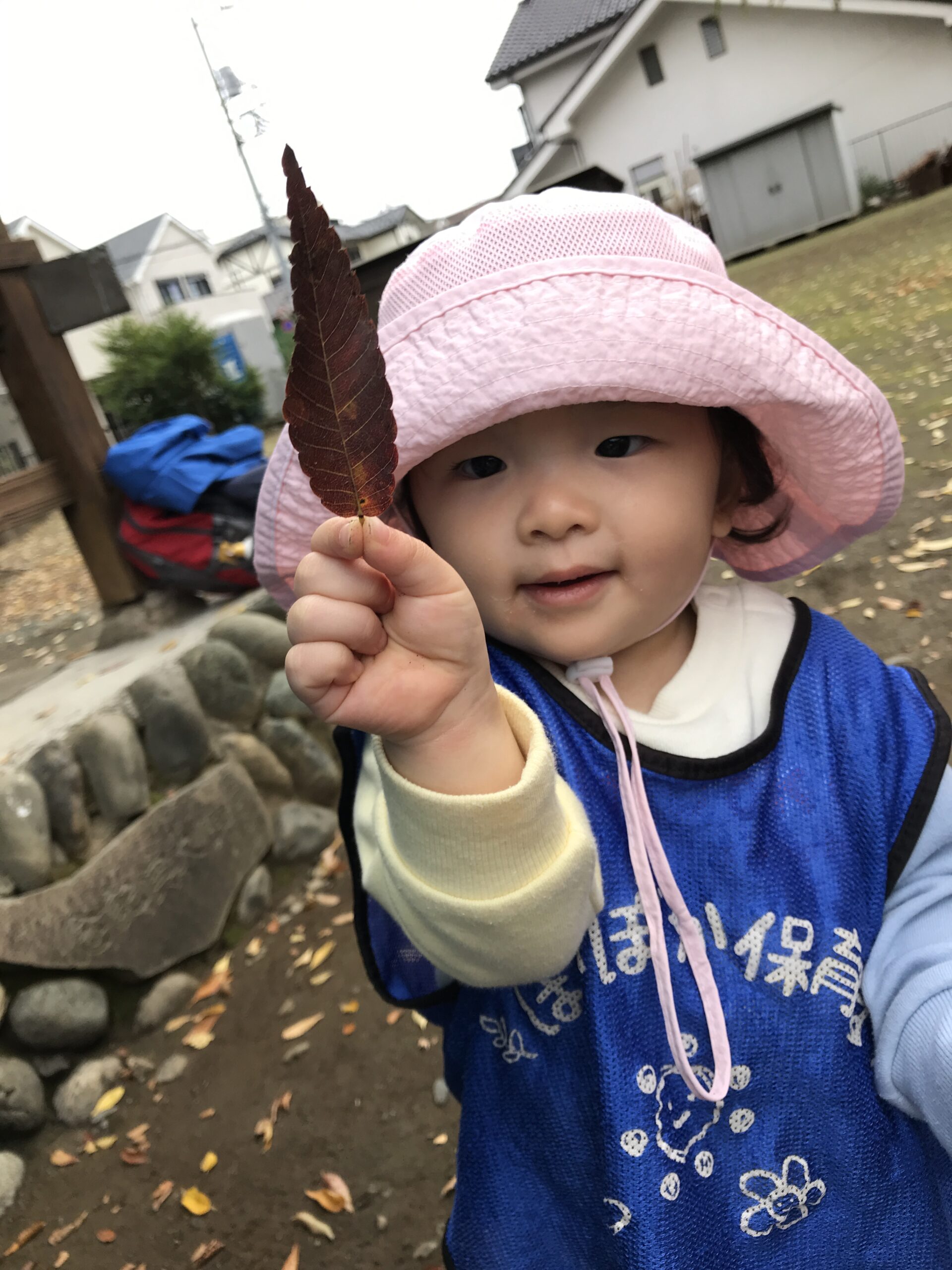 拾った黄色い葉っぱを見せながら「みて〜、葉っぱ」と笑顔で見せてくれました。