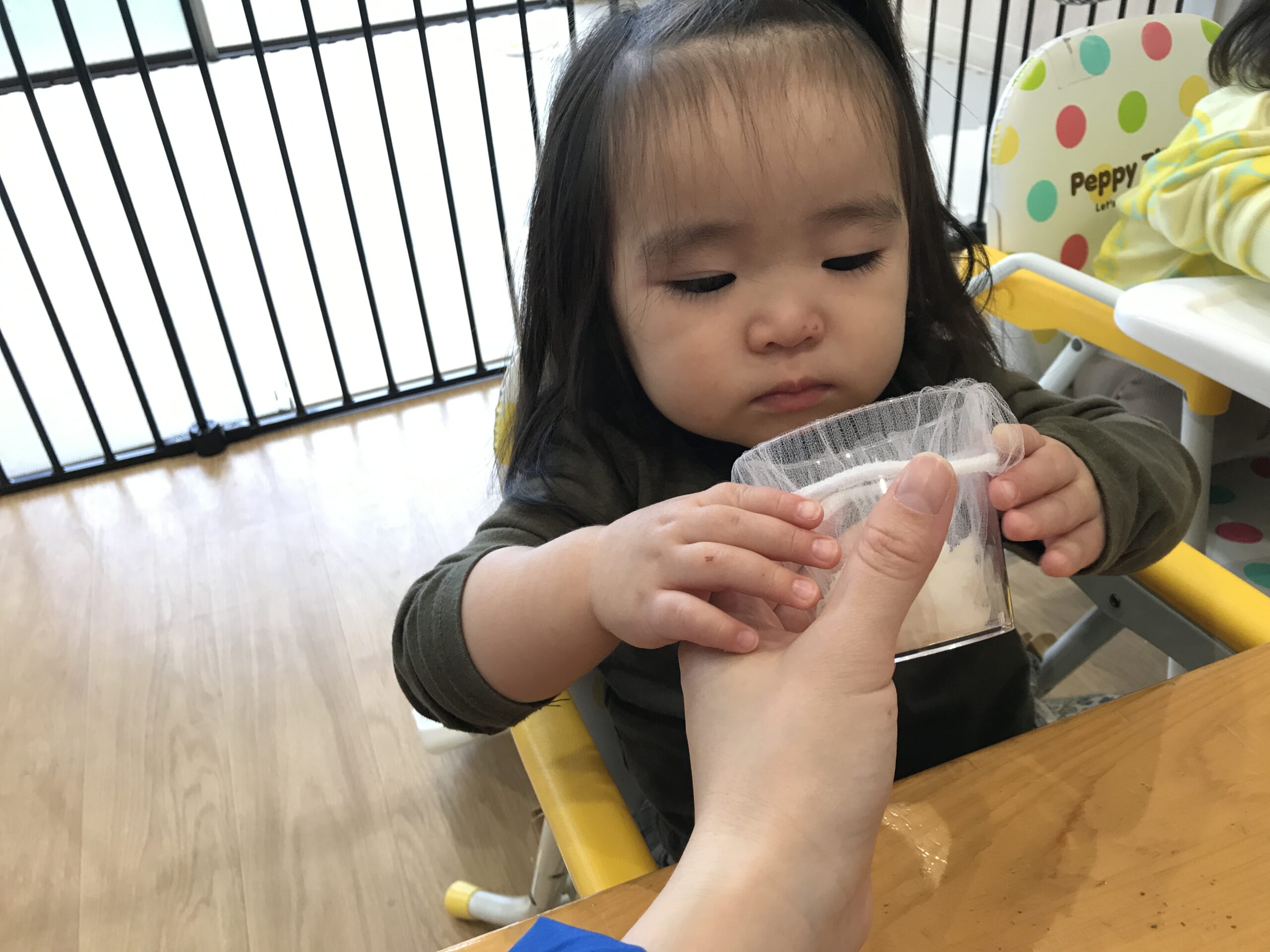 においを嗅いで「くさいね〜」「あまい?」と表情がくるくる変わります。食材のにおいや感触を通して、五感がぐんと広がっていきますね。