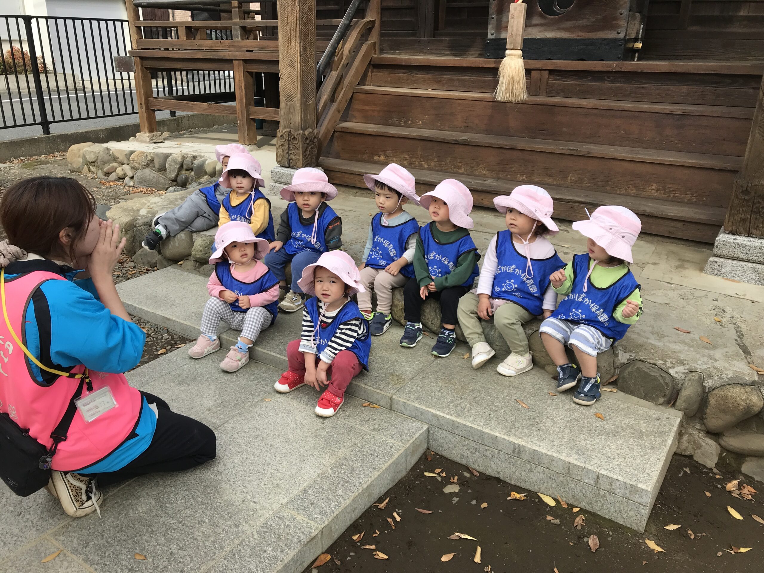 手をつないで歩きながら「バスー!」「おっきいね!」とお話しも弾みます。たっぷり身体を動かして、笑顔いっぱいの時間を過ごしました。