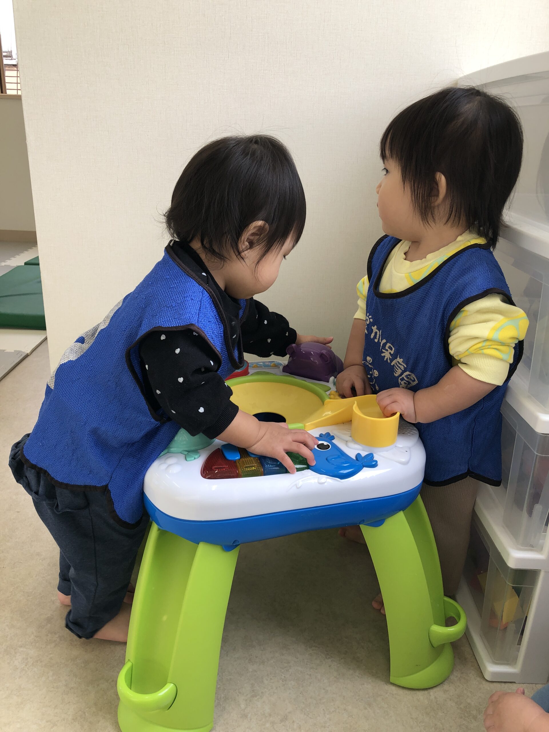 好きな遊具を出して遊び、先生と一緒に音の出るおもちゃを鳴らしてにっこり。先生が「いい音だね〜」と声をかけると、子どもも嬉しそうにカチカチと鳴らしていました。