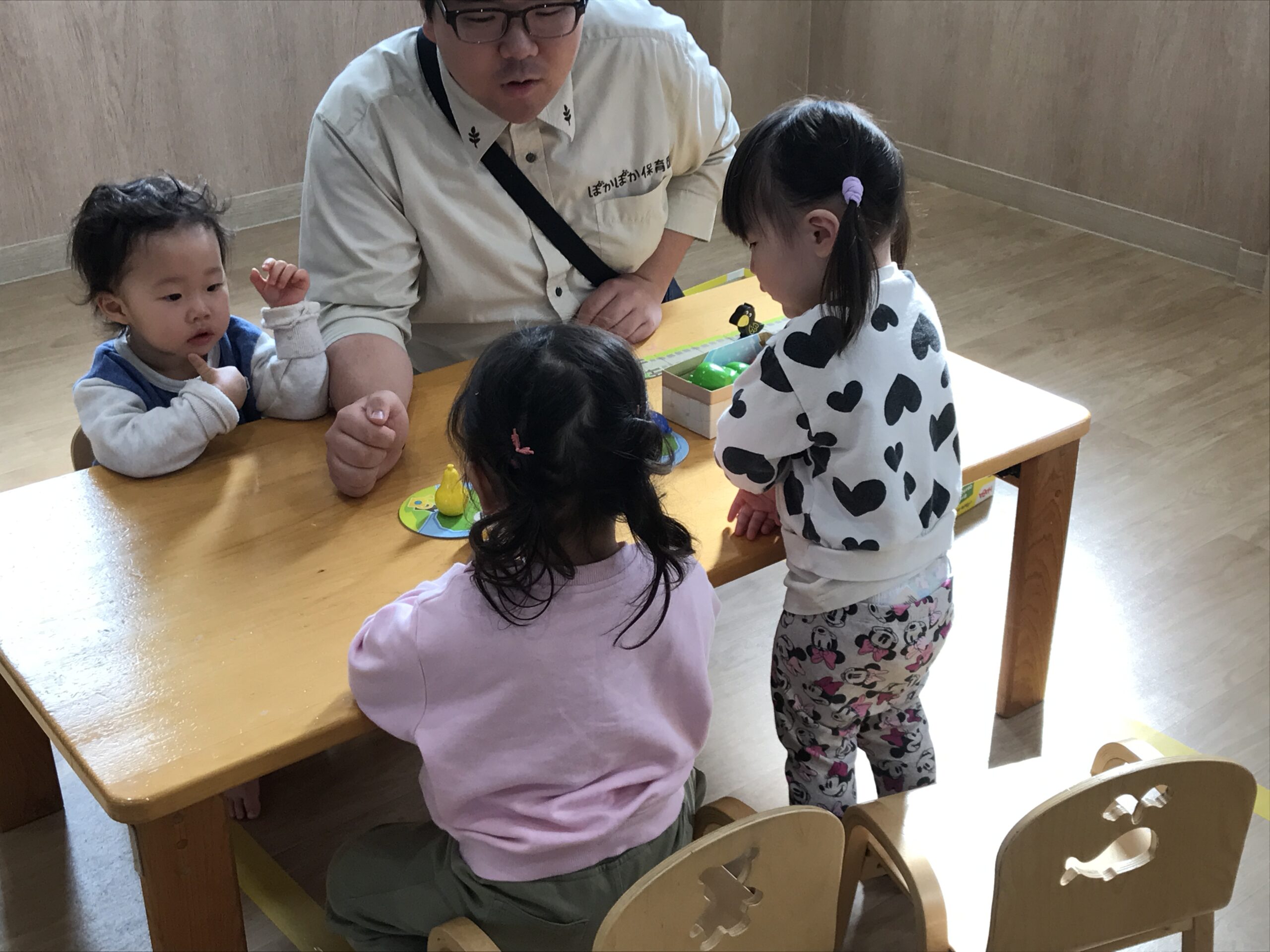 「今日は白いお洋服のお姉さん来るよ〜」と先生が声をかけると、1歳児のAくんは「だれくるの?」とワクワク顔。