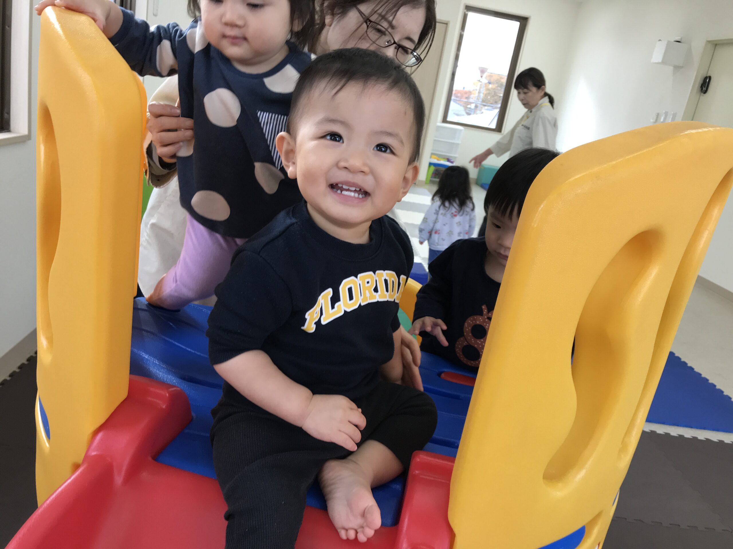 「たのしいね〜」と先生も一緒に遊び、笑い声が響いていました。