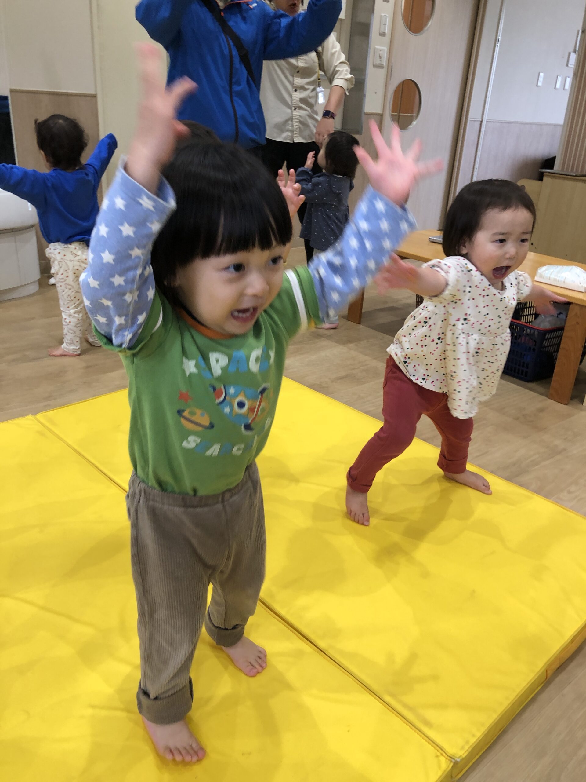 今日は朝から晴れて、元気いっぱいの0・1歳児たち。