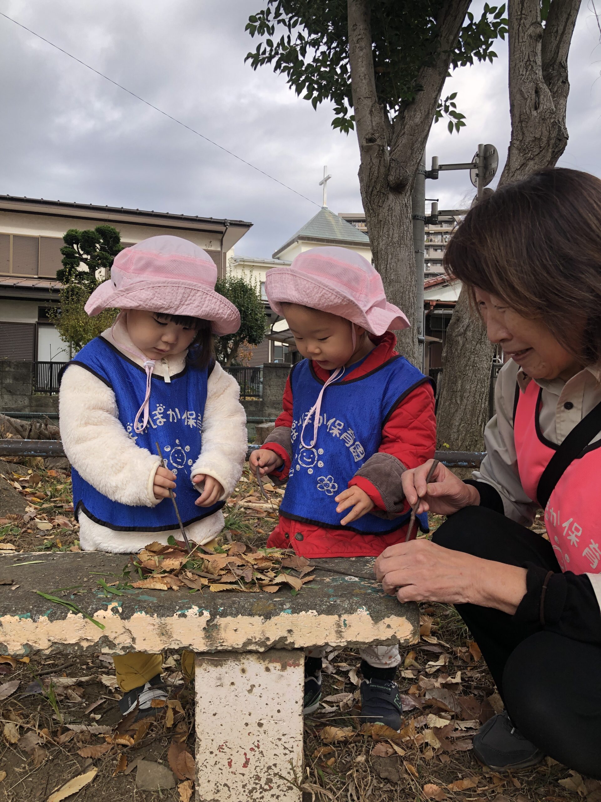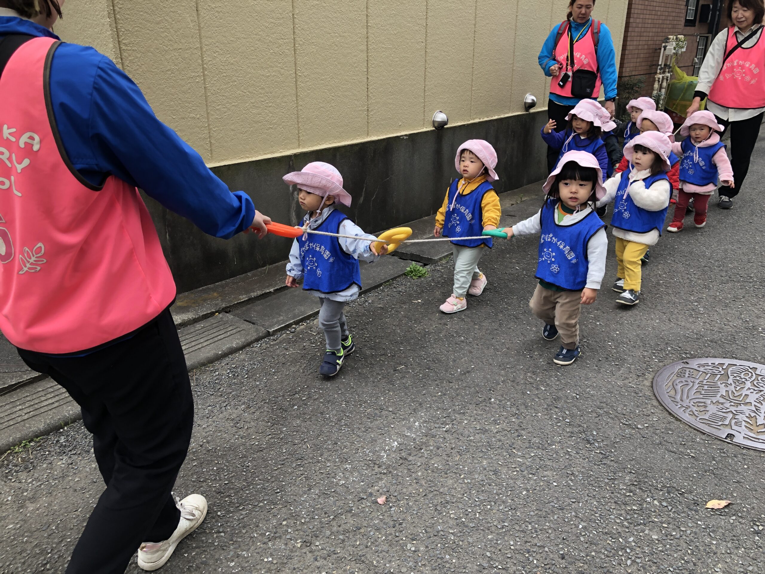 「おさんぽ行くよ〜」と先生が声をかけると、帽子をかぶって元気に外へ。