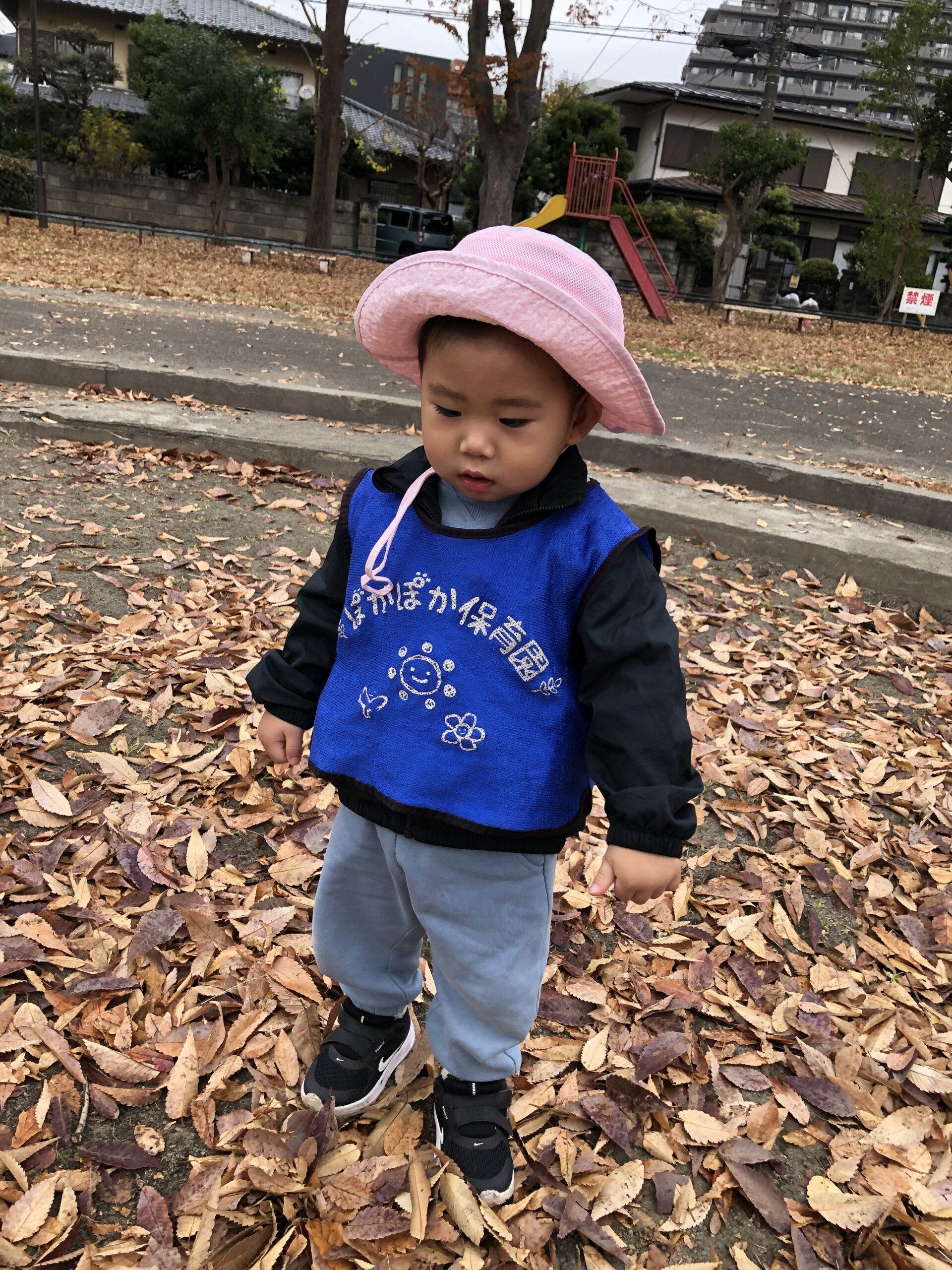 1歳児は音楽遊びの後、公園へ散歩。