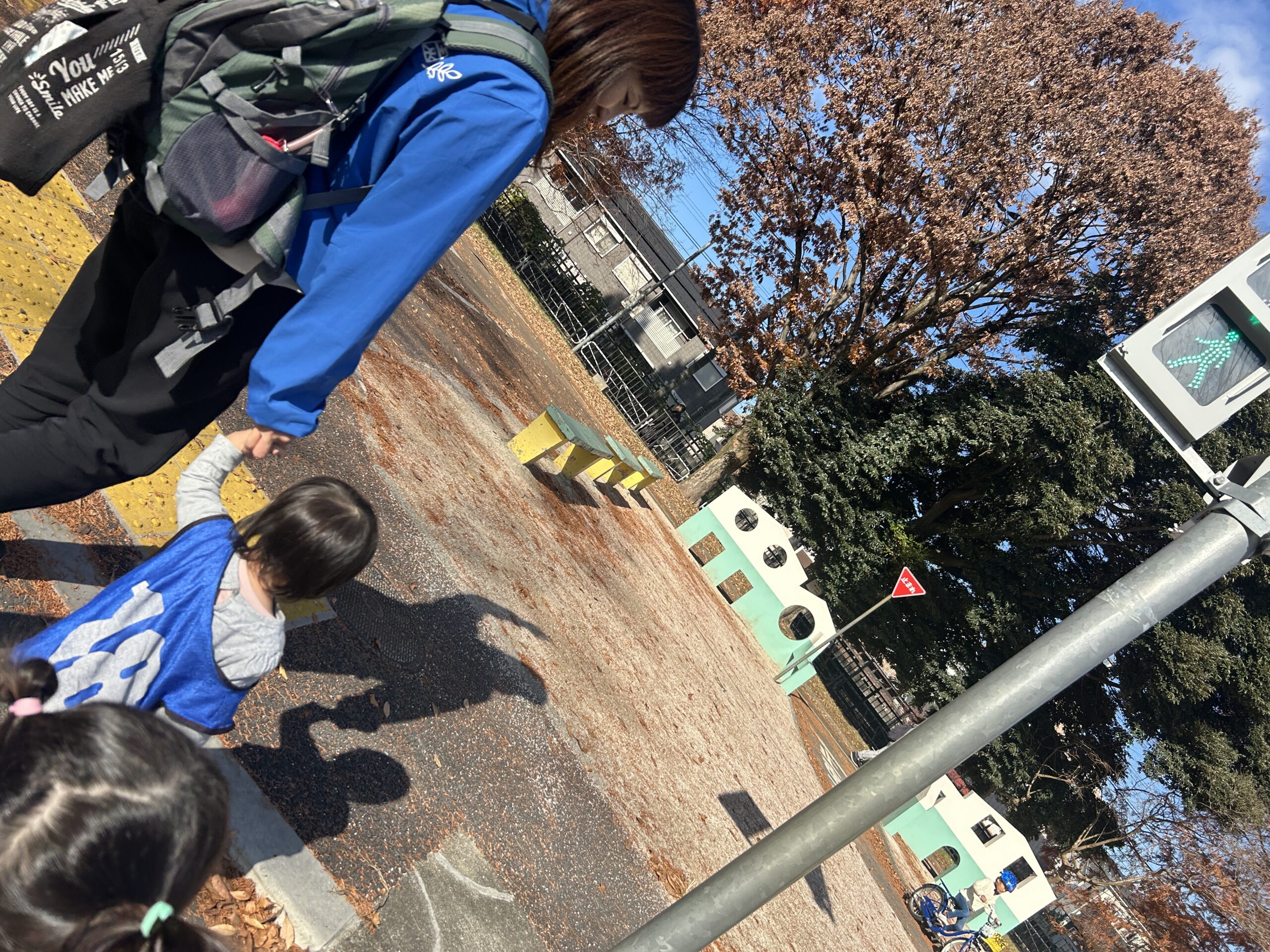 先生と手をつなぎながら白い線の上をゆっくり歩き、先生が「てをあげてわたろう」と声をかけると
