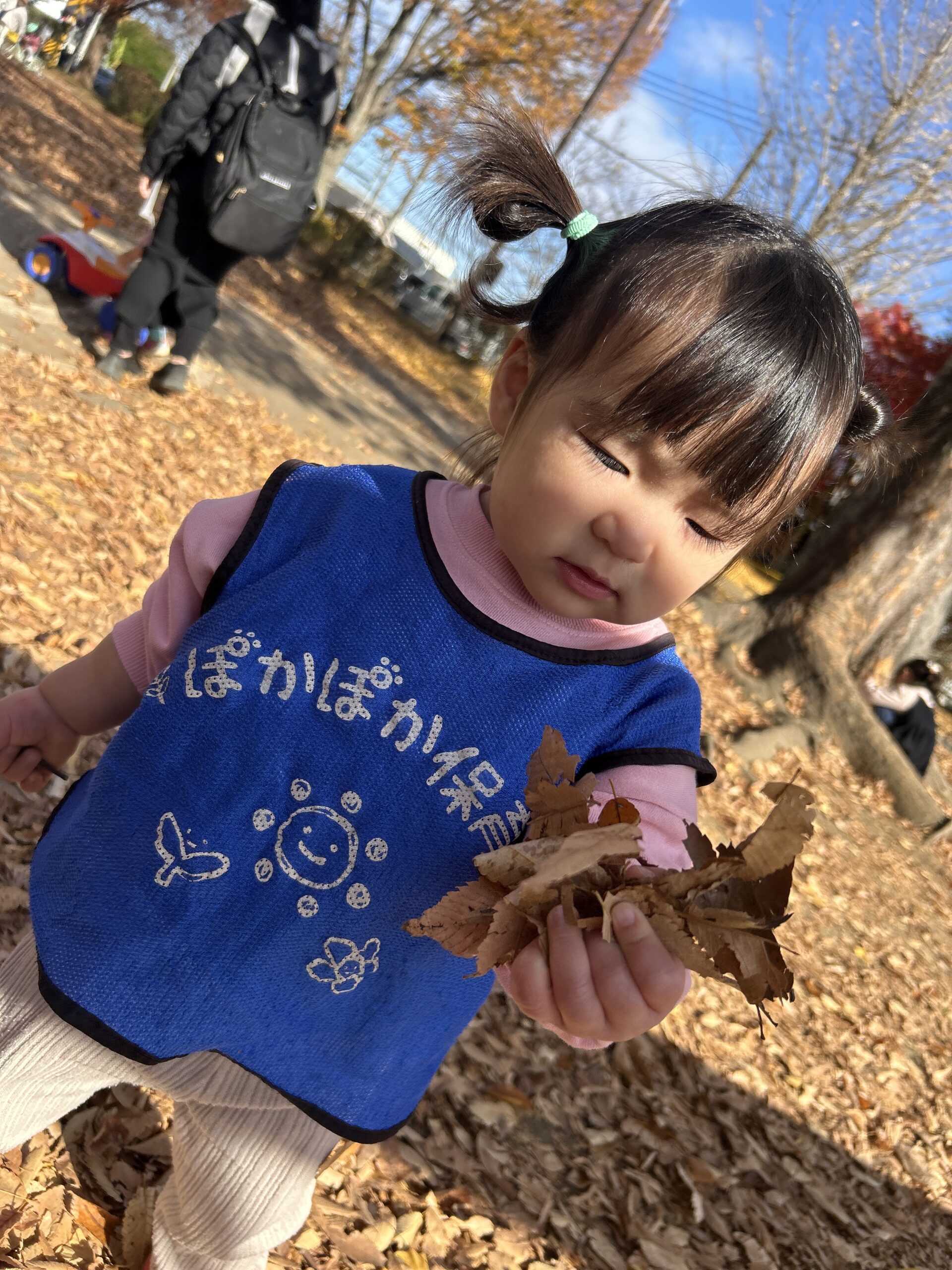 指でつまんでは落としたり、両手でぎゅっと持ってみたり、秋の手触りを楽しむ姿がありました。