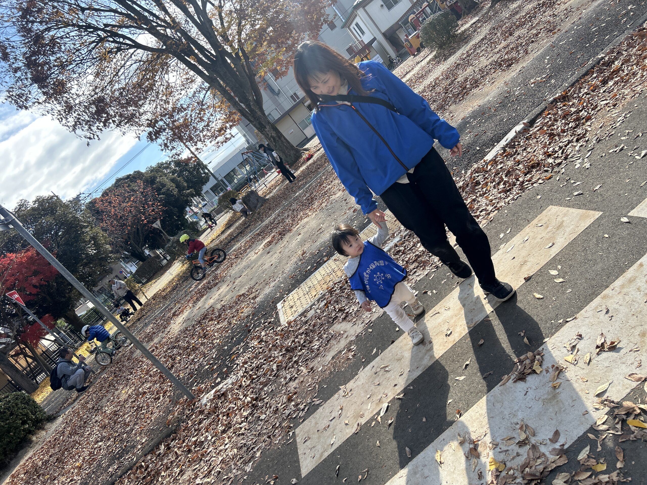 「カサカサー!」と先生が落ち葉を手で集めて見せると、子どもがまねして触りに来て