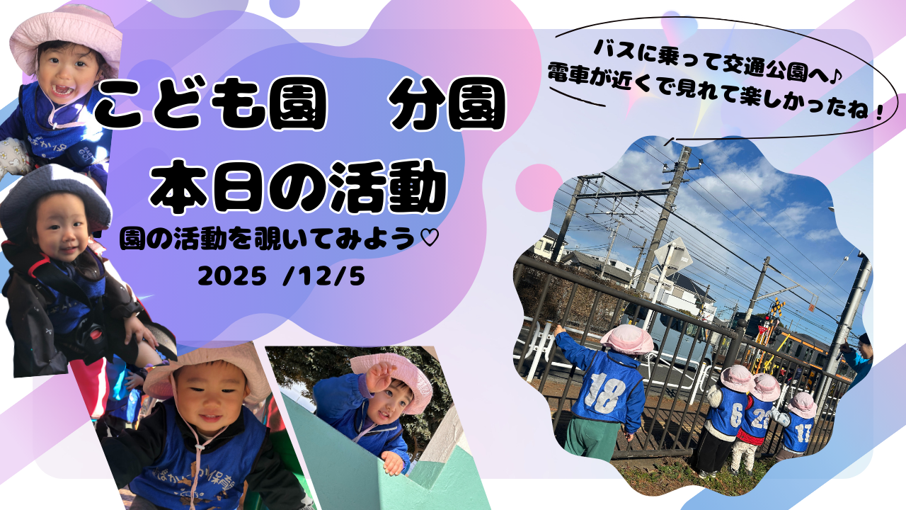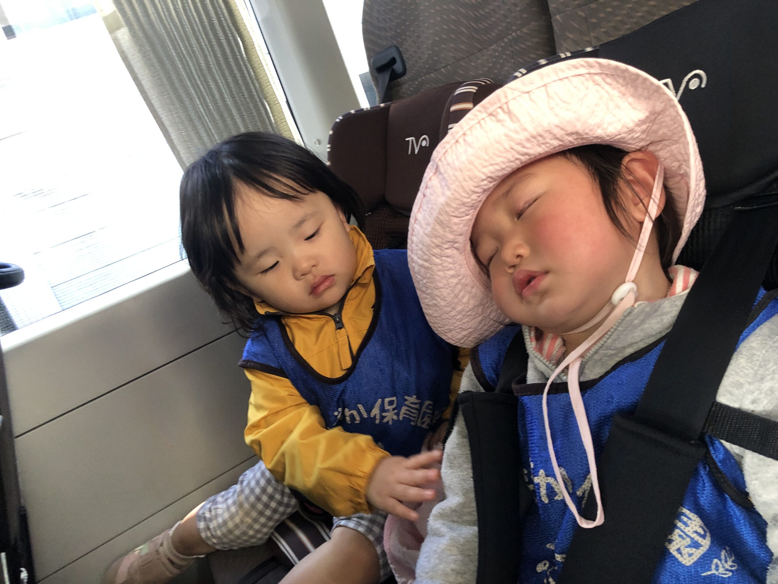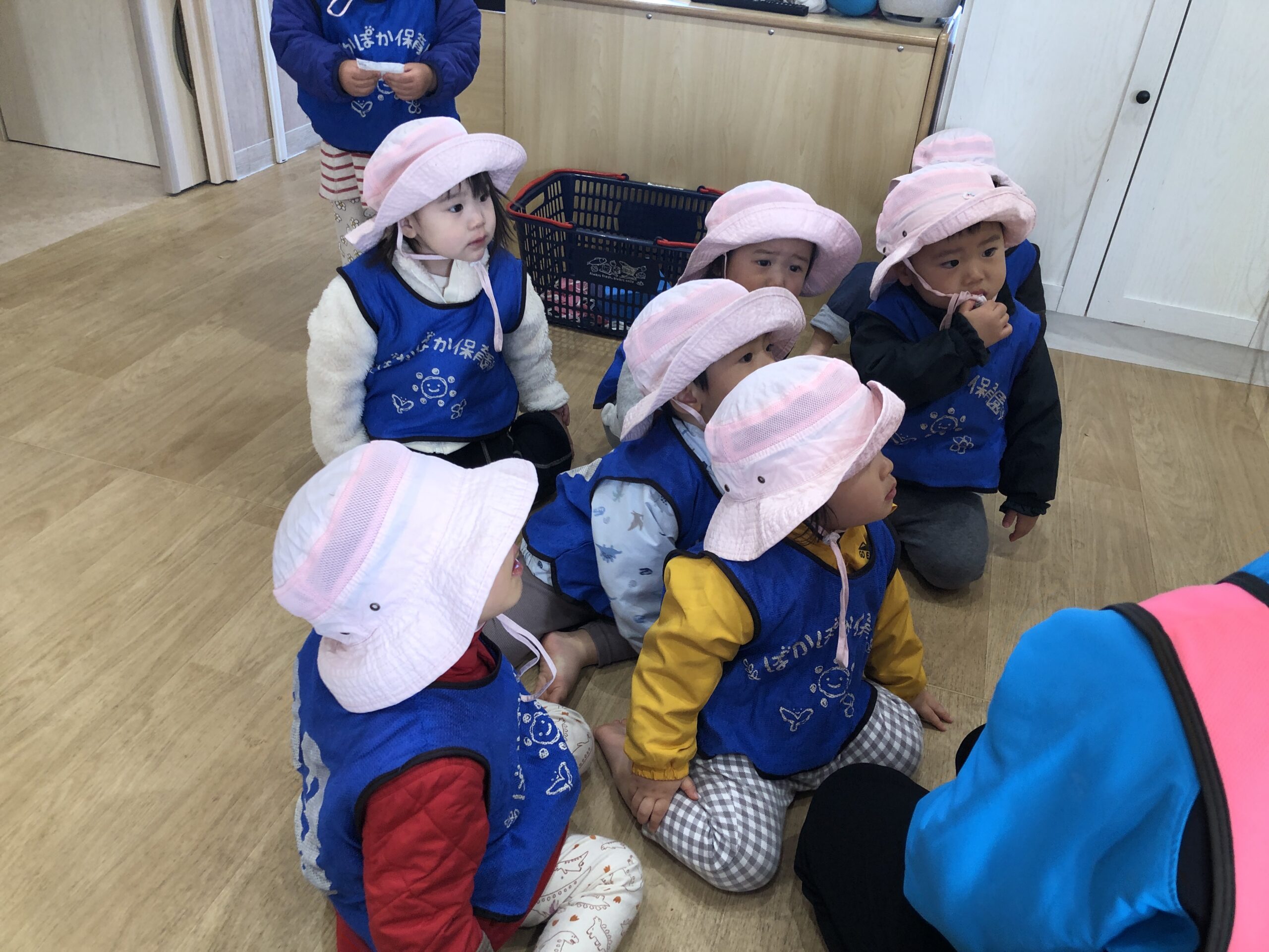 今日は0歳児の青空組と1歳児の虹組で、みんなそろってバスに乗ってお出かけしてきました。