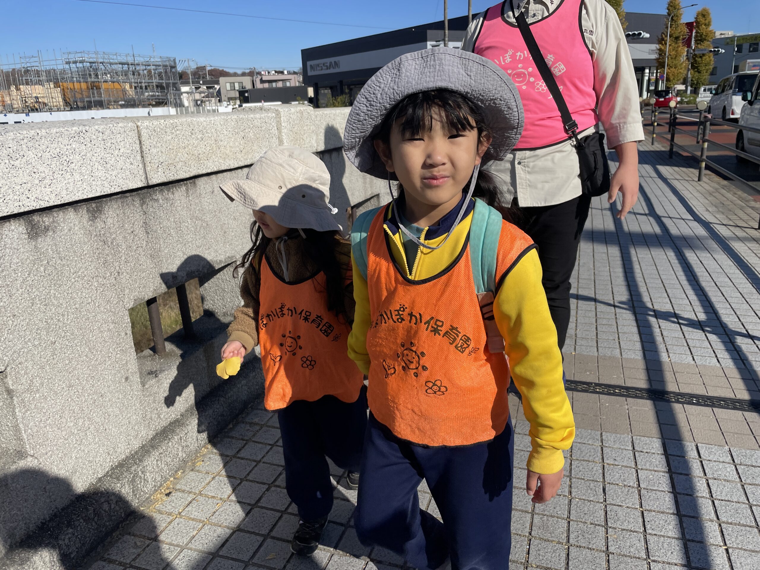 ぽかぽか保育園のみんなは、保育者と一緒に「今日はいっぱい歩いて公園まで行ってみよう!」と意気込んで出発しました。