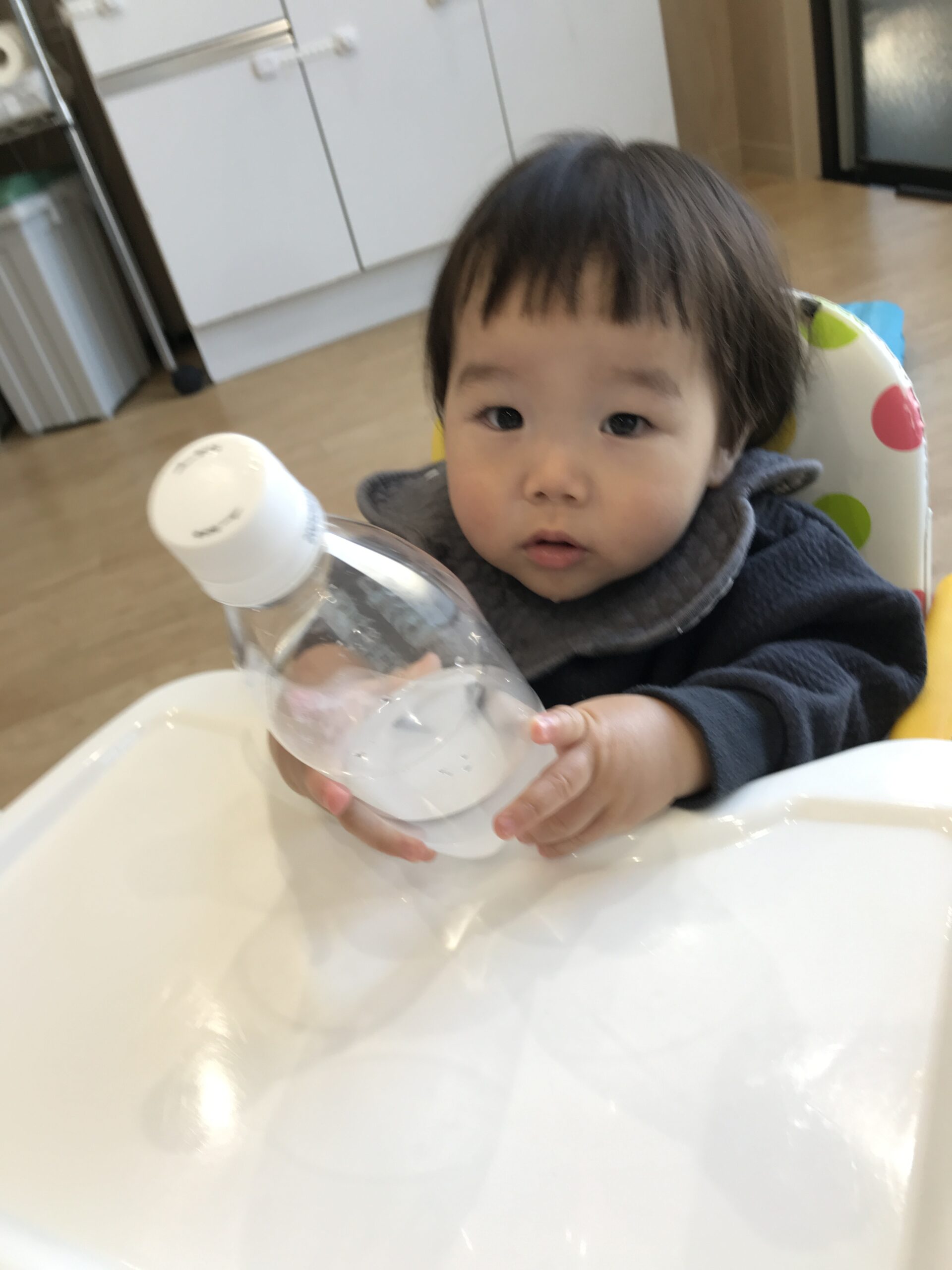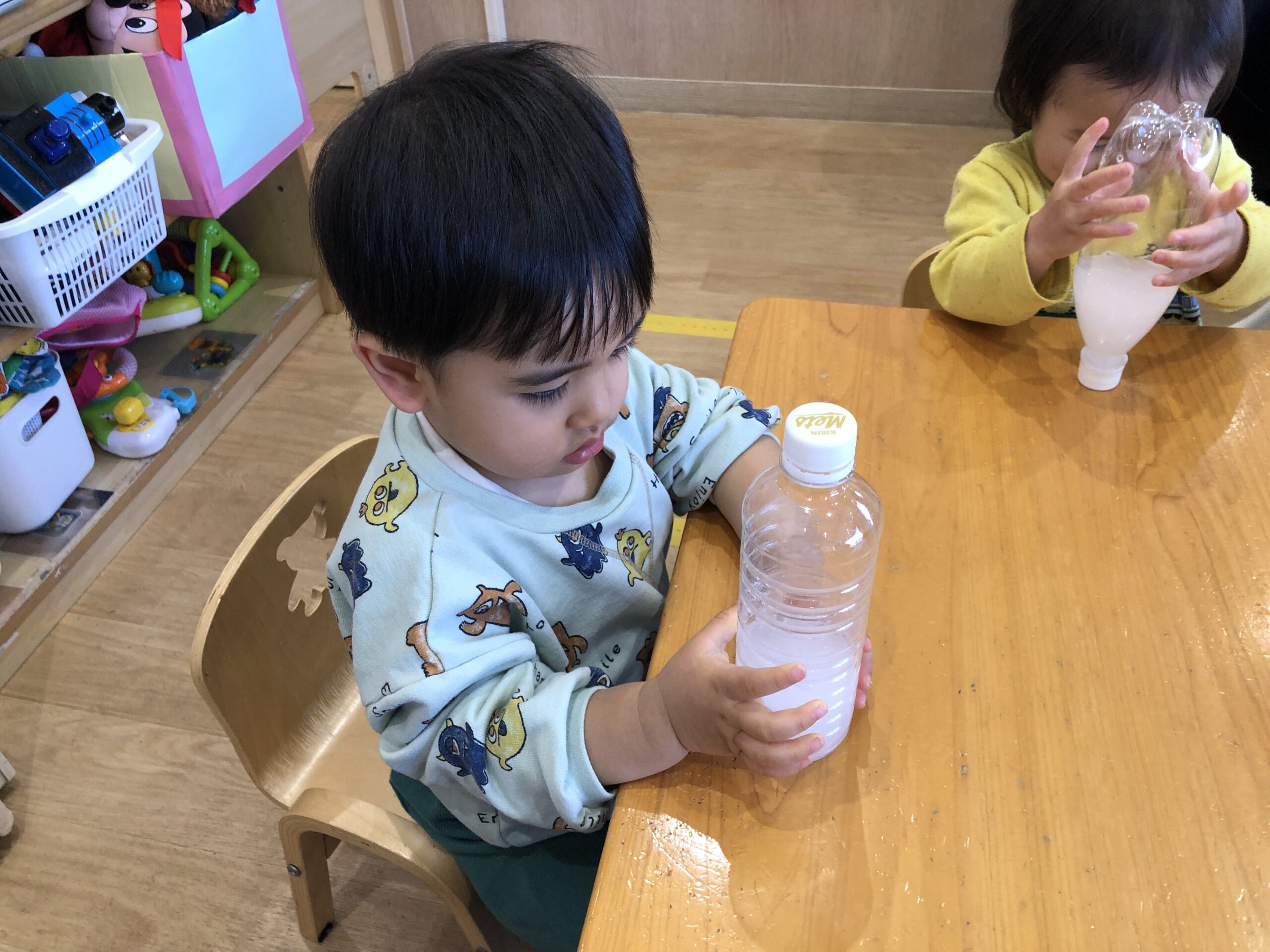 「みてみて~白くなってきたよ!」と1歳児の子どもが嬉しそうに見せると、0歳児の子どもも真似して一生懸命振っていました。