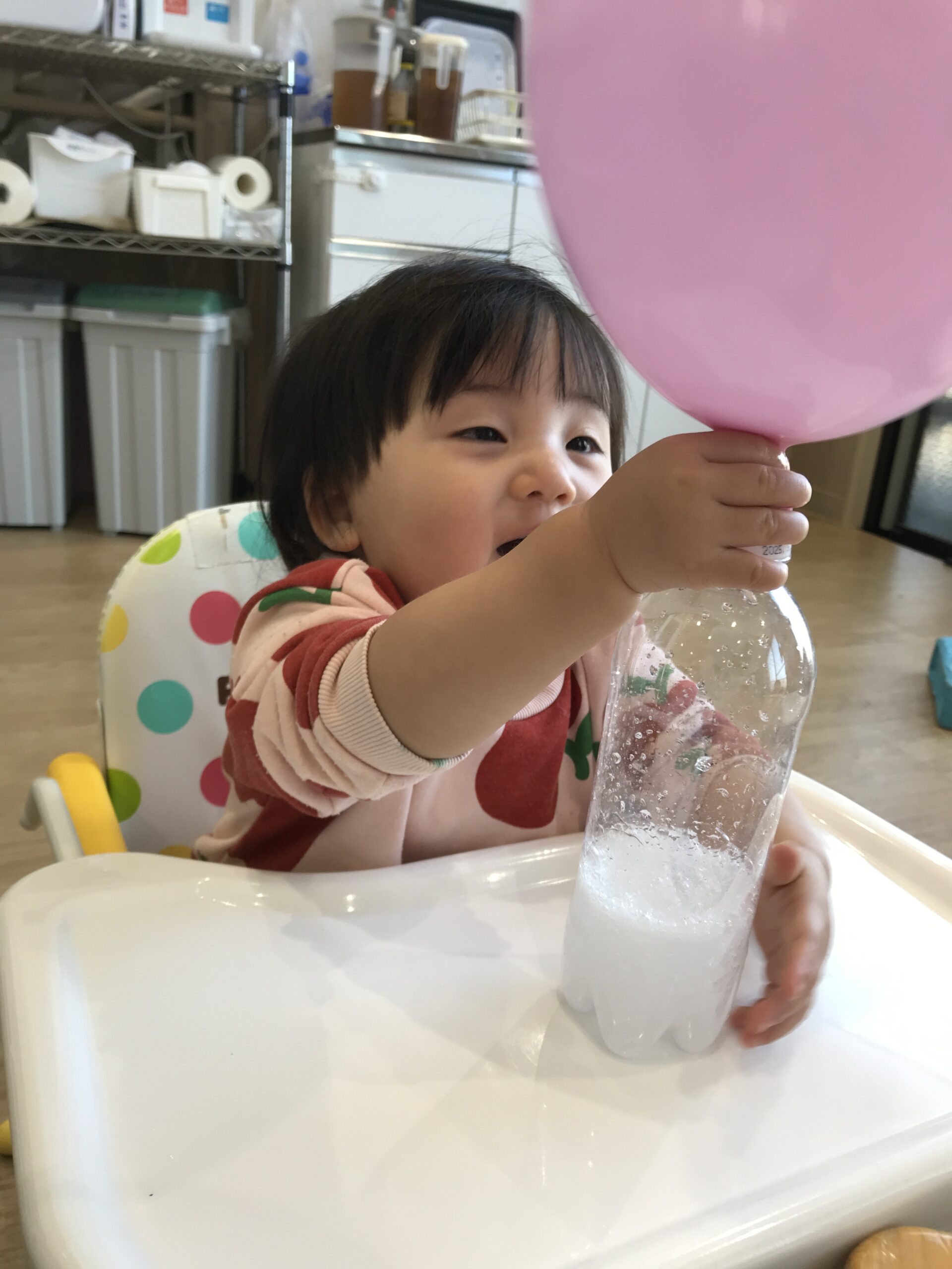 先生が「さあ、いくよ?風船の中の粉が“ぽとん”って落ちたら…どうなるかな?」と声をかけると、子どもはじーっとペットボトルを見つめていました。次の瞬間、ブクブクっと勢いよく泡が立ち、風船がぷくーっと膨らみはじめると、「うわ~!」と一斉に歓声。0歳児も目を丸くして大興奮していました。