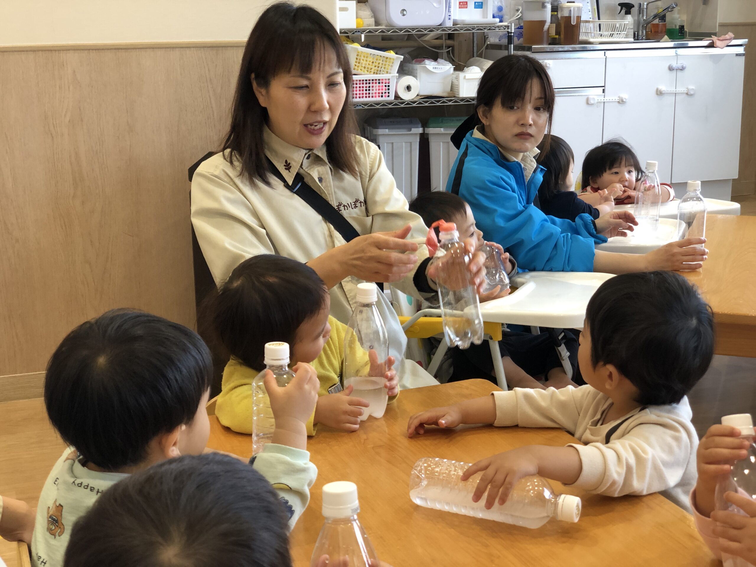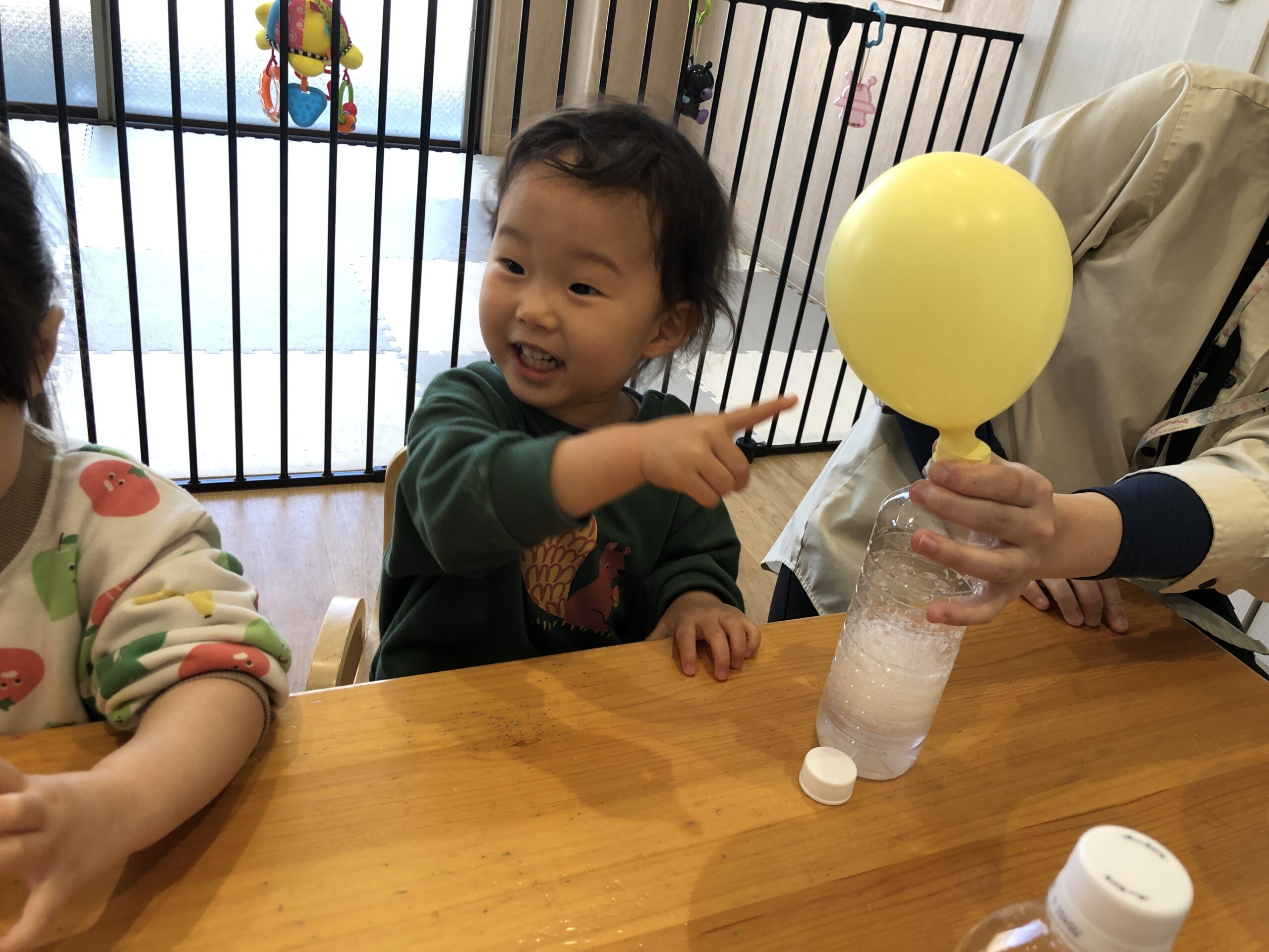 今日は晴れの光が気持ちよく入る保育室で、0歳児と1歳児の子どもが楽しみにしていたサイエンスがありました。