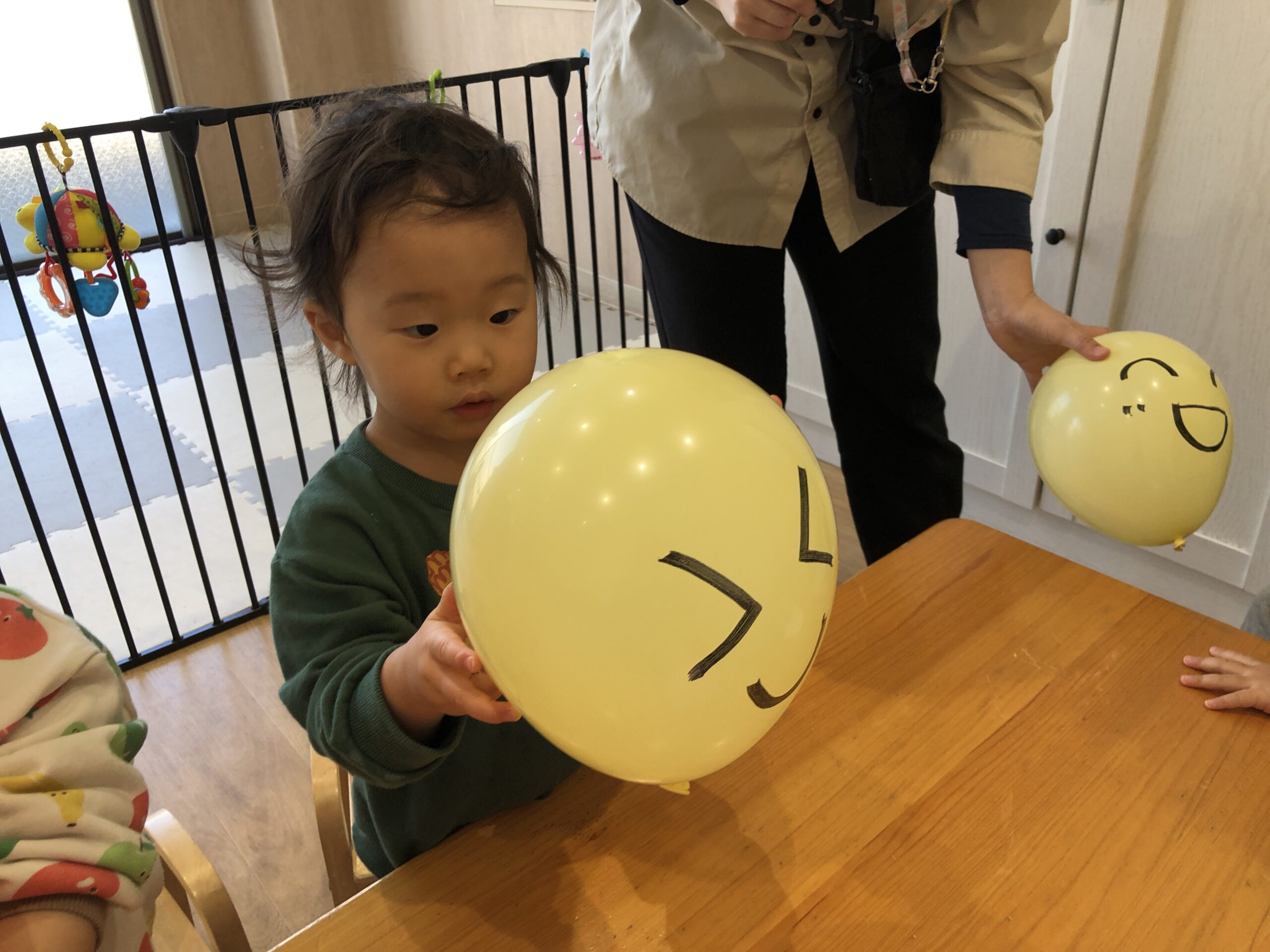 風船が膨らんだあとは、できあがった風船で遊ぶ時間に。先生が「お顔かいてあげようか?」と聞くと、子どもは「かいて~!」と嬉しそうにリクエスト。にっこり顔の風船を受け取った子どもは、大事そうに抱えたり、そっとポンポンしたりして楽しんでいました。