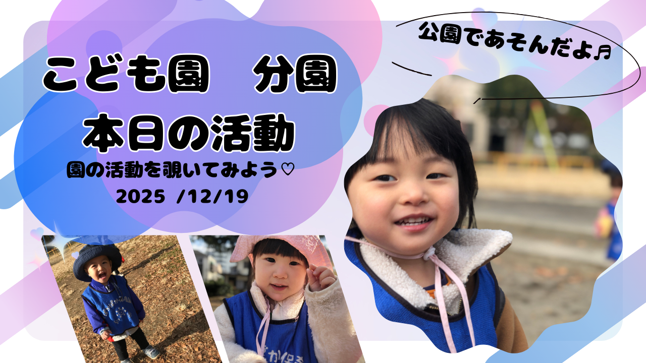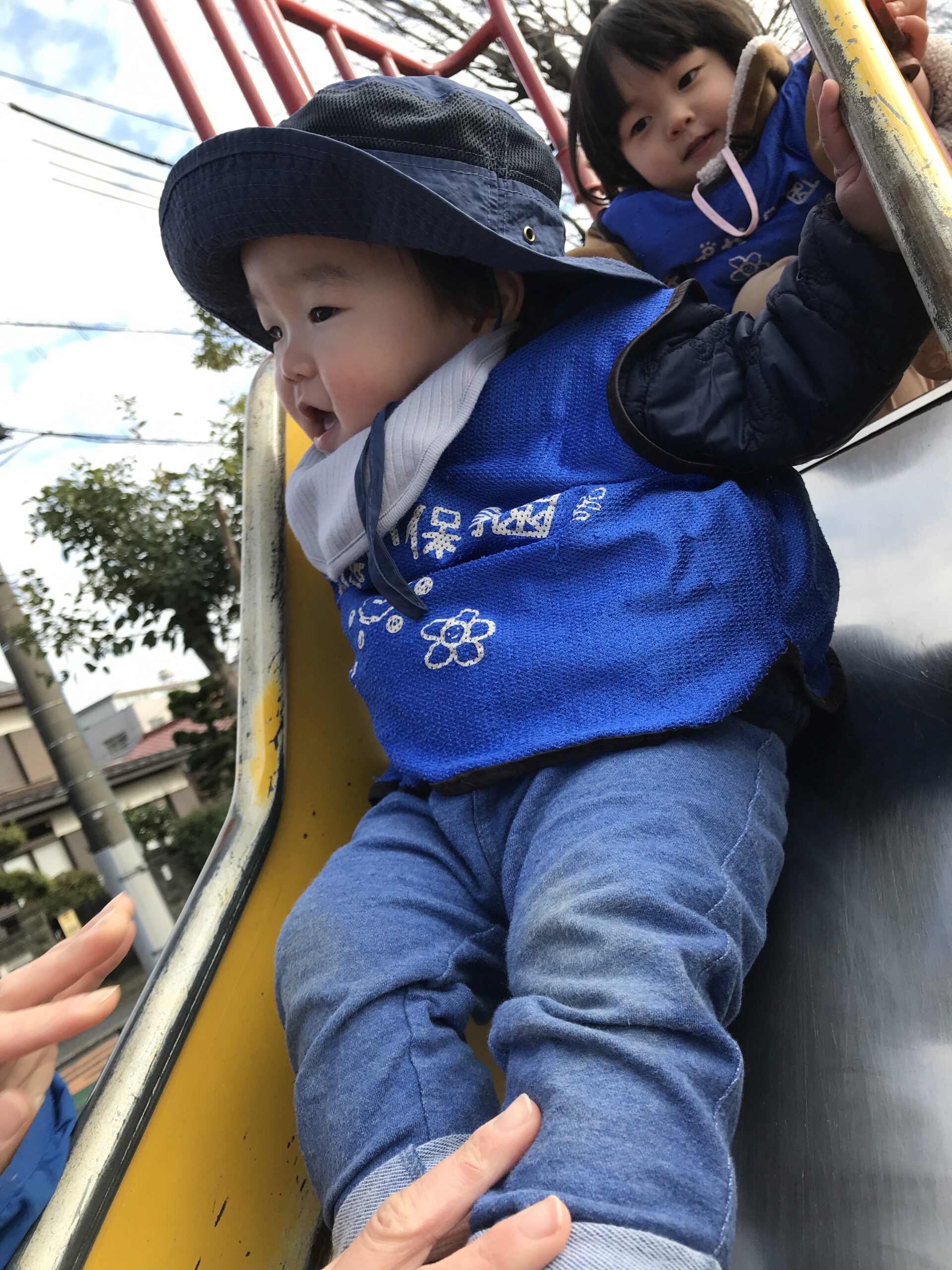 今日12月19日は、晴れた空の下で0歳児さんと1歳児さんみんな一緒に公園へ行きました。