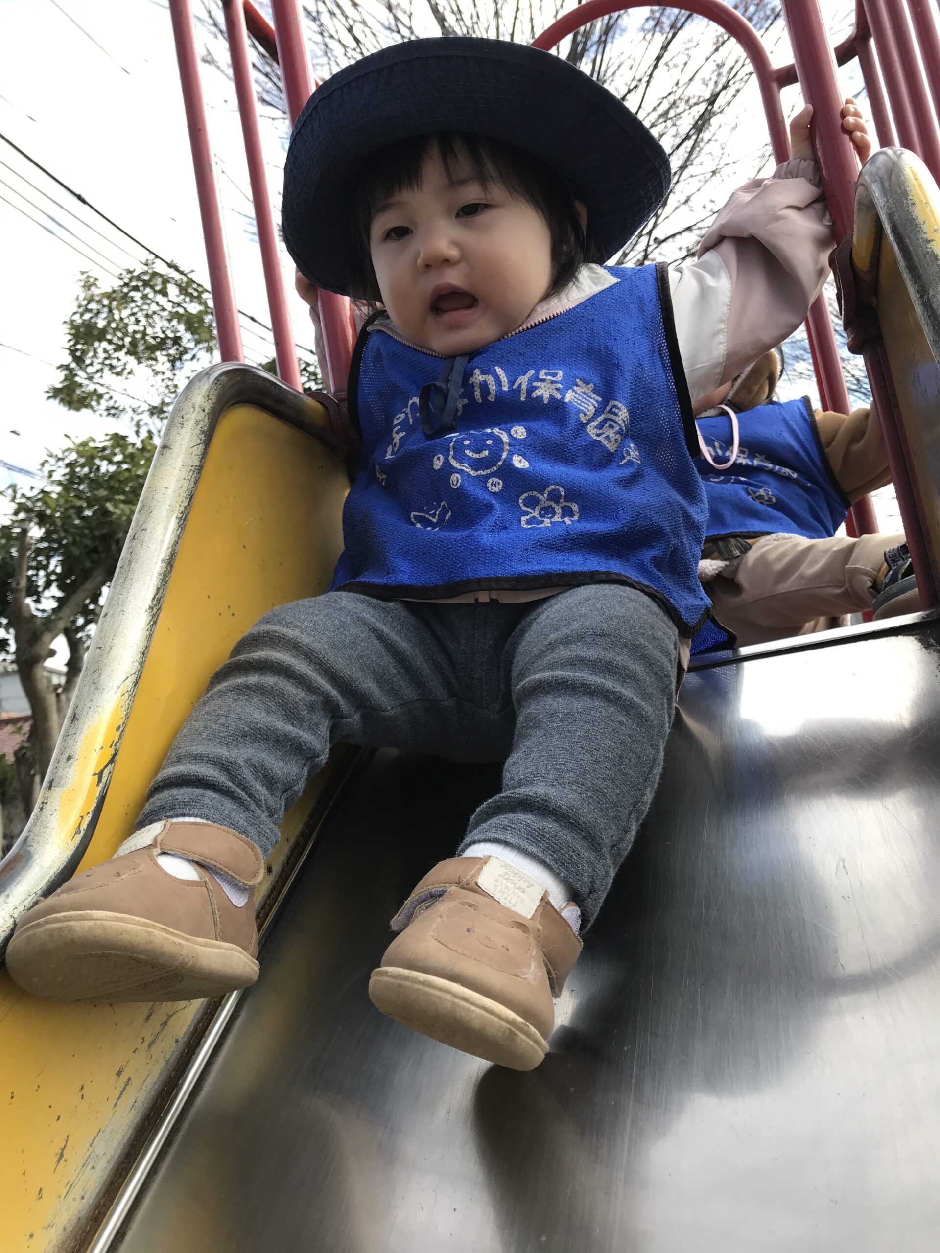 公園に着くと、まずは滑り台へ。「すべるよ、しゅー!」と先生が声をかけると、1歳児さんが楽しそうに挑戦。その姿を見ていた0歳児さんも、「やってみようかな」という表情で階段へ。先生が「ゆっくりでいいよ」と寄り添うと、安心して座り、上手に滑ることができました。「できたね!」と拍手すると、子どももにっこり。幼児教育の基礎は、こうした小さな成功体験の積み重ねだなと感じます。