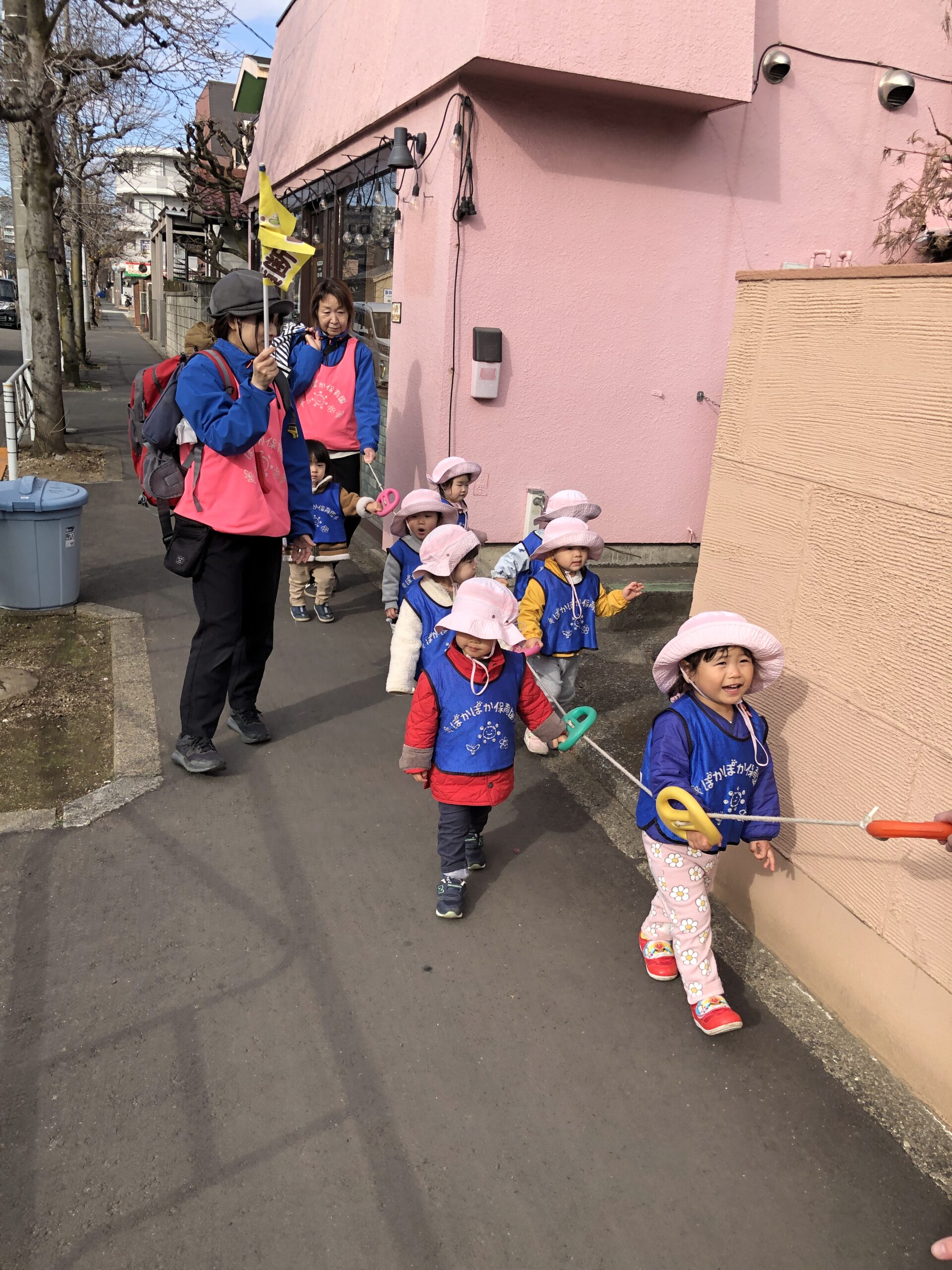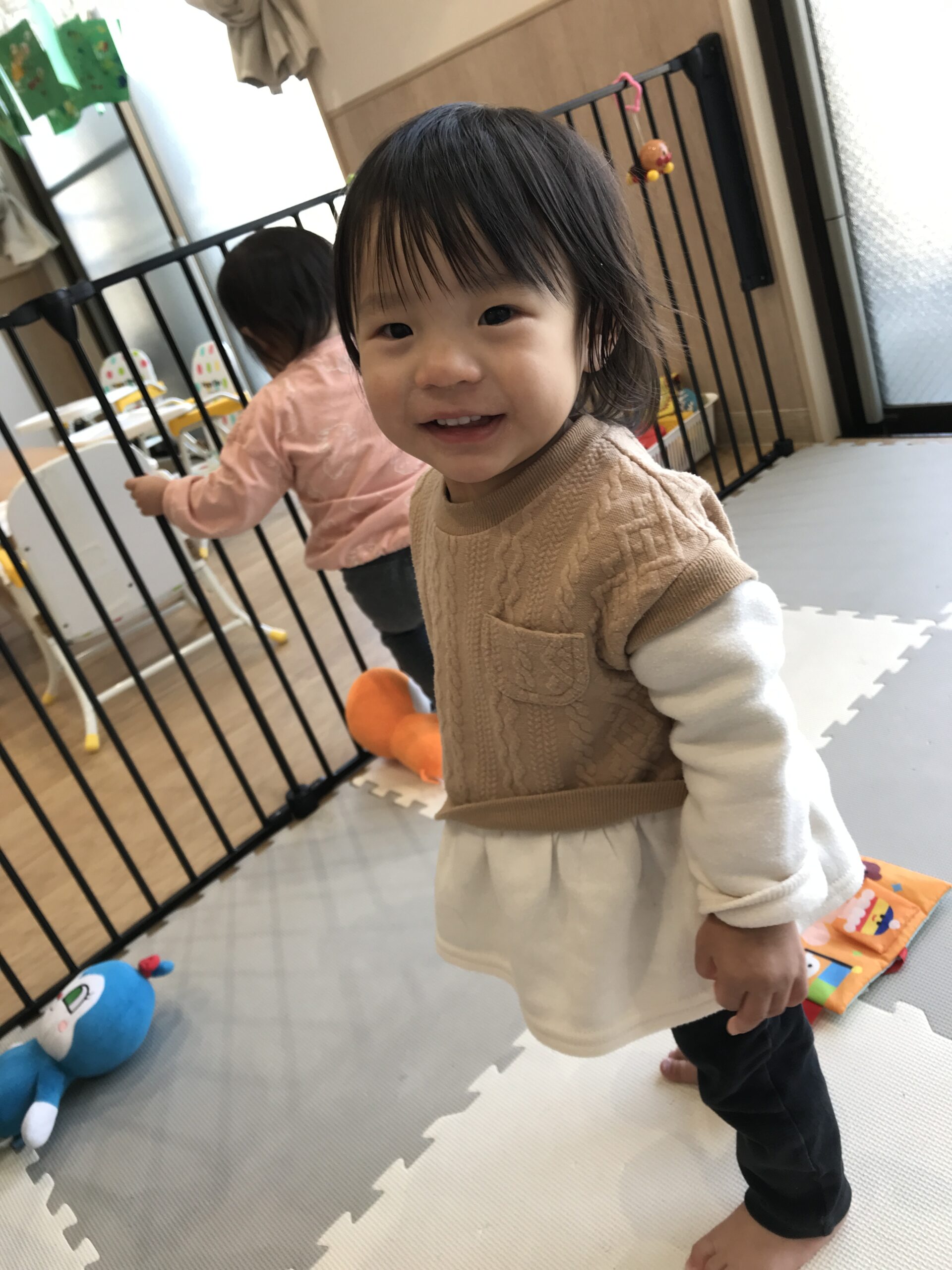 公園までの道では、1歳児さんがお散歩ロープに挑戦。「ロープぎゅってできるかな?」と先生が聞くと、「できたよ!」と誇らしそう。最初は戸惑っていた子どもも、毎日の積み重ねで少しずつ慣れてきていて、乳児保育ならではの成長を感じます。個別対応保育を大切にしながら、無理なく進めています。