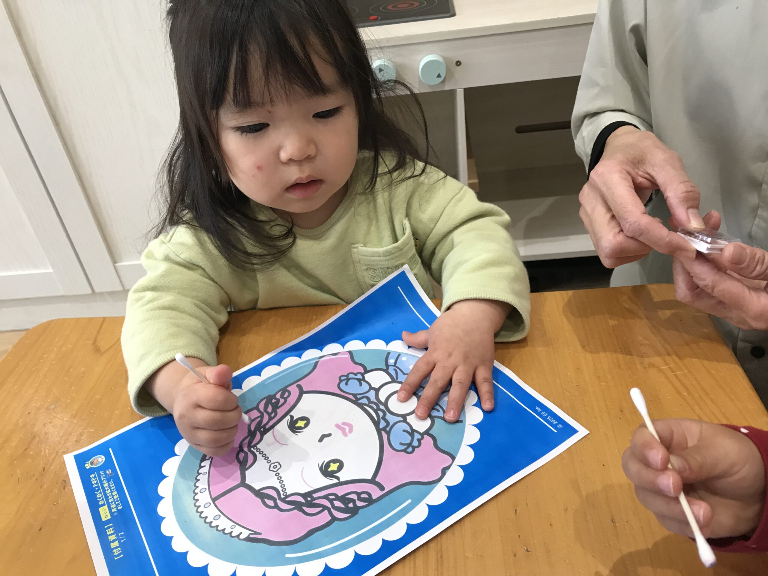 子供たちは慎重に綿棒を持ち、そーっとイラストに触れました。