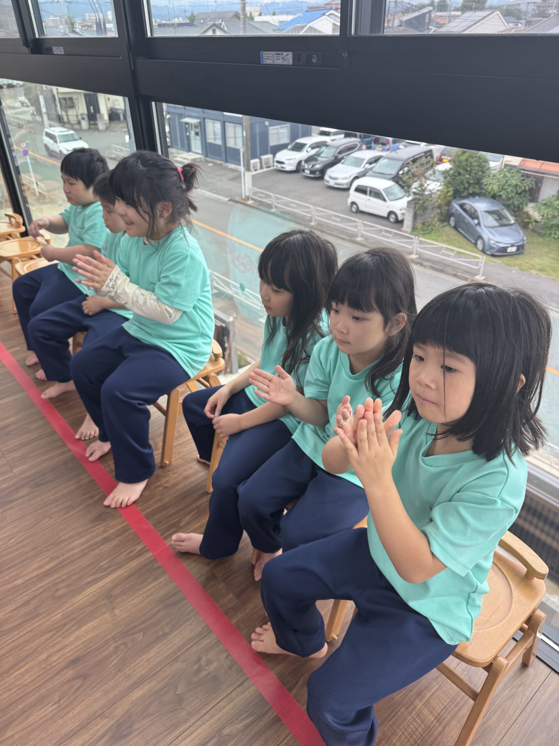 「リズムまねっこあそび」では久しぶりにボディパーカッションにチャレンジ!4,5歳では難易度を上げて、2チームに分けて違うリズムを絡めるという内容にチャレンジしてみました!