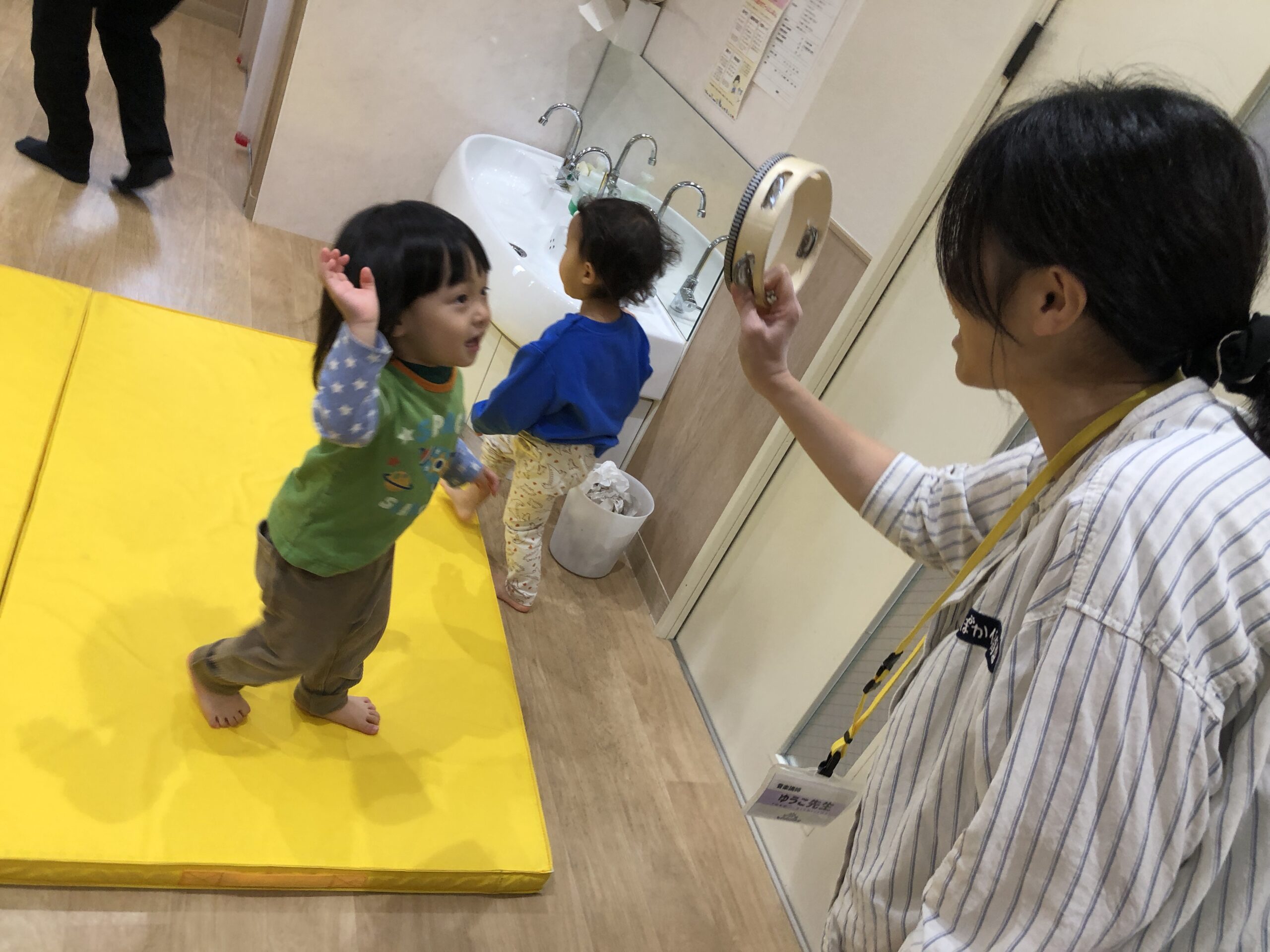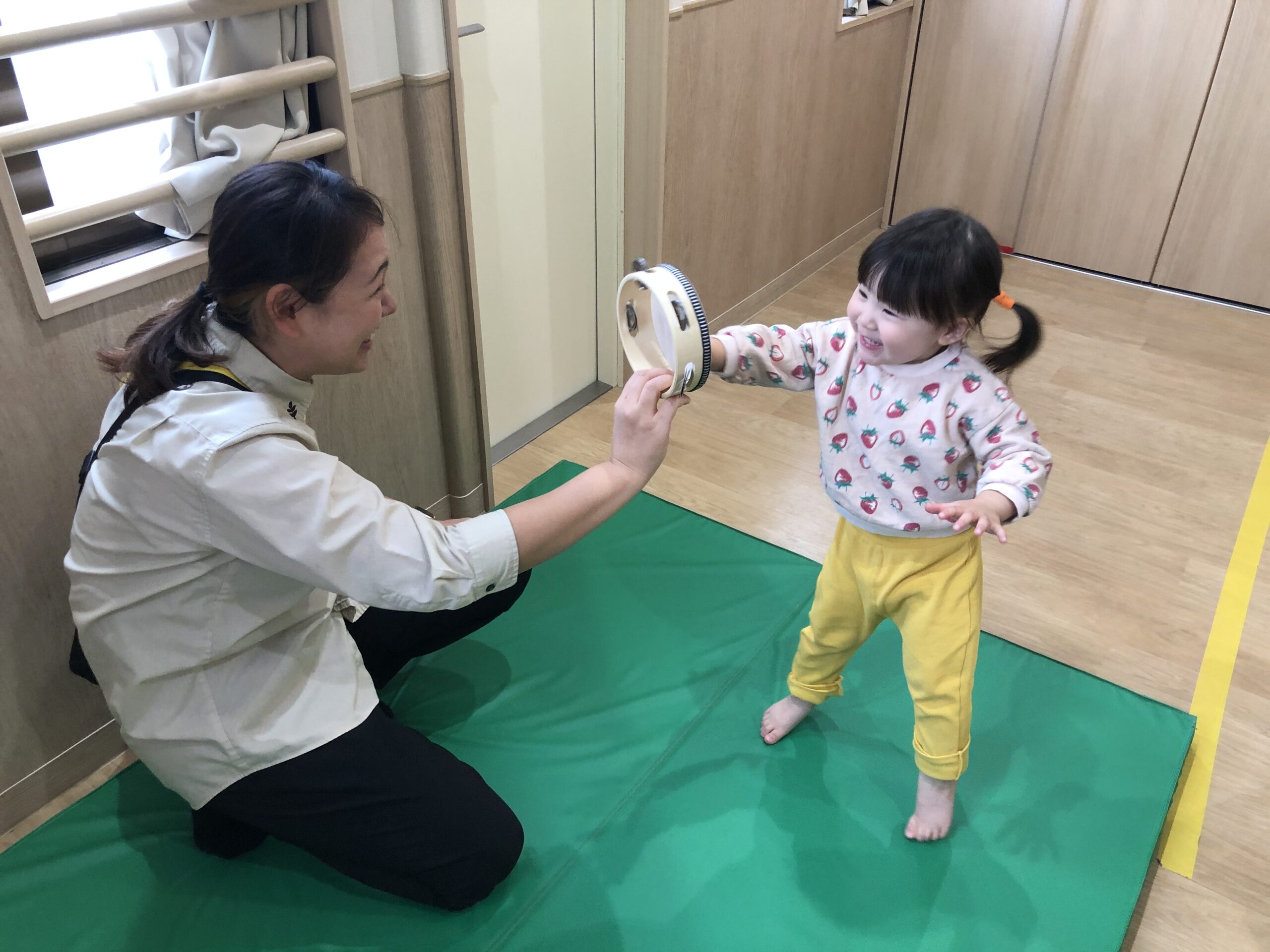 緑のマットから、タンブリンを持っている大好きな先生の所へ大移動!!