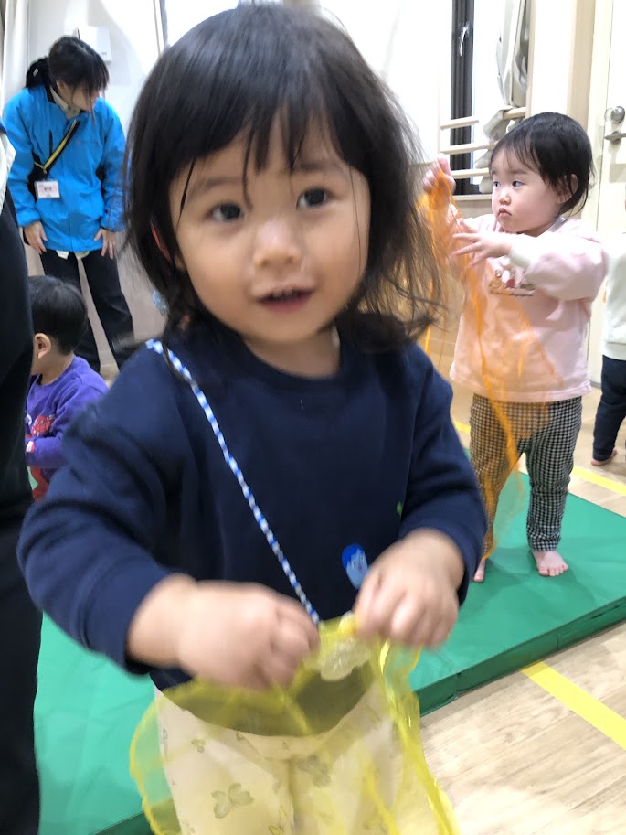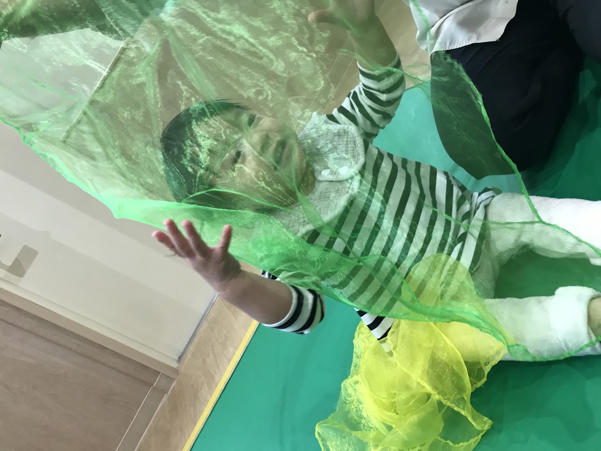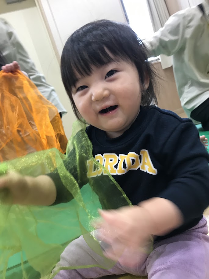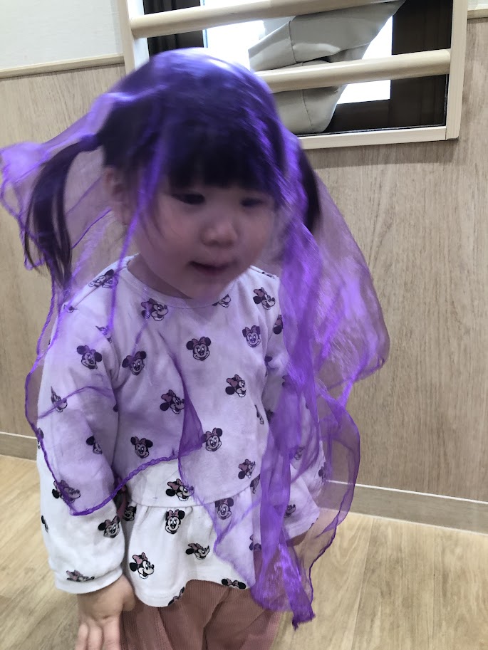 スカーフを使用した活動では、スカーフを葉っぱに見立てて風の強さの違いを表現しました!